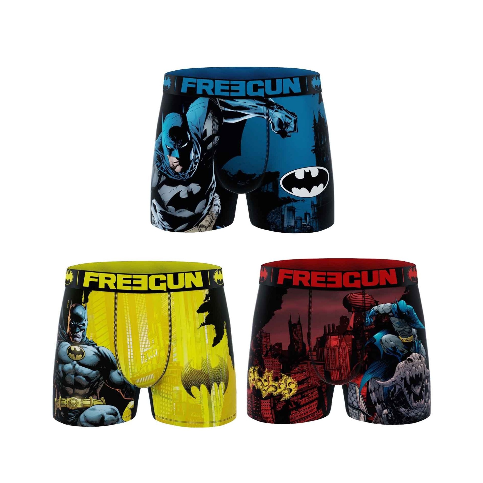 Lot de 3 boxers de la série DC Comics Justice League en collaboration avec Freegun crée des boxers pour garçon des principaux personnages de la série Batman, Joker, Robin