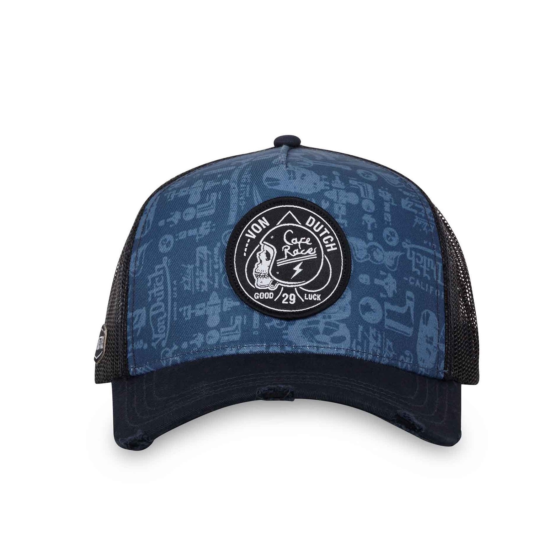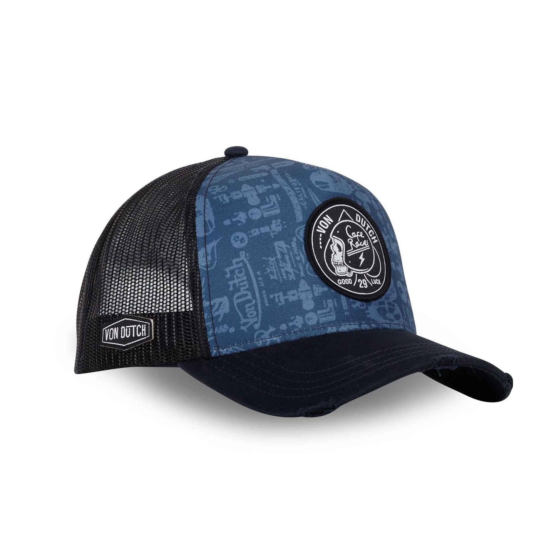 Mütze der Marke Von Dutch, Kollektion LOGOS. Herren- oder Damen-Truckermütze in blau, mit Werkzeugmotiven. Runder Patch "Von Dutch" Totenkopf Motorradhelm "Cafe Racer".Used-Effekt auf dem Schirm Schwarzes Netz. 40% Baumwolle 60% Polyester. Verstellbar durch Snapback
