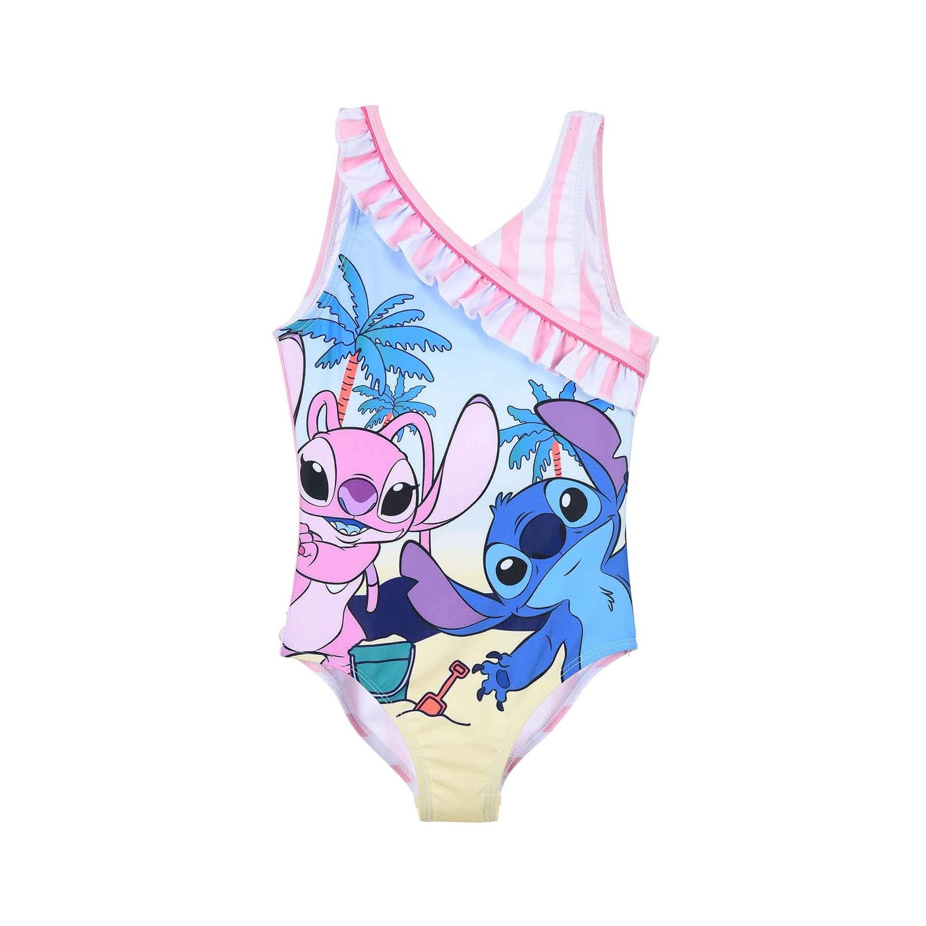 Immerse yourself in the tropical world of Lilo & Stitch with this magnificent 1-piece swimsuit for girls! Designed under official Disney license, this model combines comfort, fantasy and quality. Its colorful print features Stitch and Angel on a sunny beach, for a fun and stylish vacation. The asymmetrical cut with flounce adds an irresistible girly touch, while the stretch fabric ensures a perfect fit.