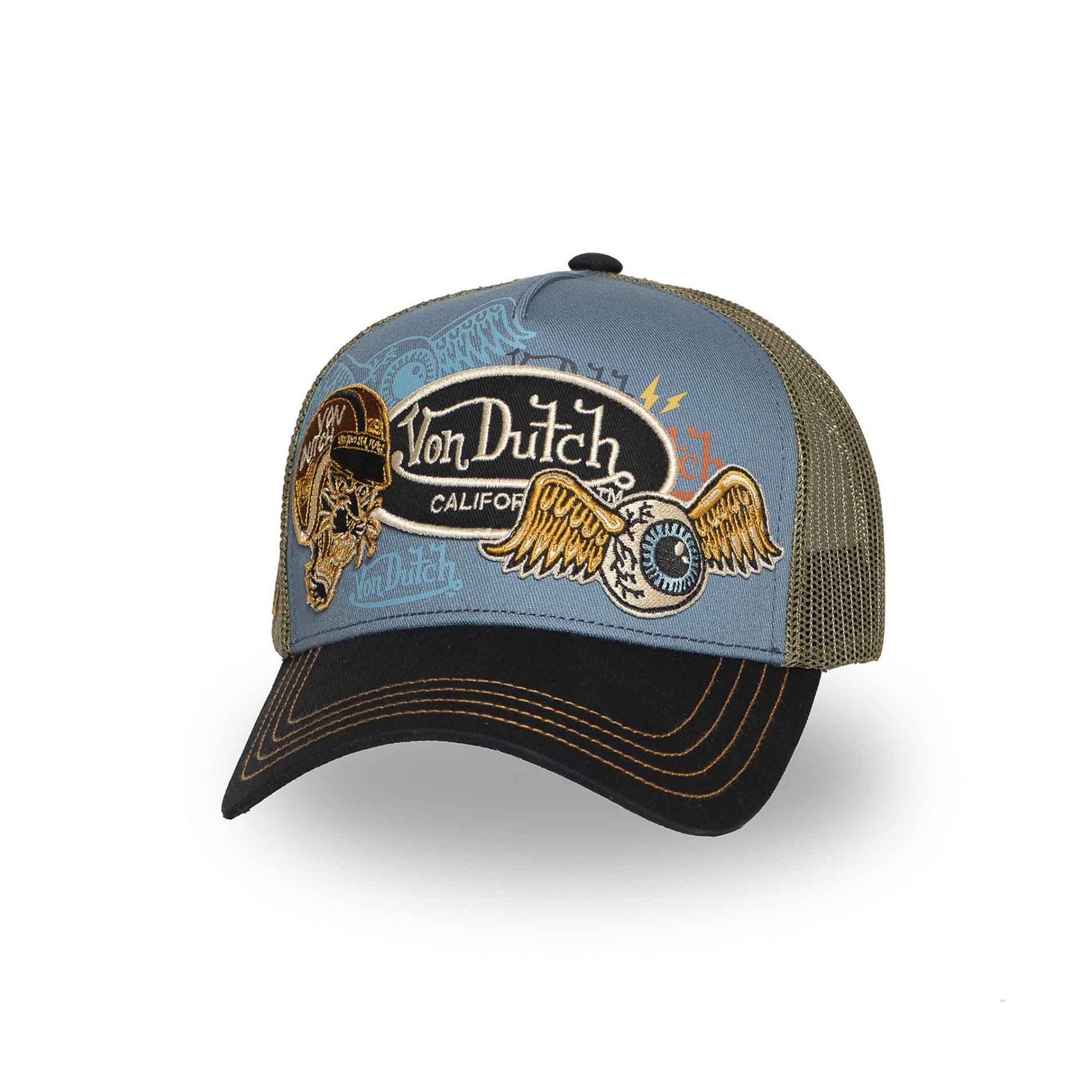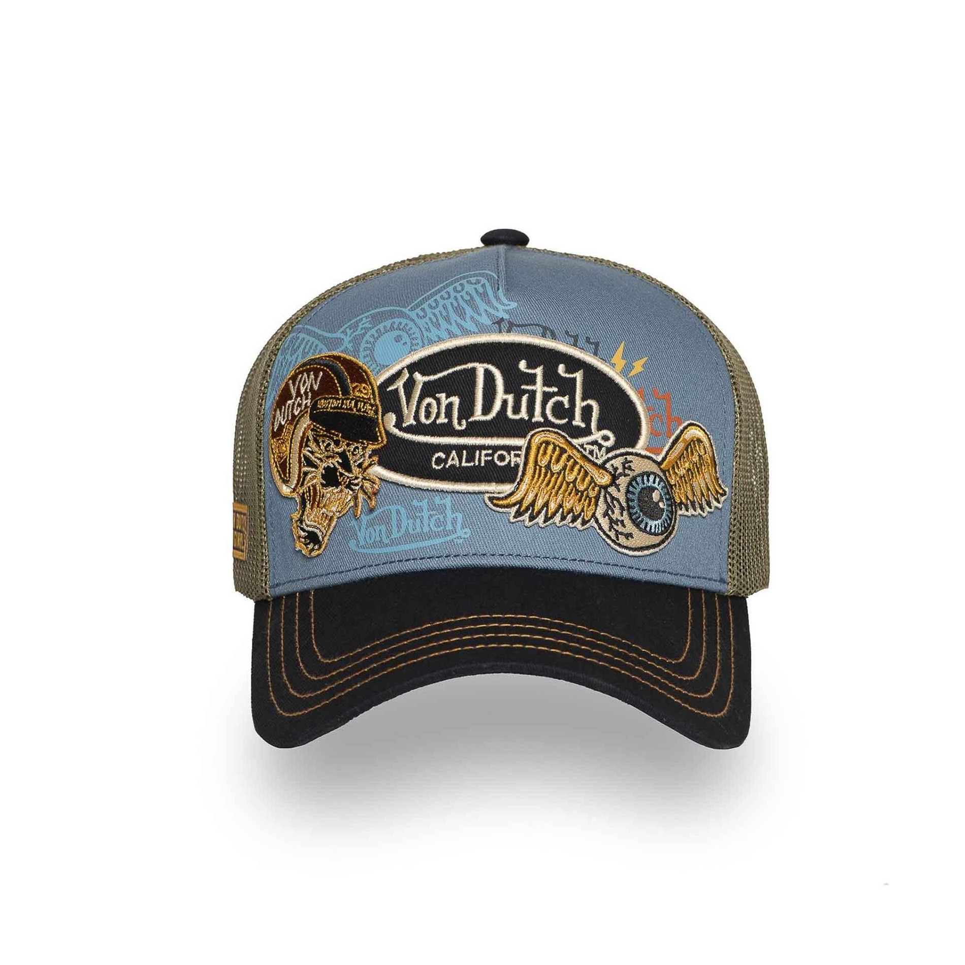 Bordado en relieve: motivos emblemáticos de Von Dutch como el ojo alado y la cabeza de tigre.