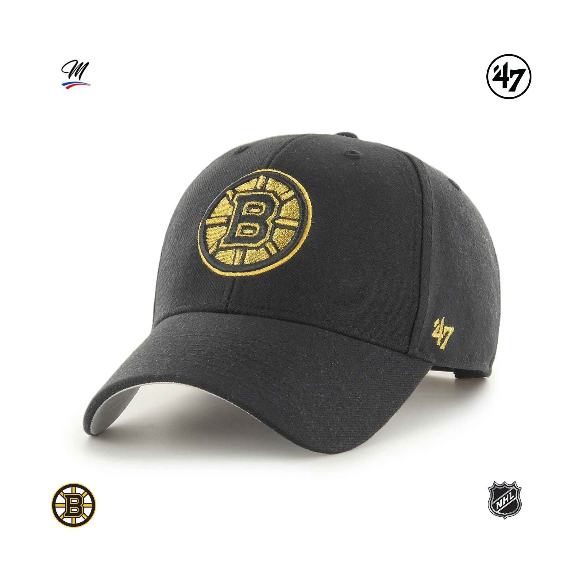 The NHL Metallic Snap MVP '47 Boston Bruins cap is a structured, curved field hockey cap with embossed embroidery on the front and '47 embroidery on the side. Adjustable with snapback at back. 85% Acrylic and 15% Wool.