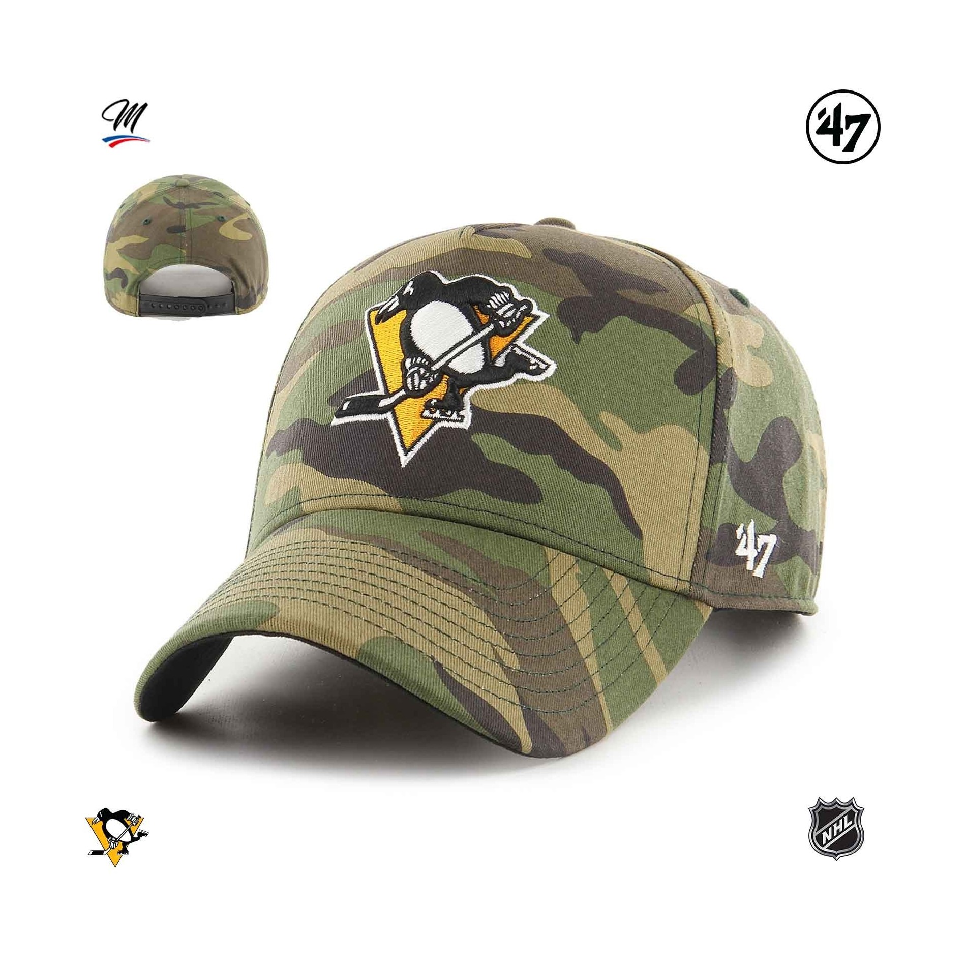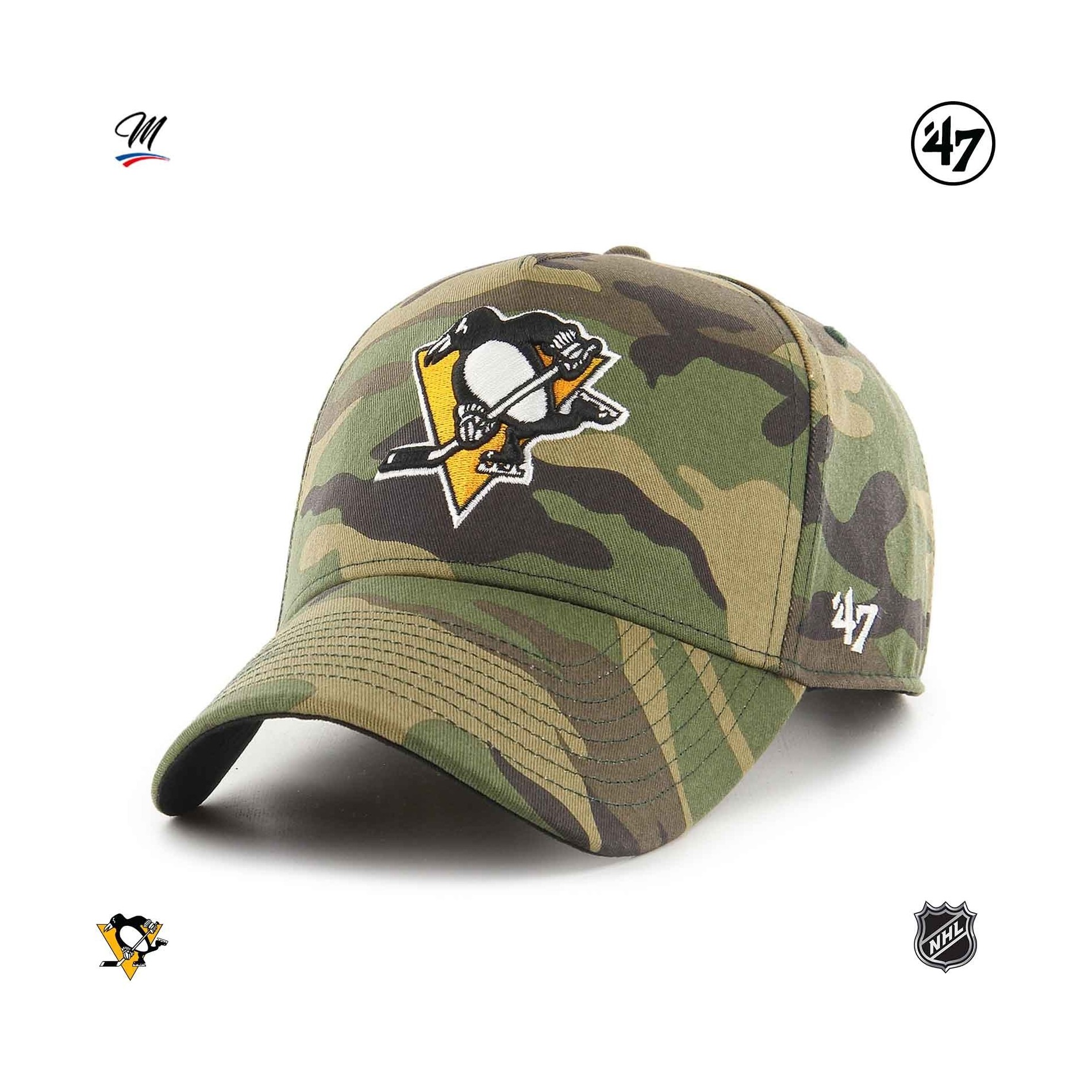 Il cappellino '47 NHL "Grove Snapback MVP Camo" Pittsburgh Penguins è un cappellino HOCKEY mimetico in 100% cotone, strutturato e curvo, con ricamo in rilievo sul davanti e ricamo '47 sul lato.