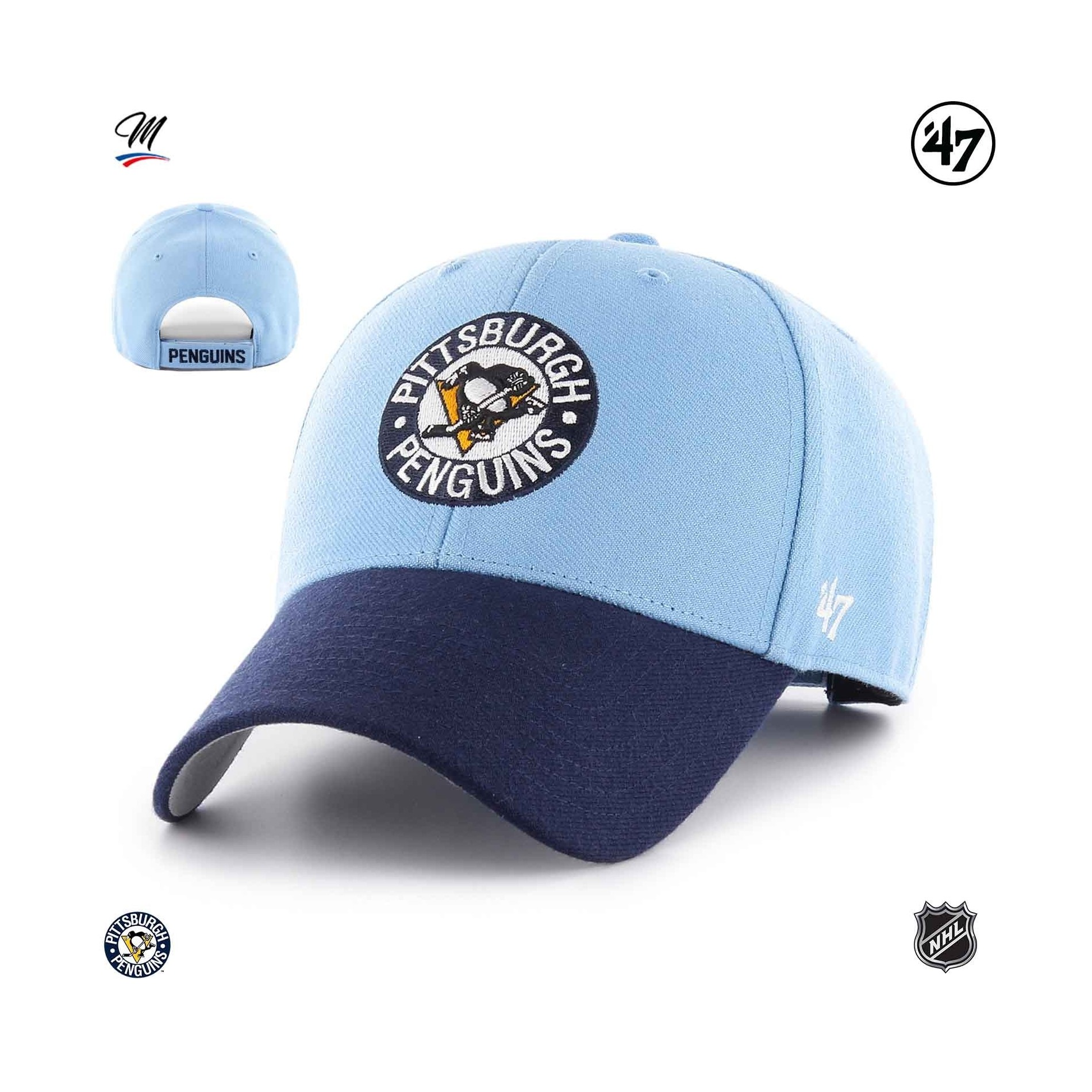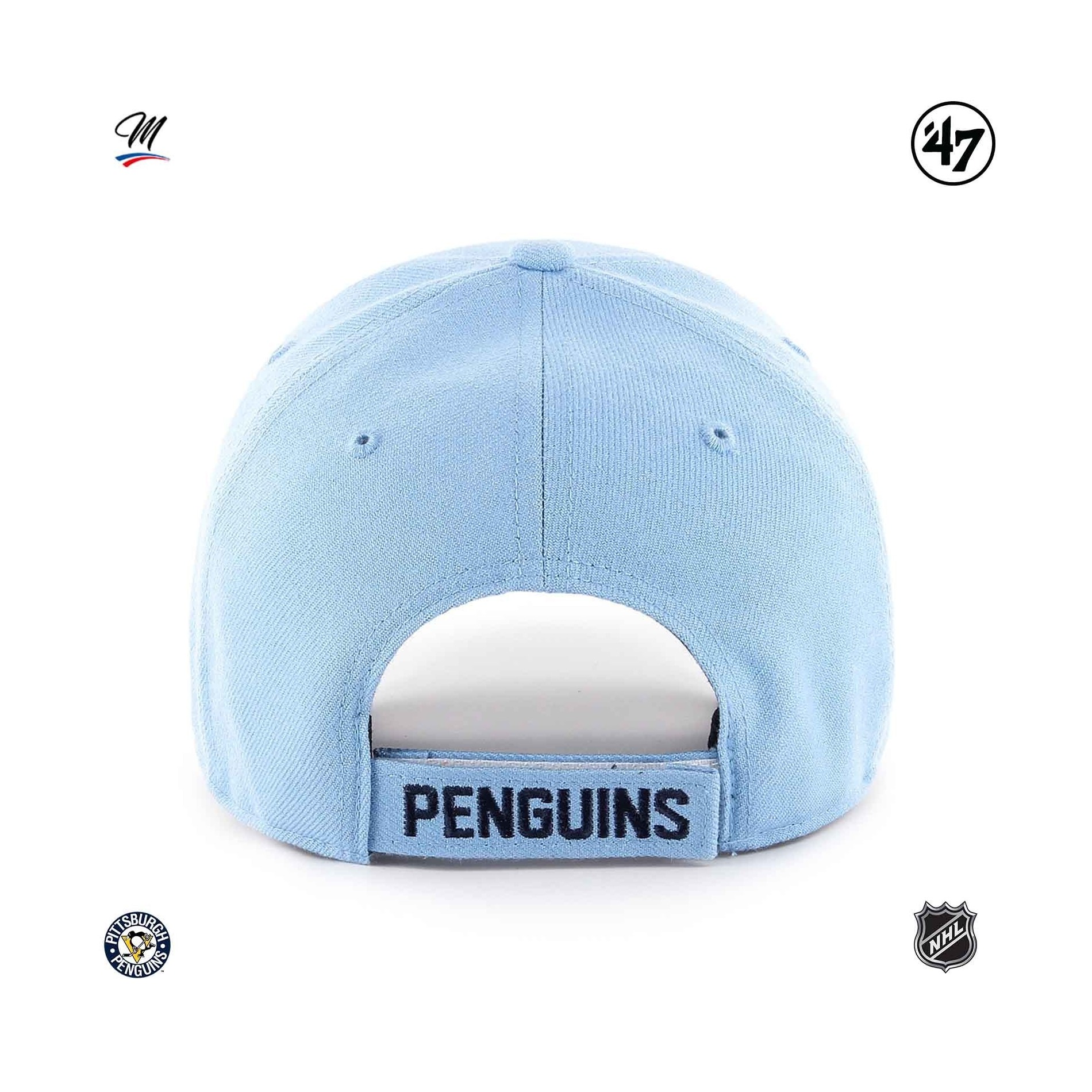 De '47 NHL "Vintage Logo MVP" Pittsburgh Penguins cap is een gestructureerde, gebogen ijshockeypet met reliëfborduursel op de voorkant, '47 borduursel op de zijkant en een klittenbandsluiting op de achterkant.