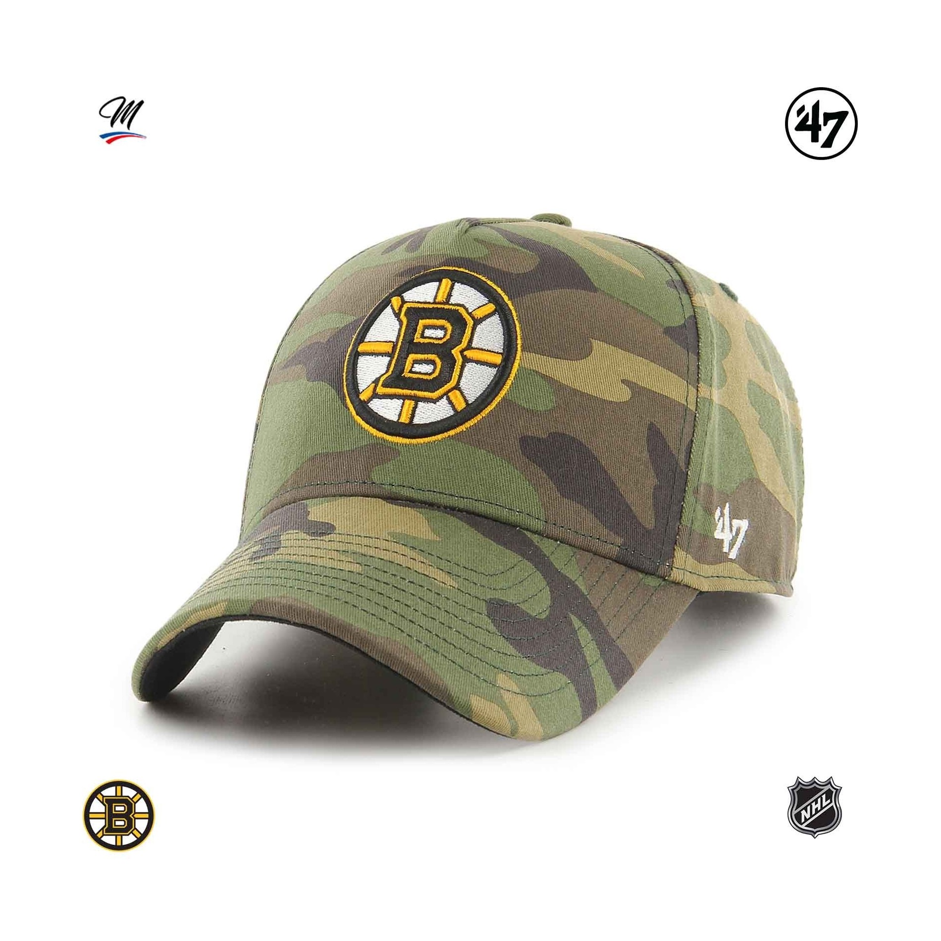 De '47 NHL Grove Snapback MVP Camo Cap Boston Bruins is een 100% katoenen camouflage baseball cap, gestructureerd en gebogen, met verhoogd borduursel op de voorkant en '47 borduursel op de zijkant.