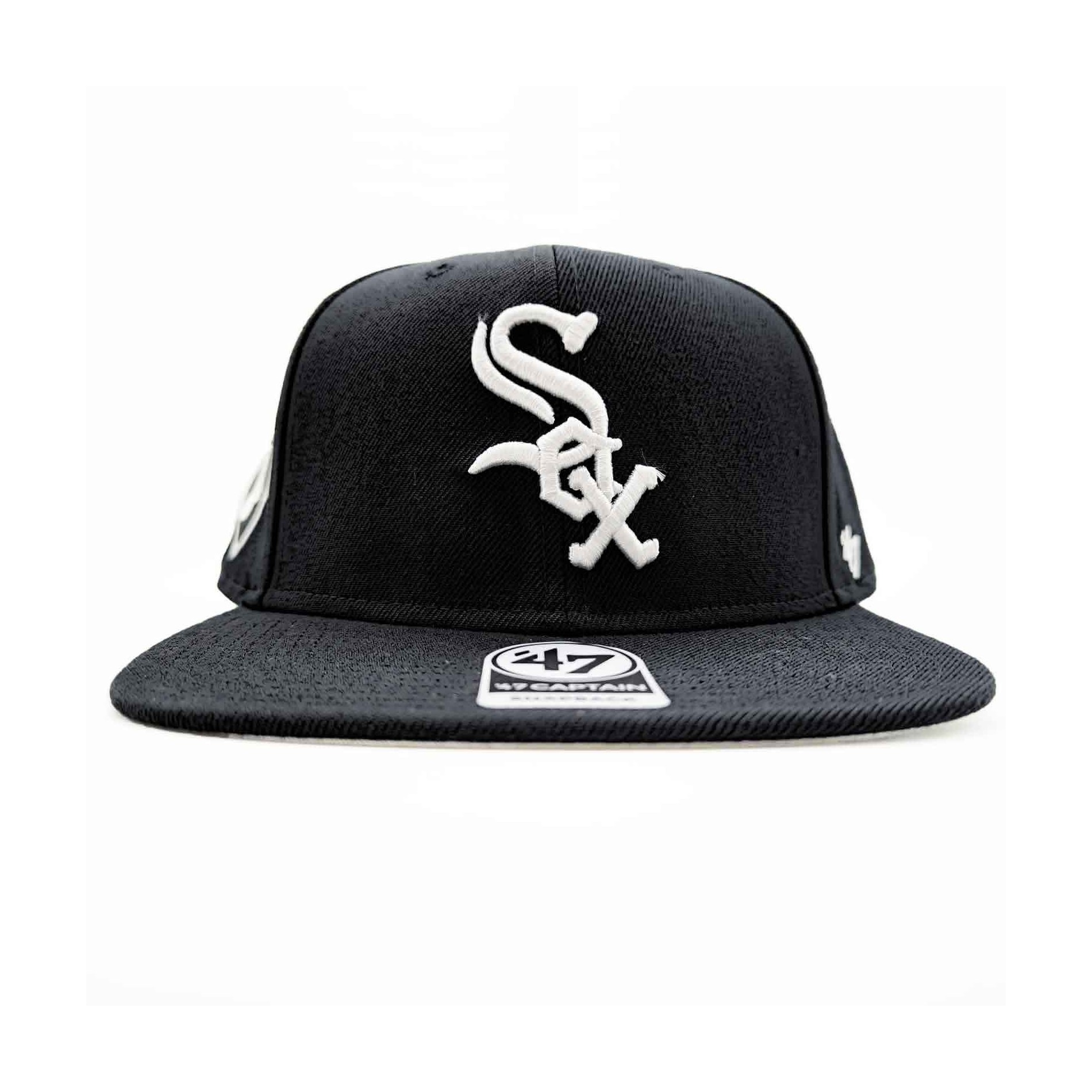 De Chicago White Sox '47 Sure Shot Captain Collection pet is een gestructureerde baseballpet met een platte klep, geborduurd in reliëf op de voorkant en '47 geborduurd op de zijkant.
