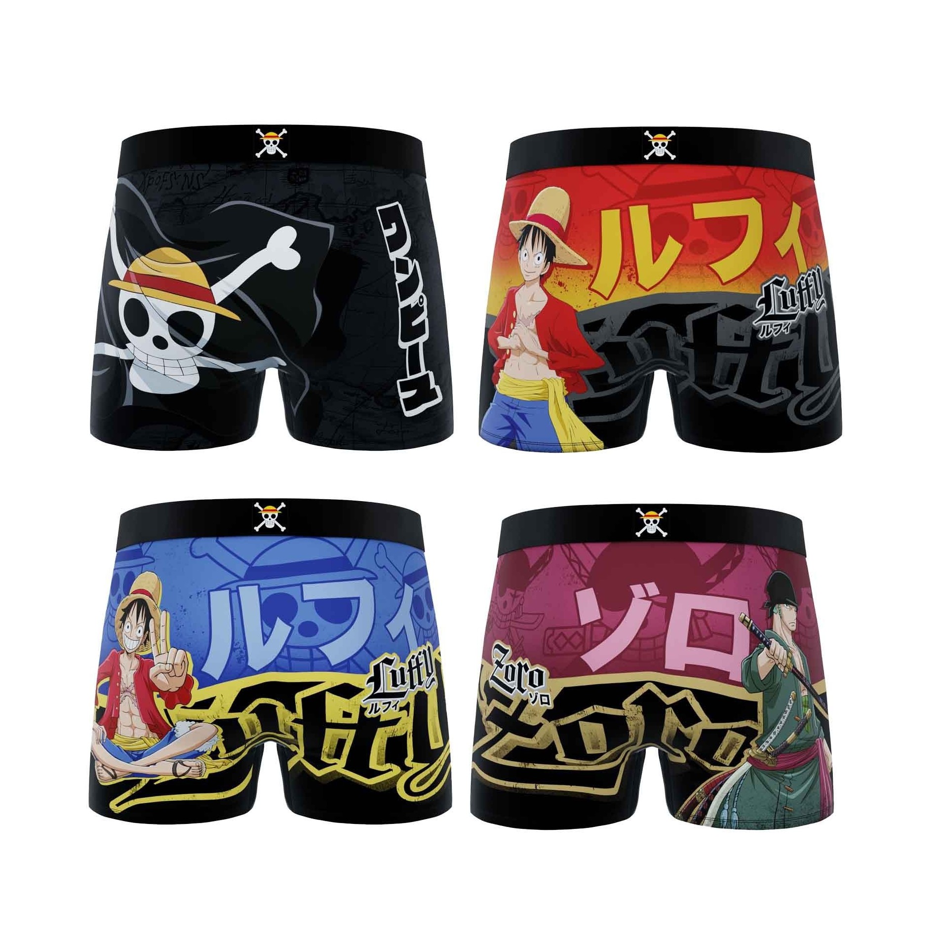 Model: Set van 4 One Piece herenboxershorts met Luffy, Zoro en de vlag van de Straw Hat Crew.