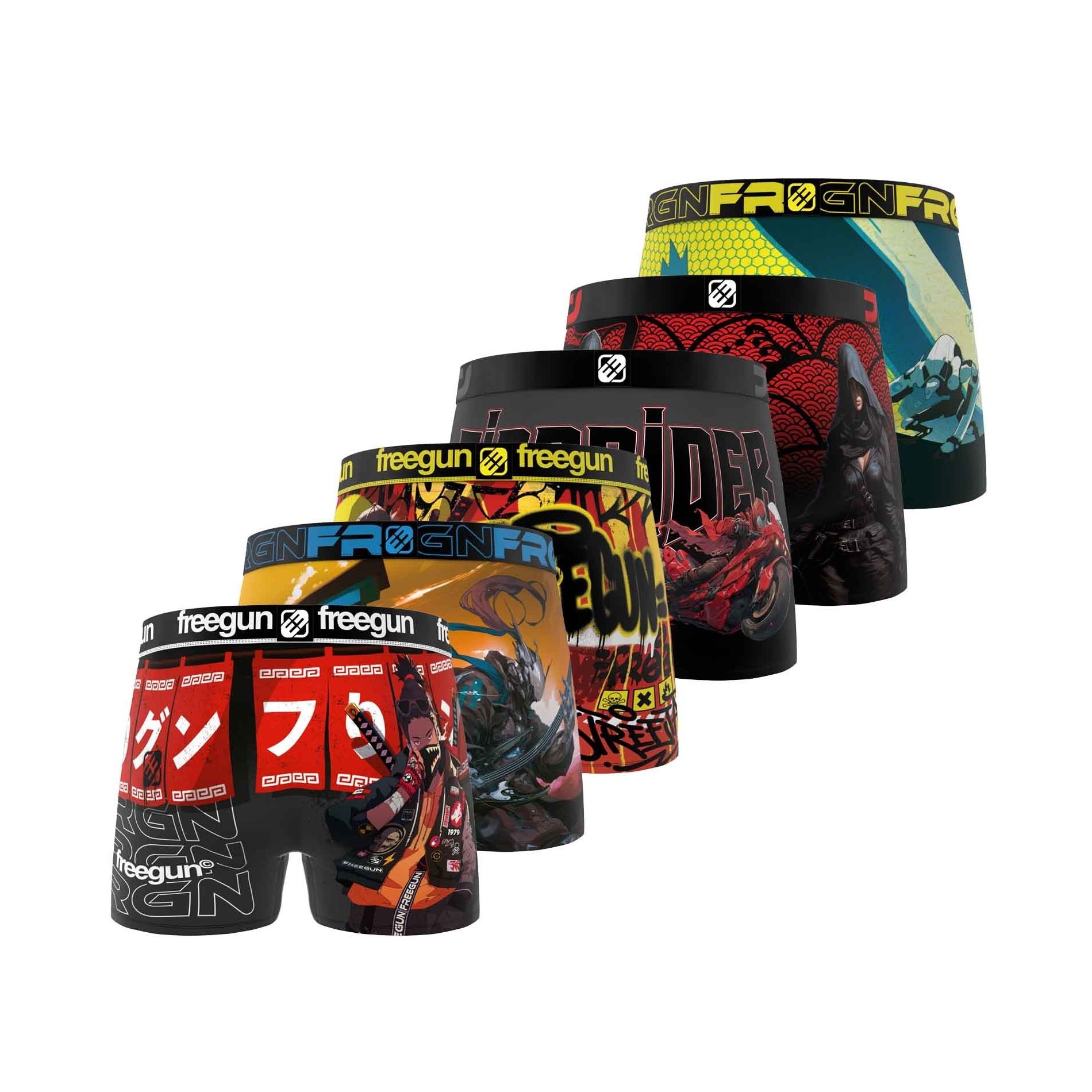 Duik in de wereld van futuristische streetwear met dit pakket van 6 "Street Futur Robot" boxers voor heren Freegun. Geïnspireerd door de werelden van cyberpunk, manga en robotica, combineert dit ondergoed origineel design met ultiem comfort. Elke boxer heeft een unieke print: urban graffiti, moderne samoerai, futuristische robots, vurige motoren en gestileerde mechanische werelden.