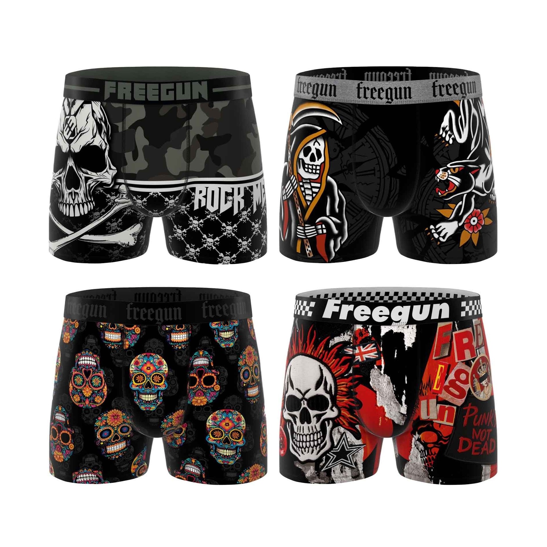 Freegun Set van 4 boxershorts met doodshoofd en gekruiste botten voor jongens. Prachtig ontwerp en zeer comfortabel. 92% Polyester 8% Elastaan Voering: 100% Katoen.