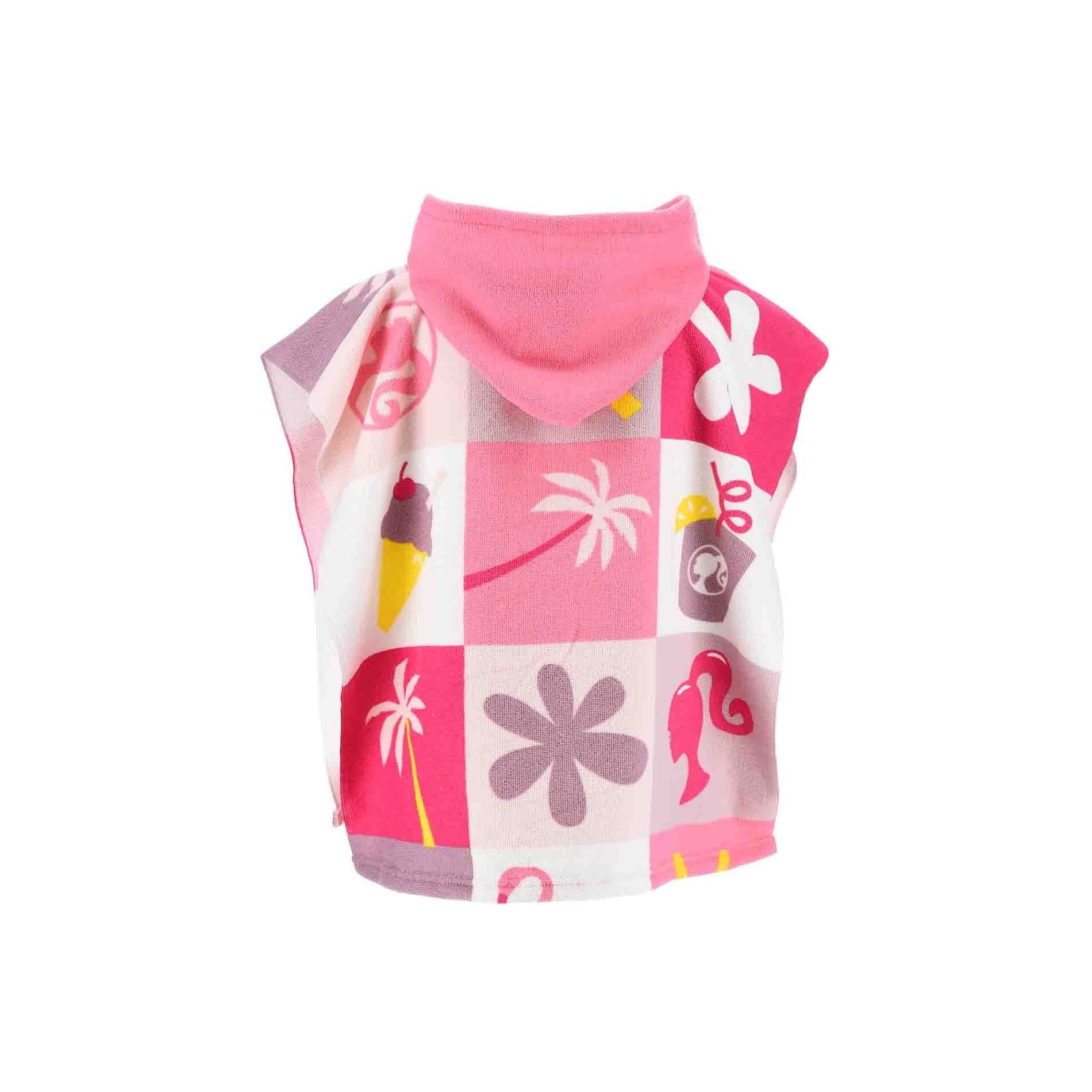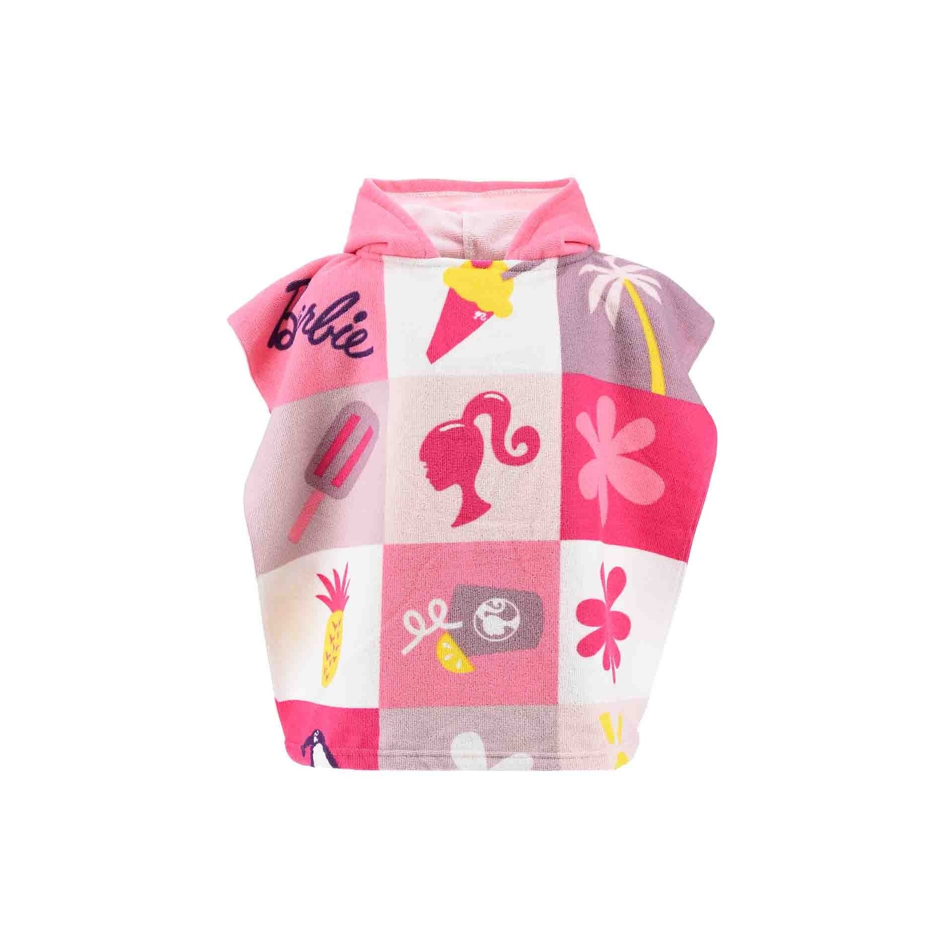 Dyk in i Barbies roliga och färgglada värld med denna ultraflickiga badcape med huva! Capen är perfekt för små fashionistas och är dekorerad med sommarmotiv och den ikoniska Barbie-silhuetten i en palett av rosa, lila och gula färger. Den följer med barnen på alla deras vattenäventyr, från stranden till badkaret.