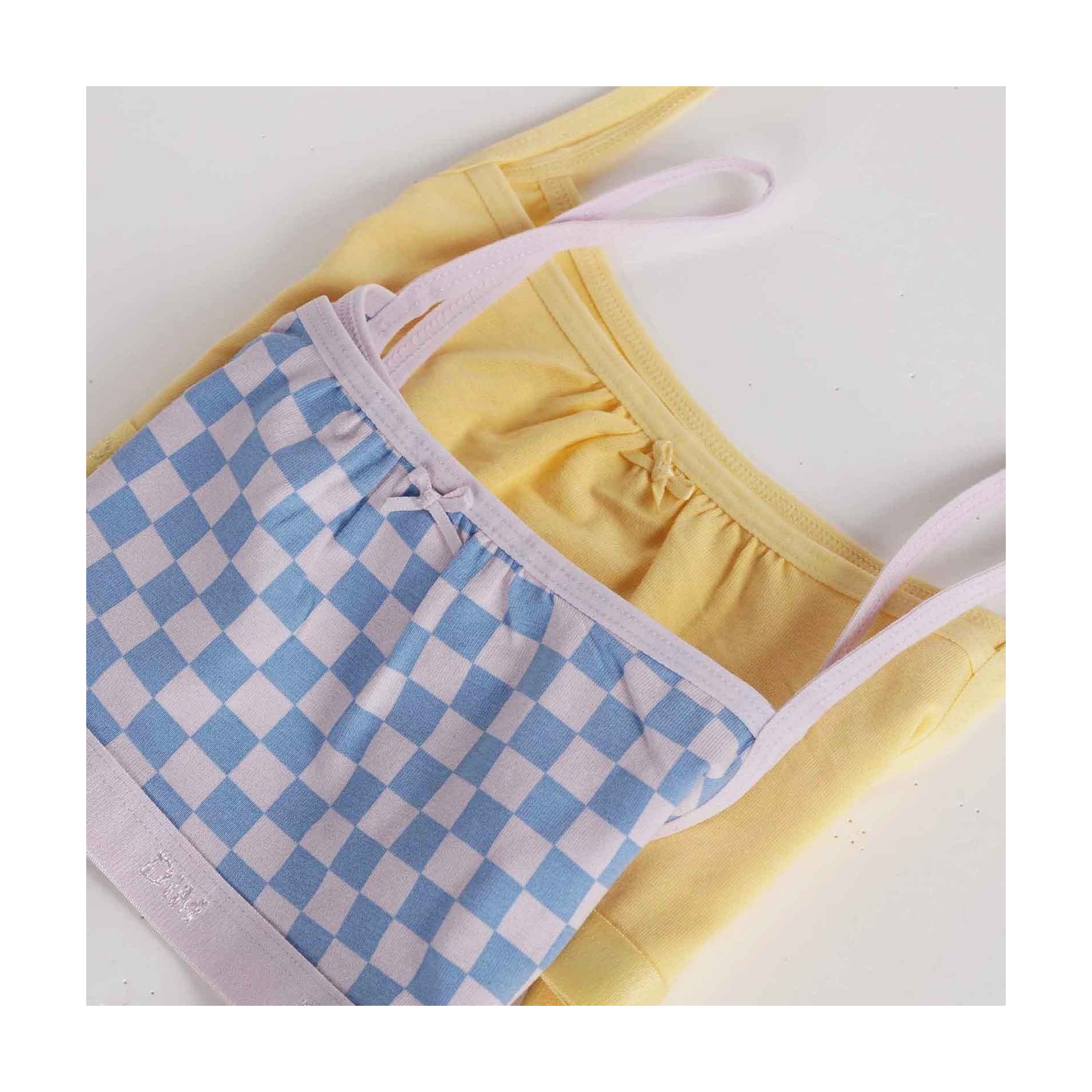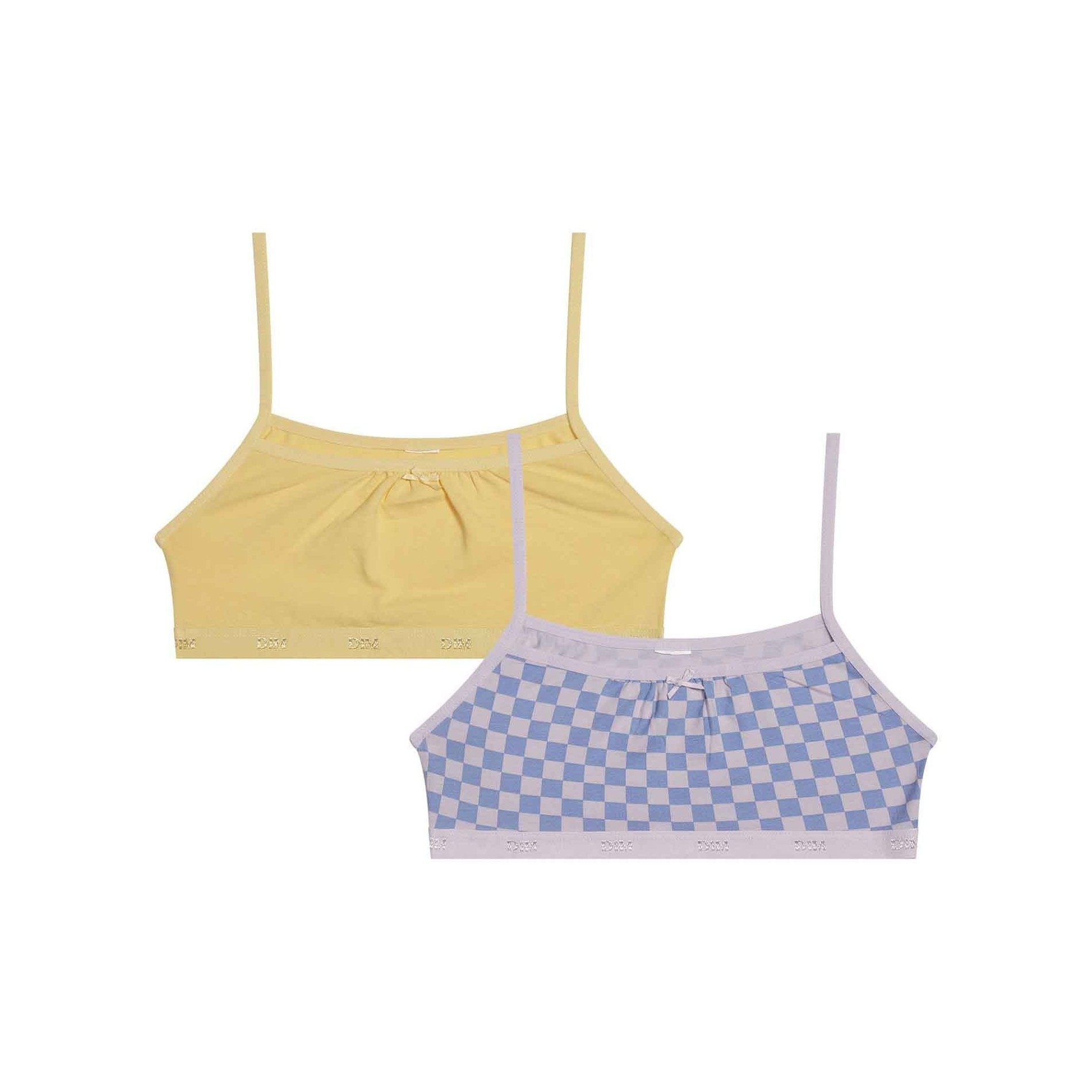 Set med 2 st Girls Stretch Cotton BHs från DIM-kollektionen "Les Pockets". Mycket bekväma, vacker finish med en liten rosett, diskreta färger och originell design. 95 % bomull, 5 % elastan