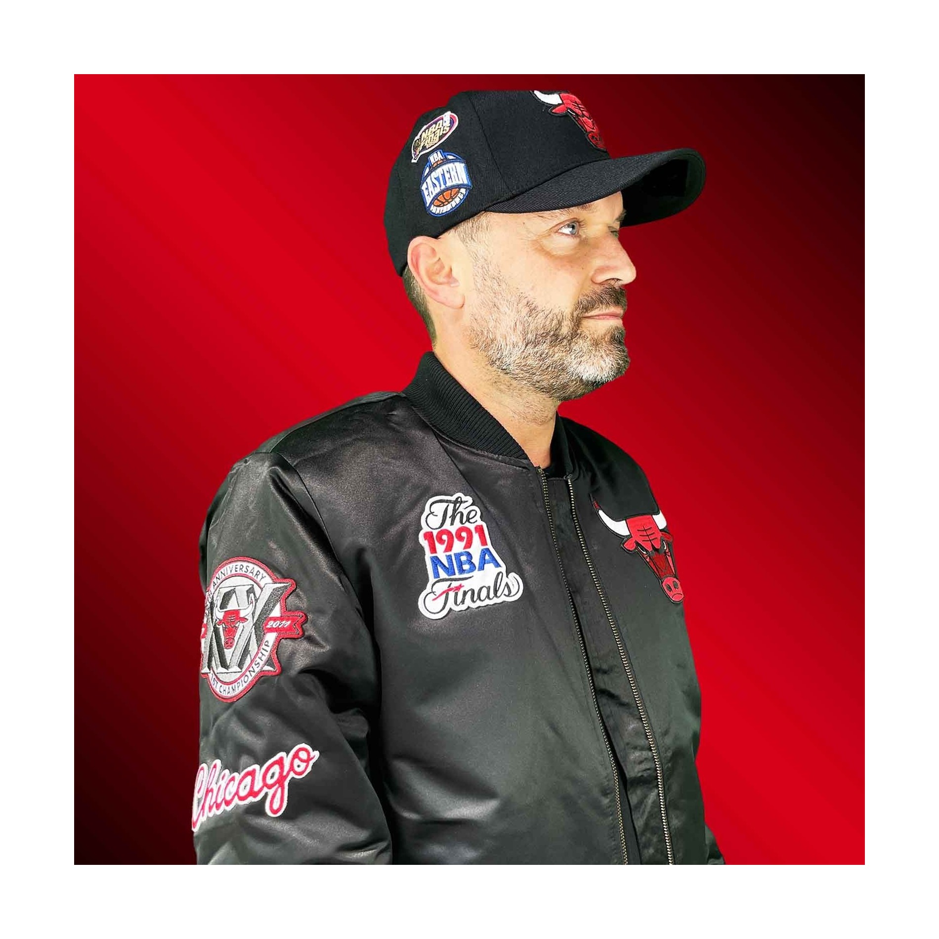 Satin Bomber Jacket NBA Flight Chicago Bulls, den här svarta jackan är överdådig med sina lappar, vilket ger dig en look som är utöver det vanliga.