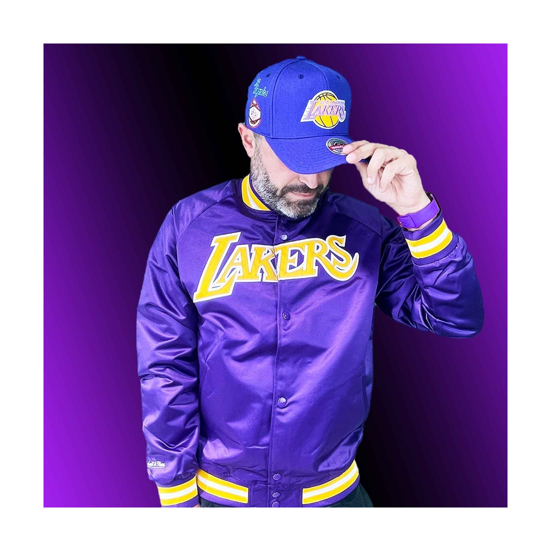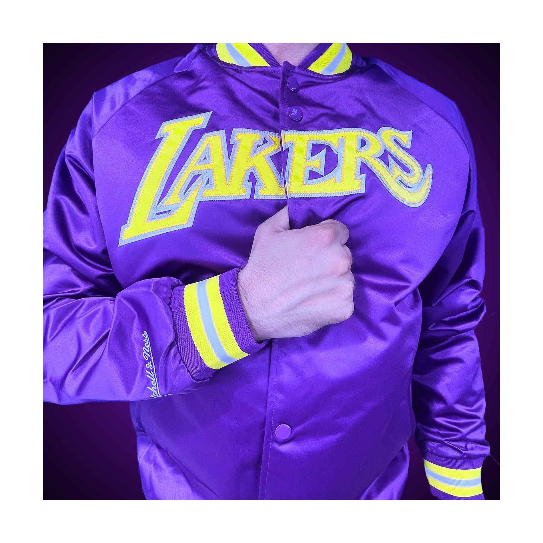 Satin NBA Lightweight Los Angeles Lakers Bomber Jacket med broderad LAKERS-logotyp i mitten. Tryckknappsfäste, 2 sidofickor. 100% Polyester