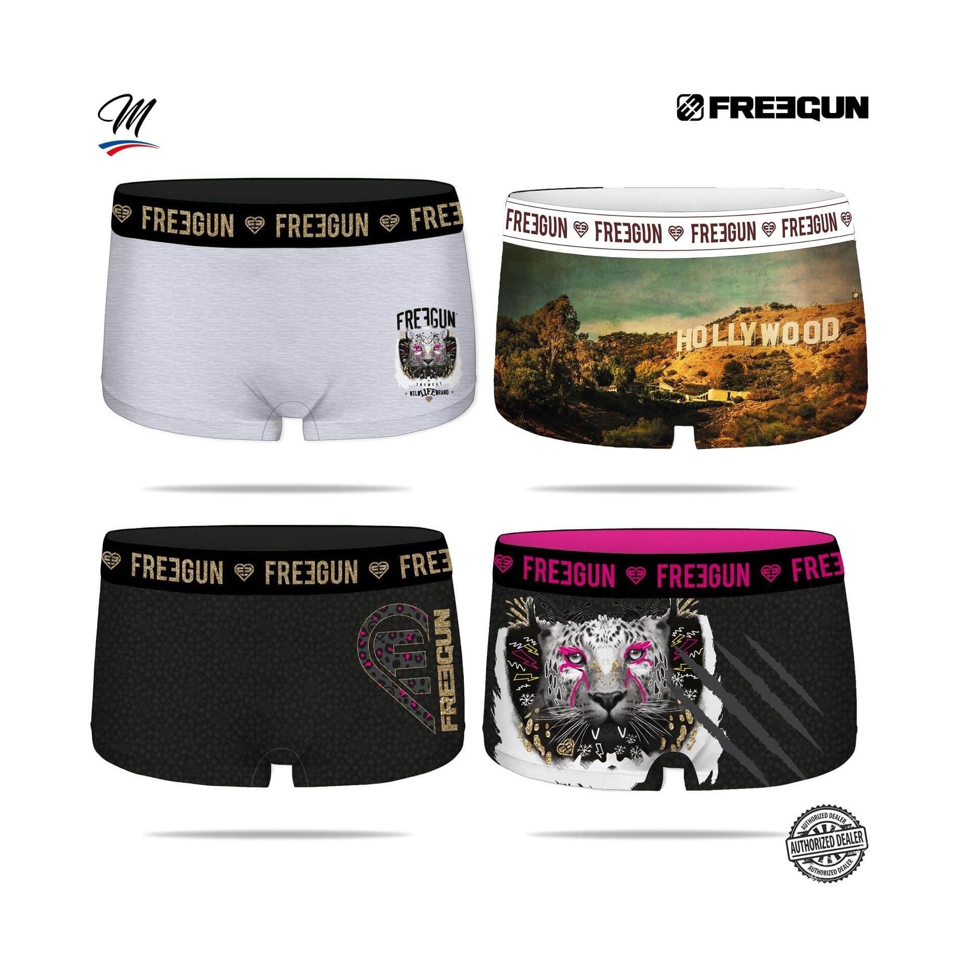 Set med 4 FREEGUN-kortbyxor för flickor, med pantrar och Hollywoodmotiv, de är extremt bekväma. 92 % polyester och 8 % elastan