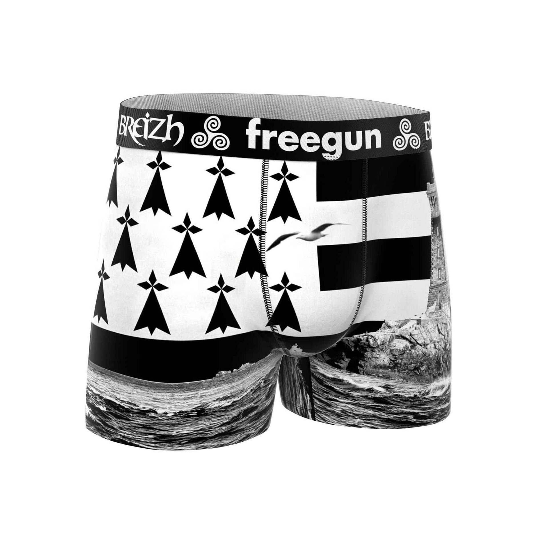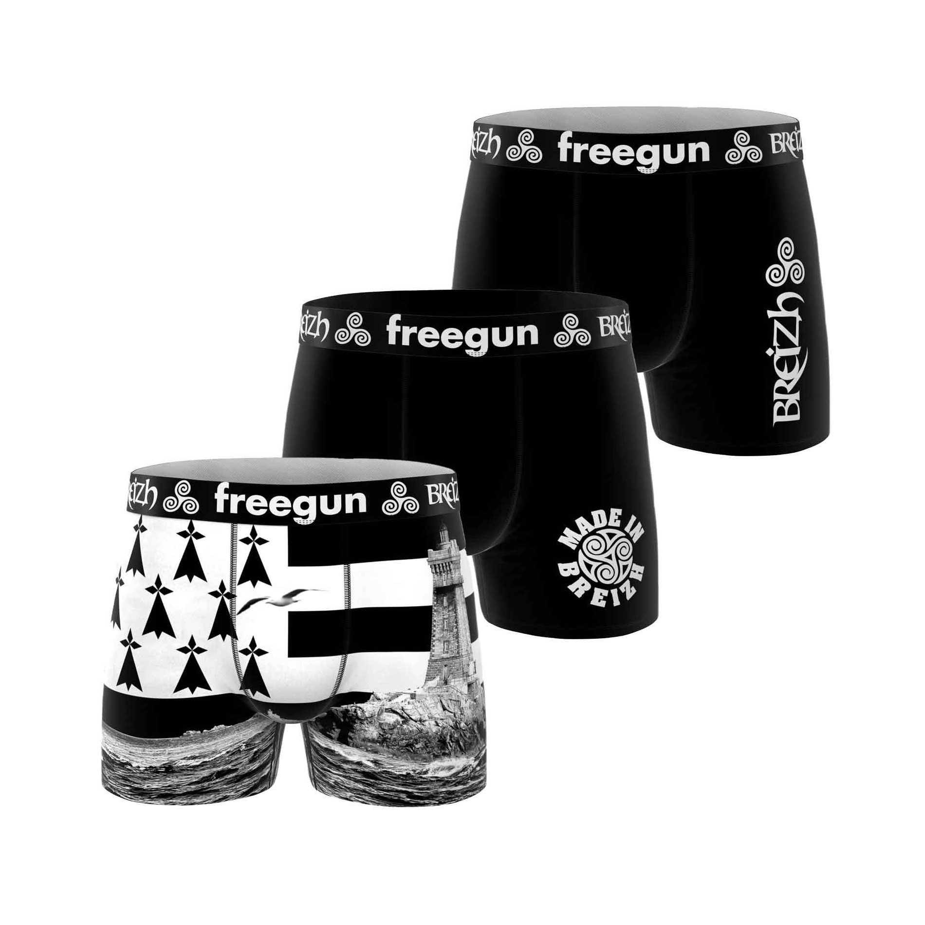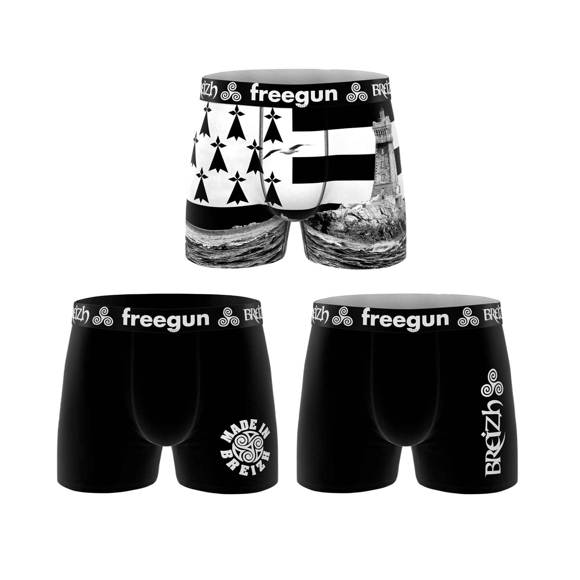 Set med 3 FREEGUN mikrofiberskalsonger för män med tema "Bretagne". Insamlingsregion i Frankrike, med Bretagne. 92% polyester, 8% elastan
