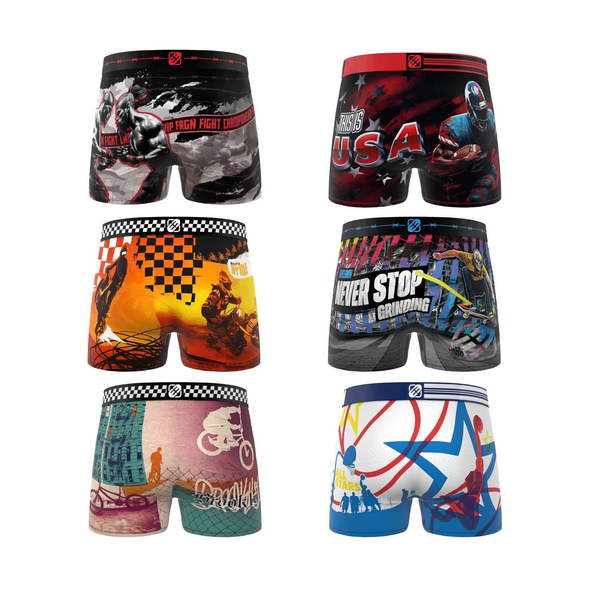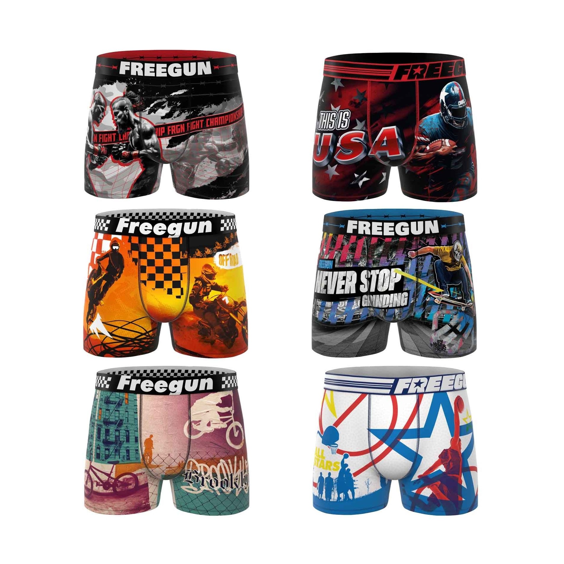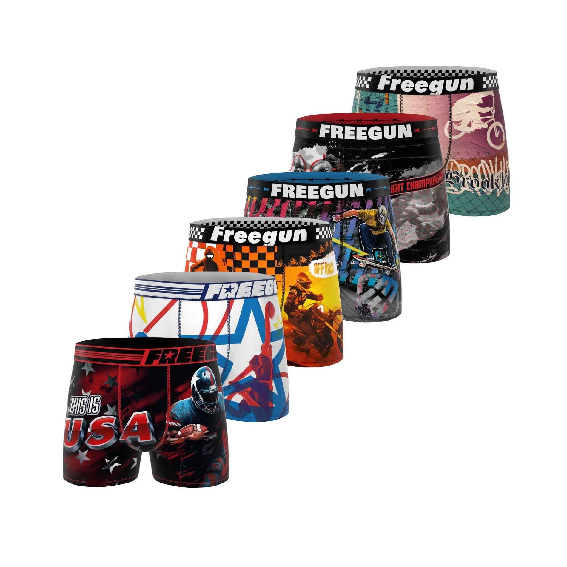 Samling av 6 boxershorts för män Freegun Extreme Sport, boxershorts med bilder av extrema sporter som motocross, fotboll, skateboarding, snowboarding, streetball osv.
