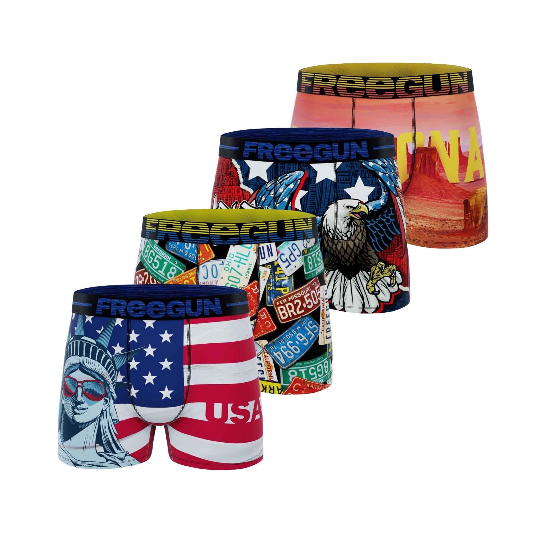 Set om 4 FREEGUN herrkalsonger i mikrofiber med "USA"-tema. 92% polyester, 8% elastan, foder i 100% bomull