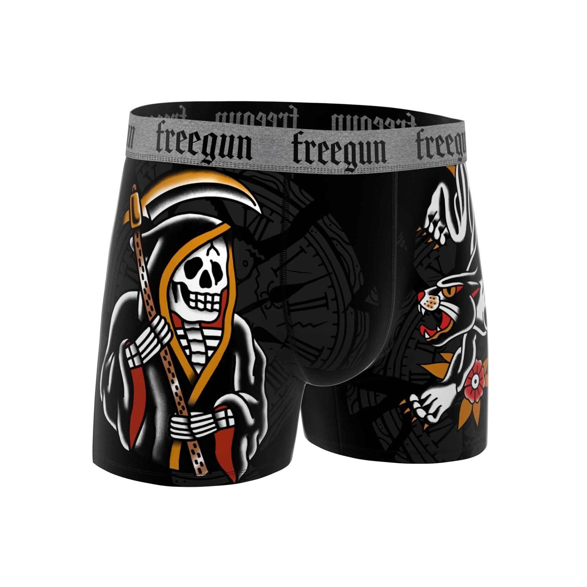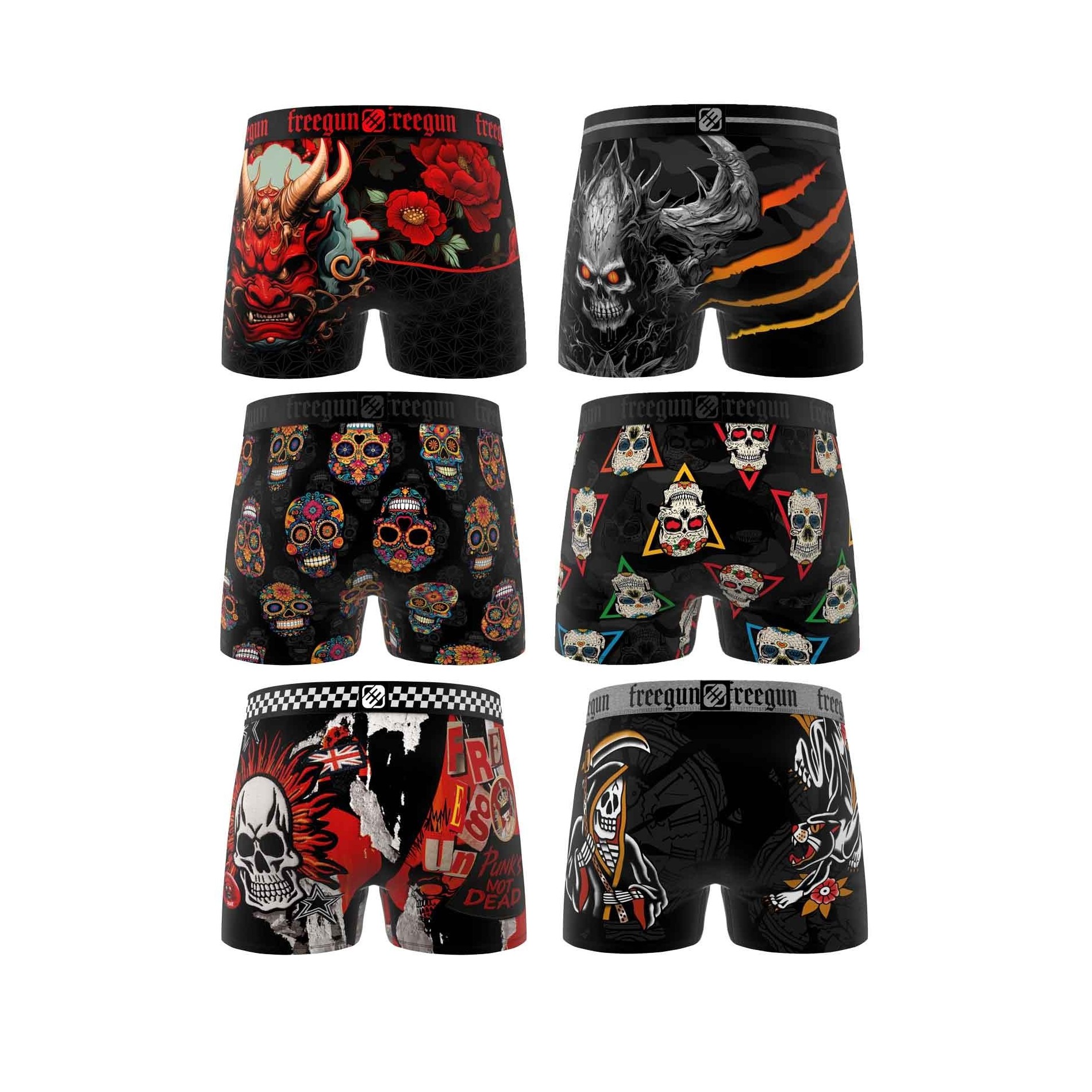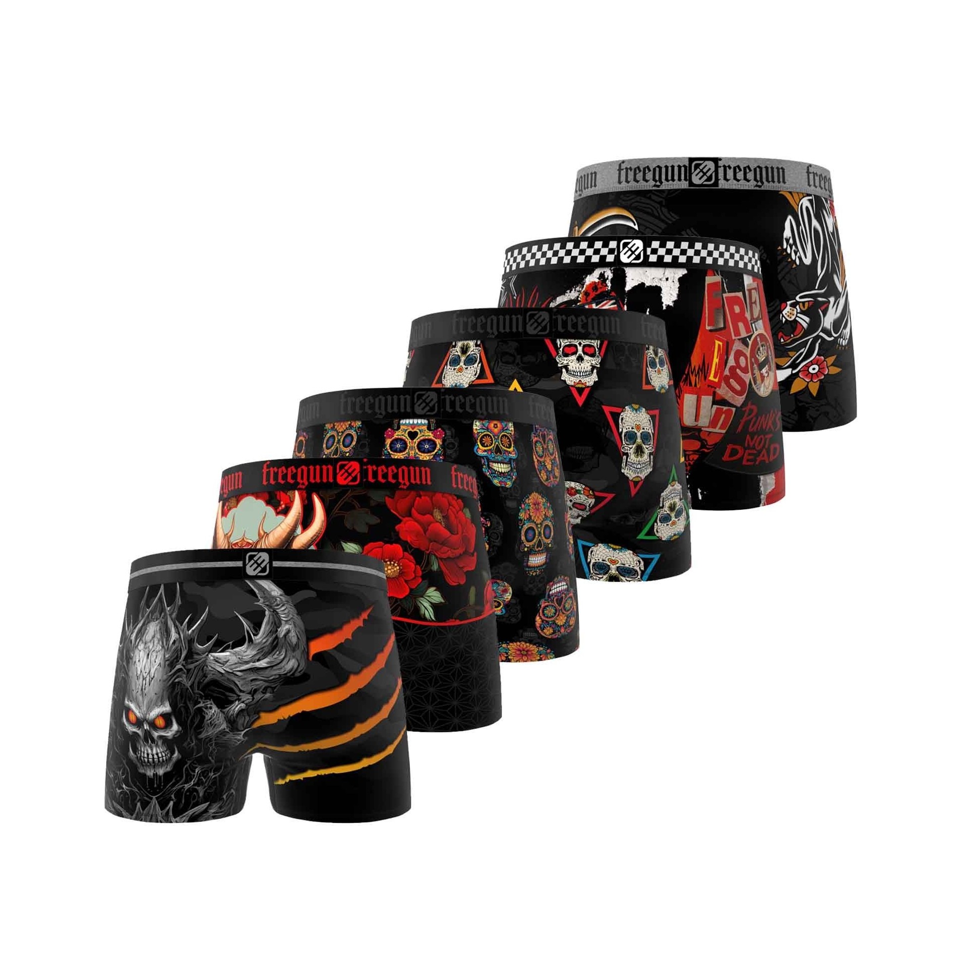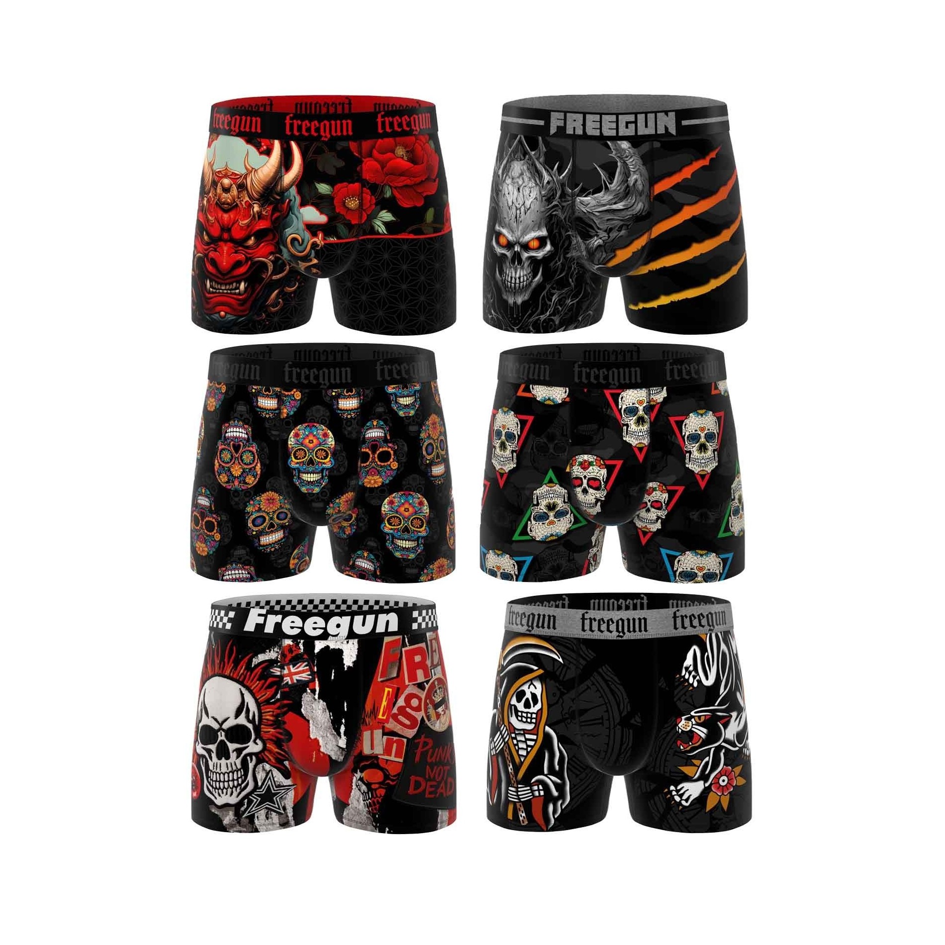 Uttryck din djärva stil med detta set om 6 boxershorts för herr från FREEGUN. Varje par har en unik design inspirerad av rock'n'roll-världen, tatueringar och dödskallar. Detta set är perfekt för fans av alternativt mode och innehåller allt från legendariska drakar och dödskallar till originella tatueringar. Boxershortsen är tillverkade av ultrabekväm mikrofiber och har perfekt passform, långvarig komfort och en stil som inte går obemärkt förbi.