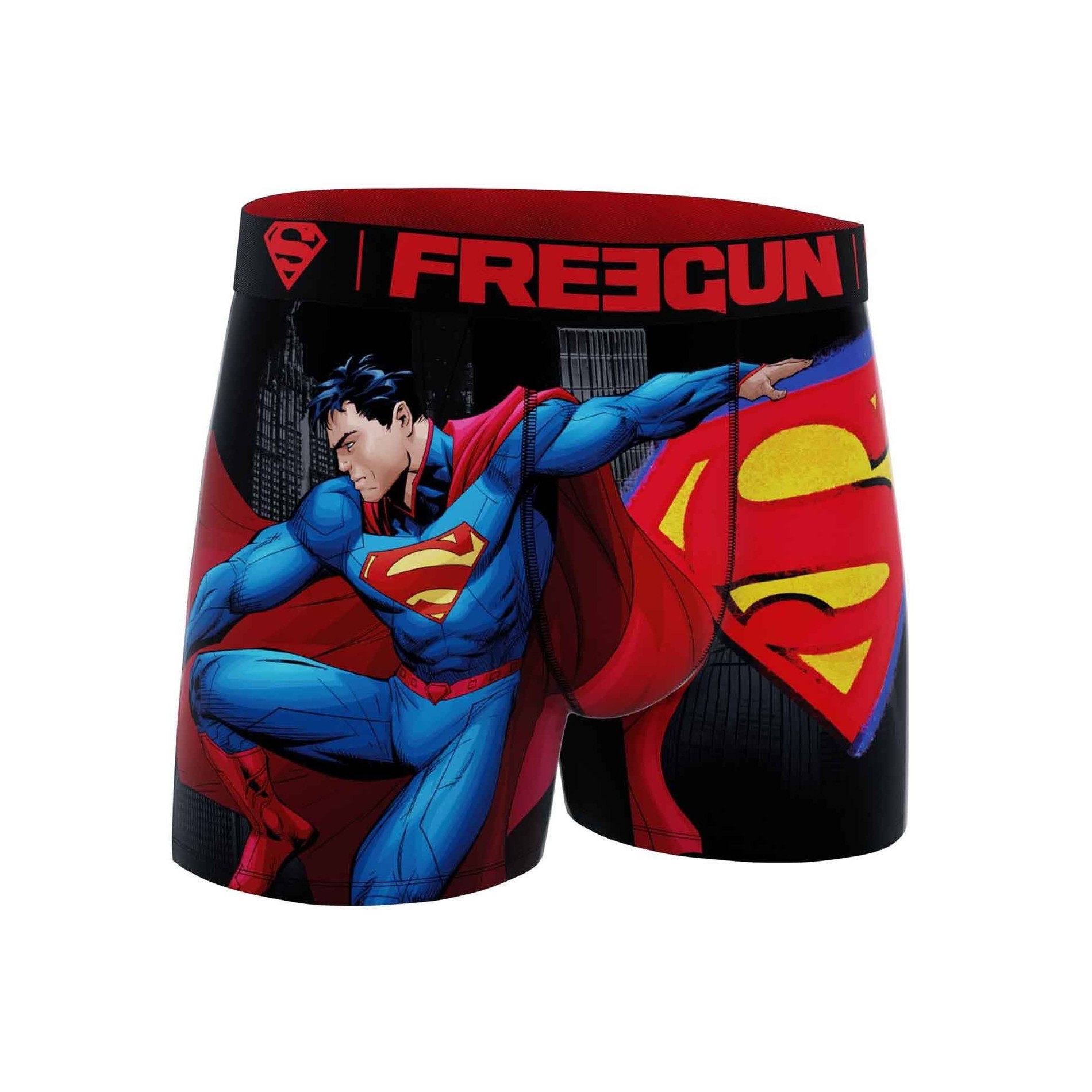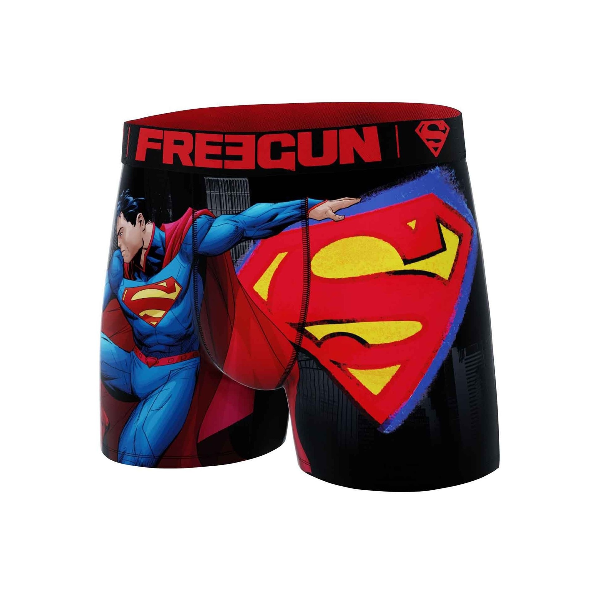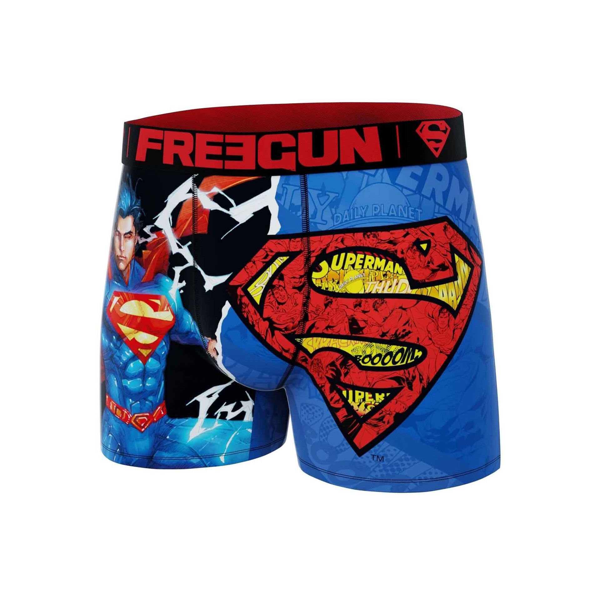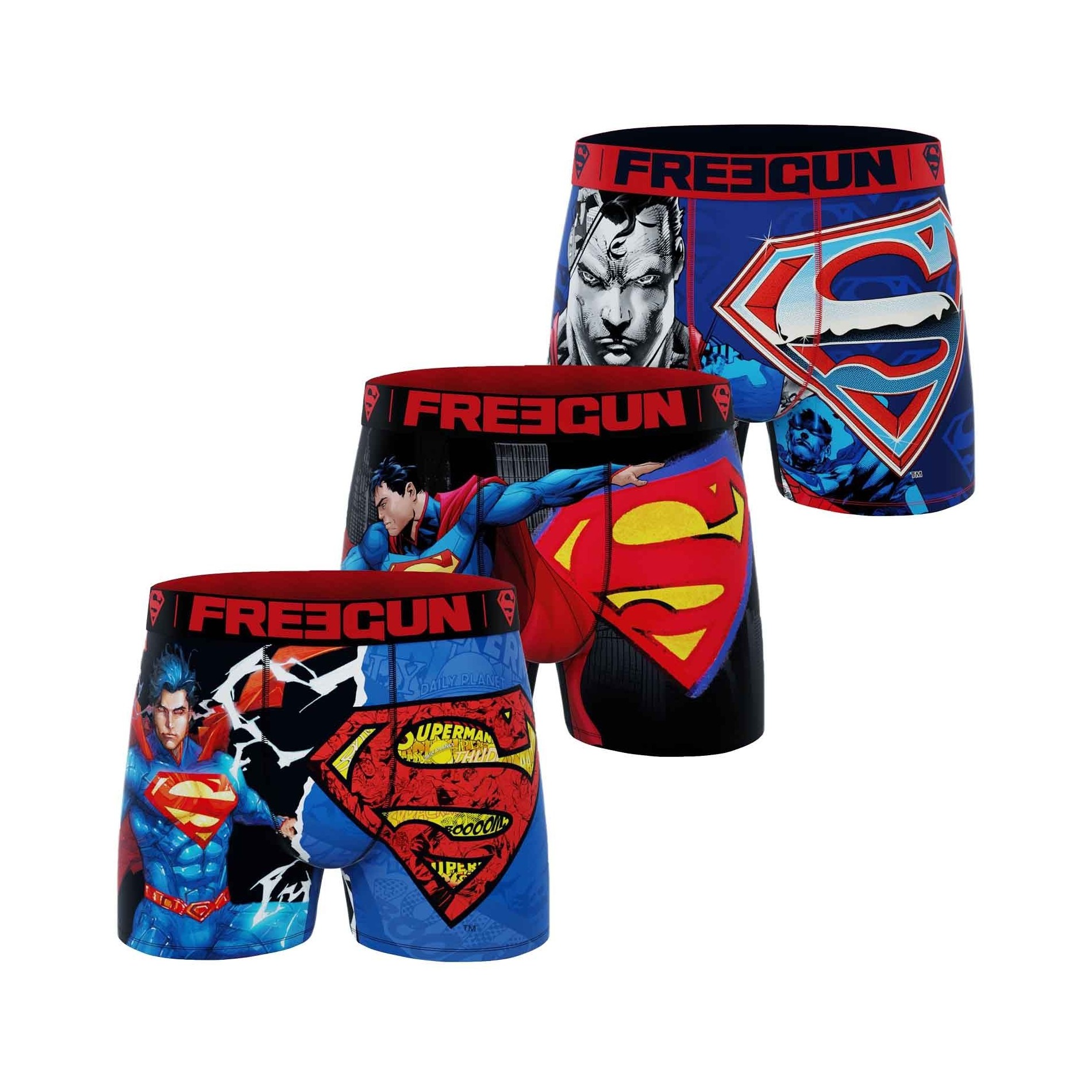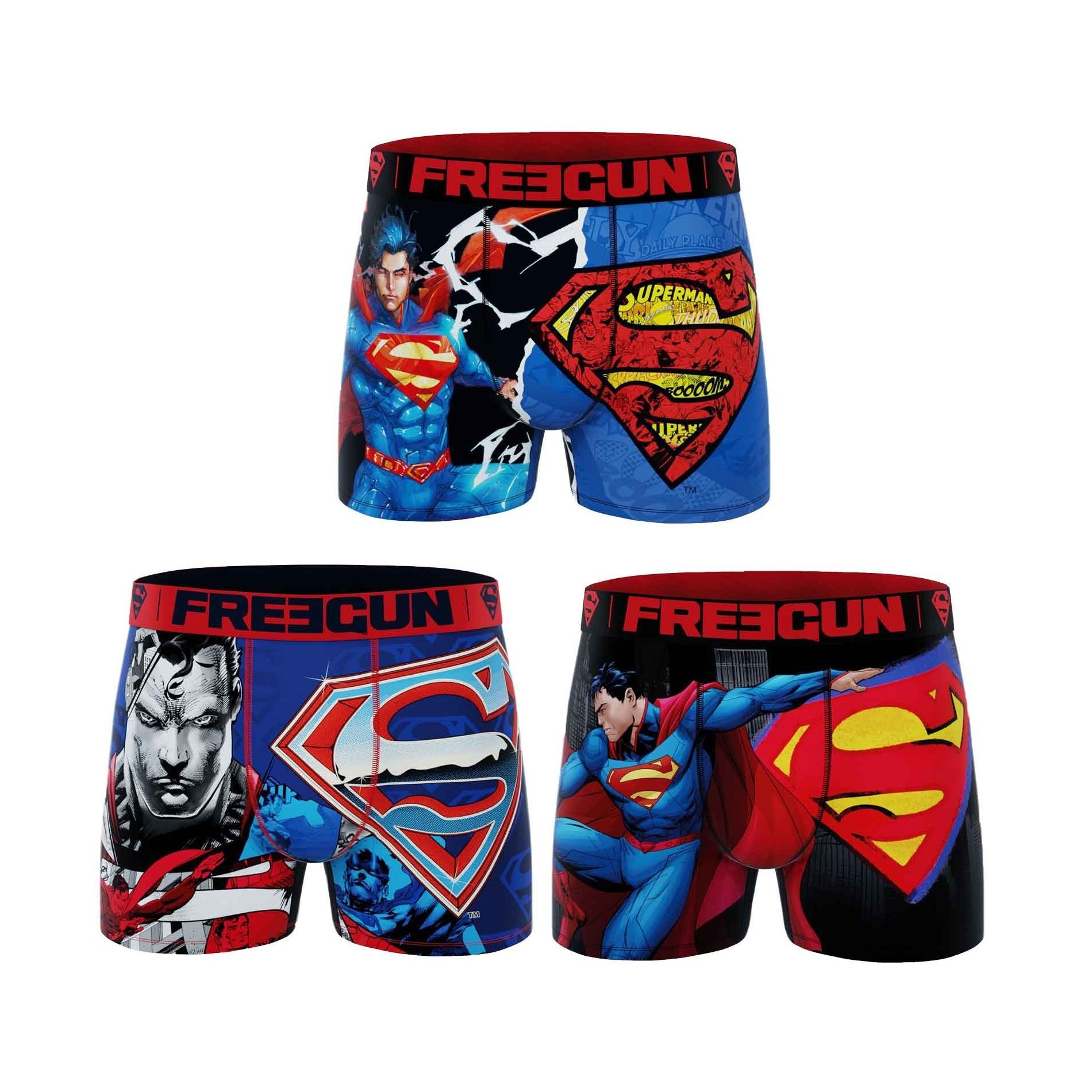 Boxershorts Freegun för män. Set med 3 Superman-modeller. Officiell licens från DC Comics. Nördig stil, stretchig komfort och perfekt passform. Perfekt superhjältepresent.