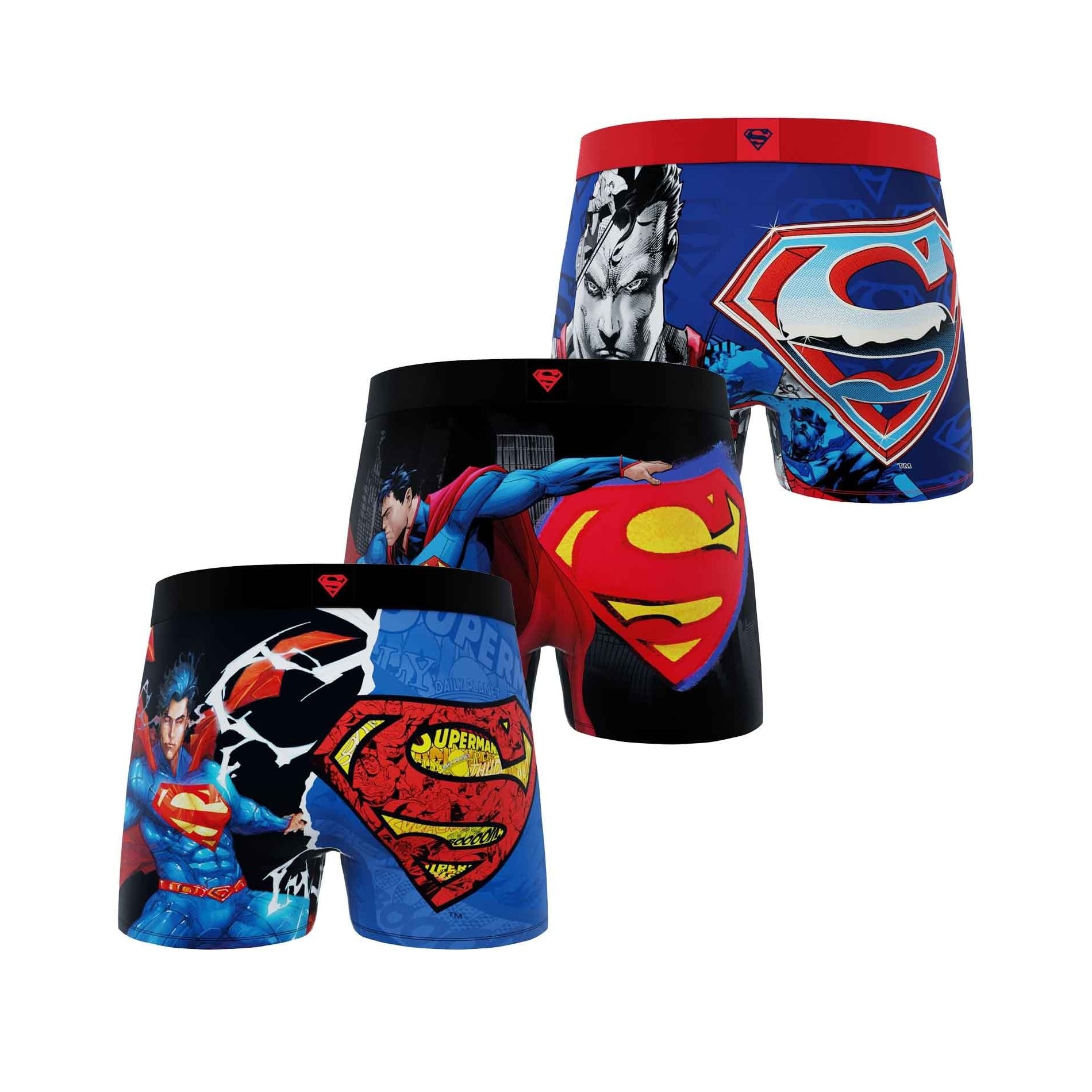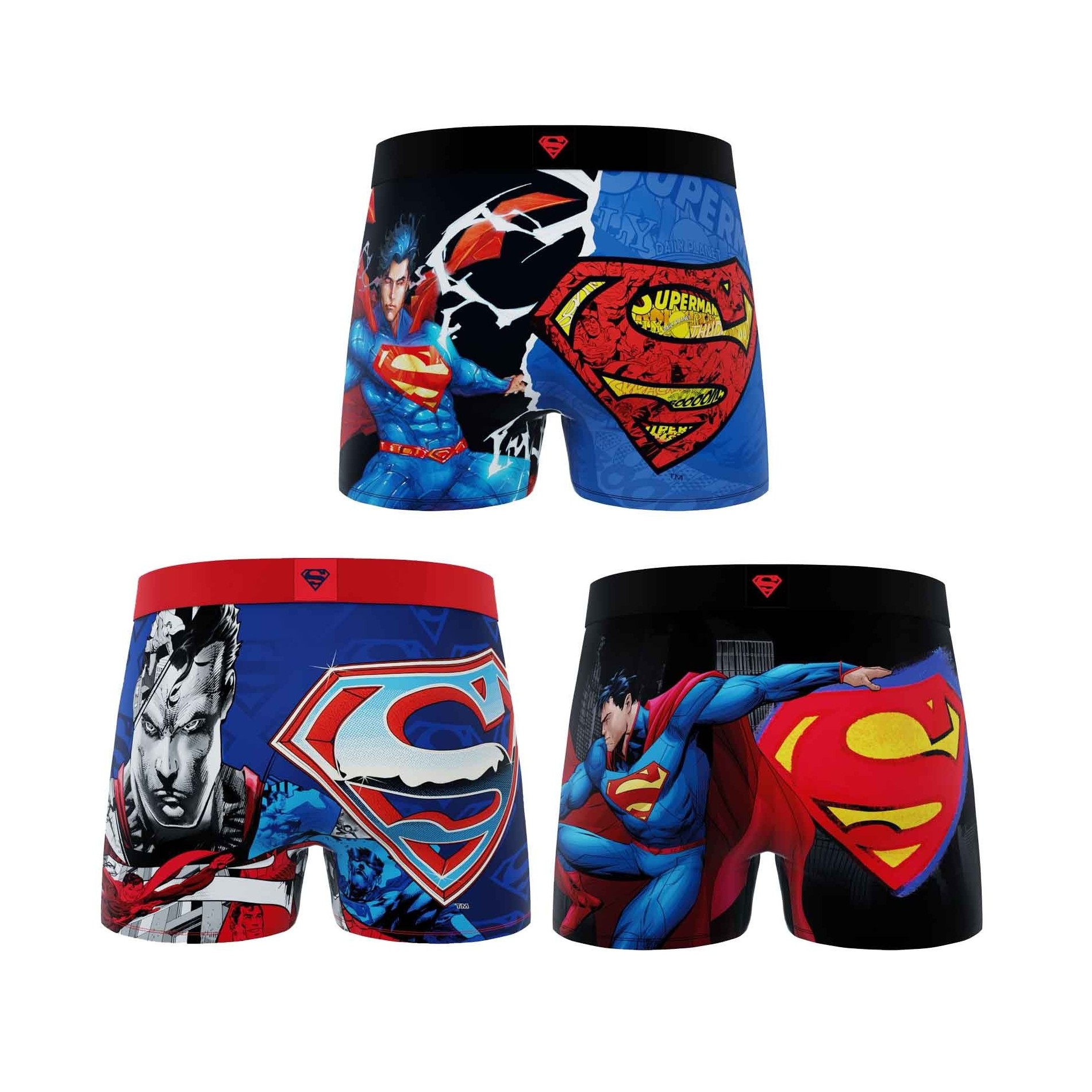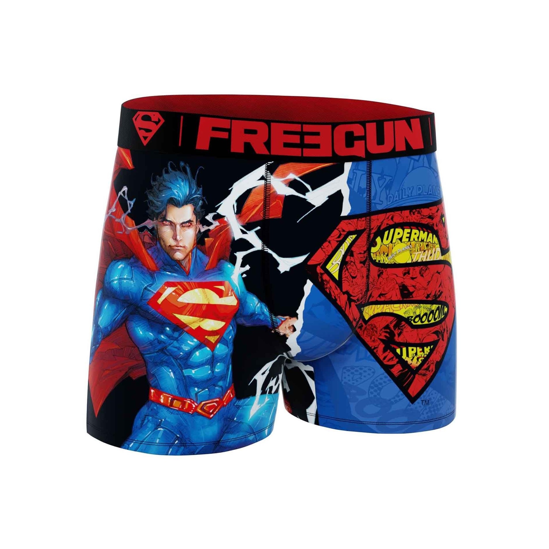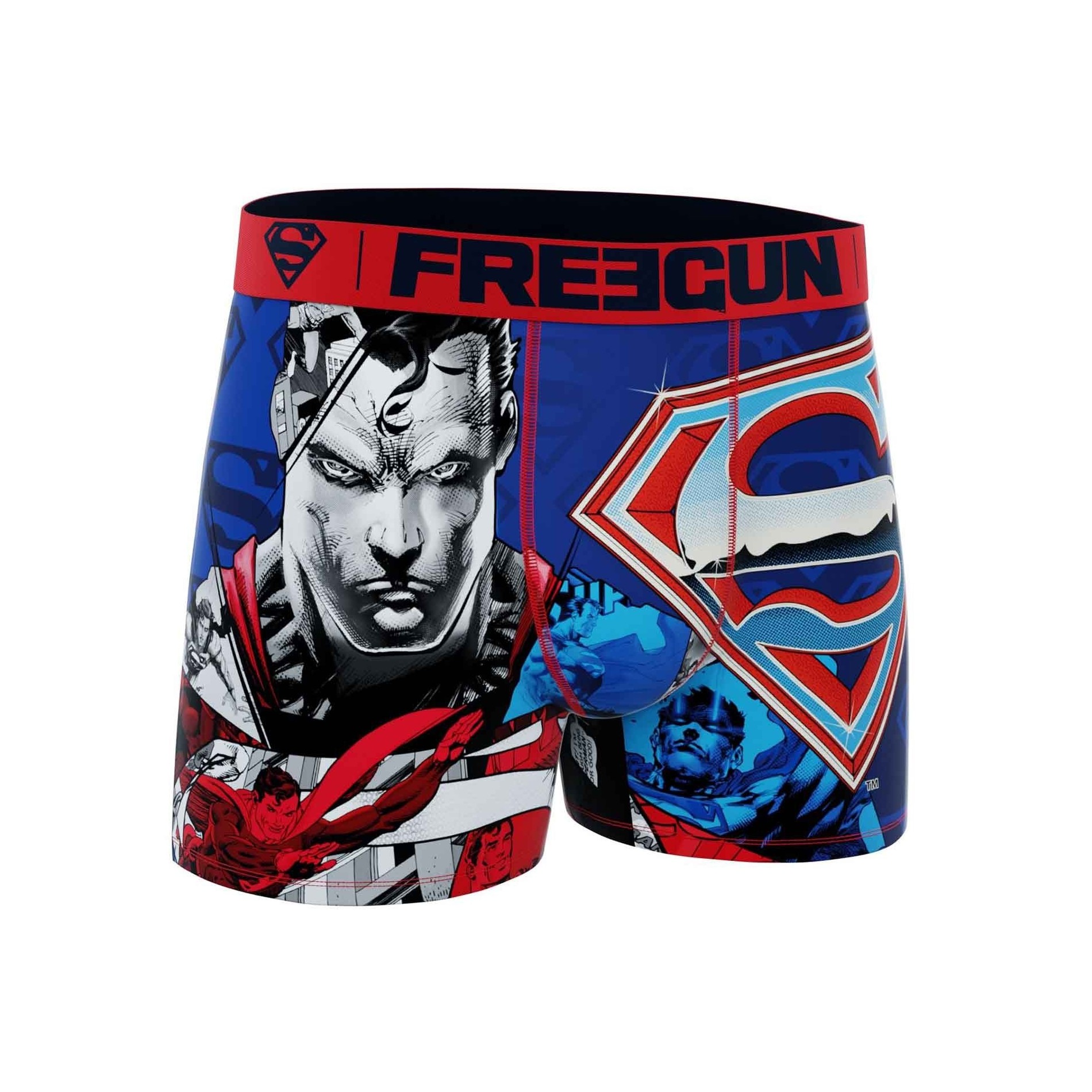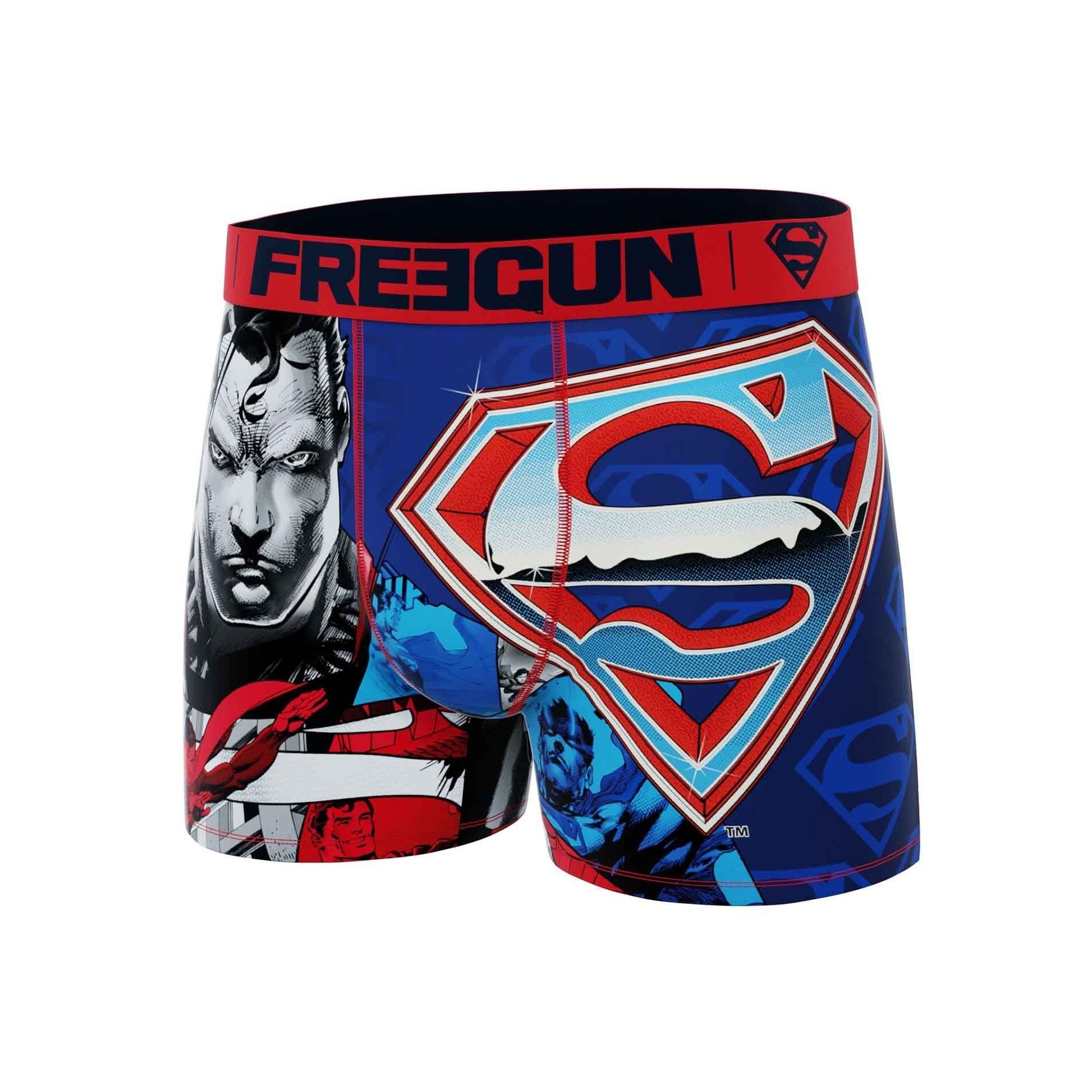 Boxershorts Freegun för män. Set med 3 Superman-modeller. Officiell licens från DC Comics. Nördig stil, stretchig komfort och perfekt passform. Perfekt superhjältepresent.