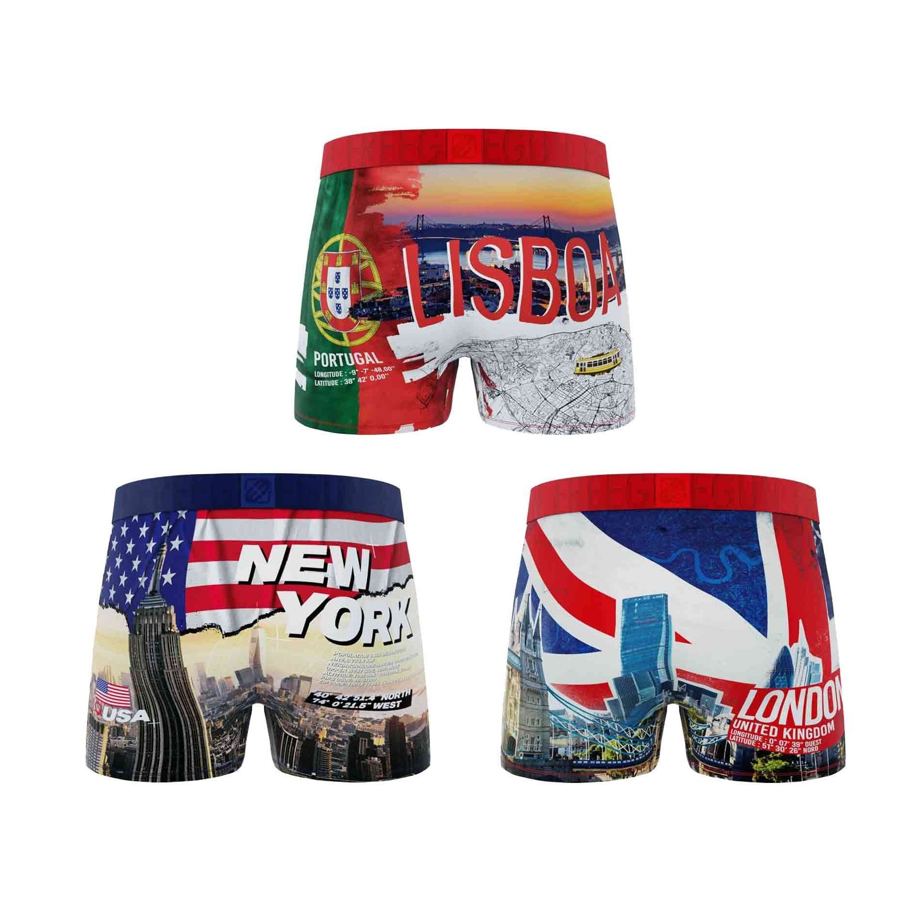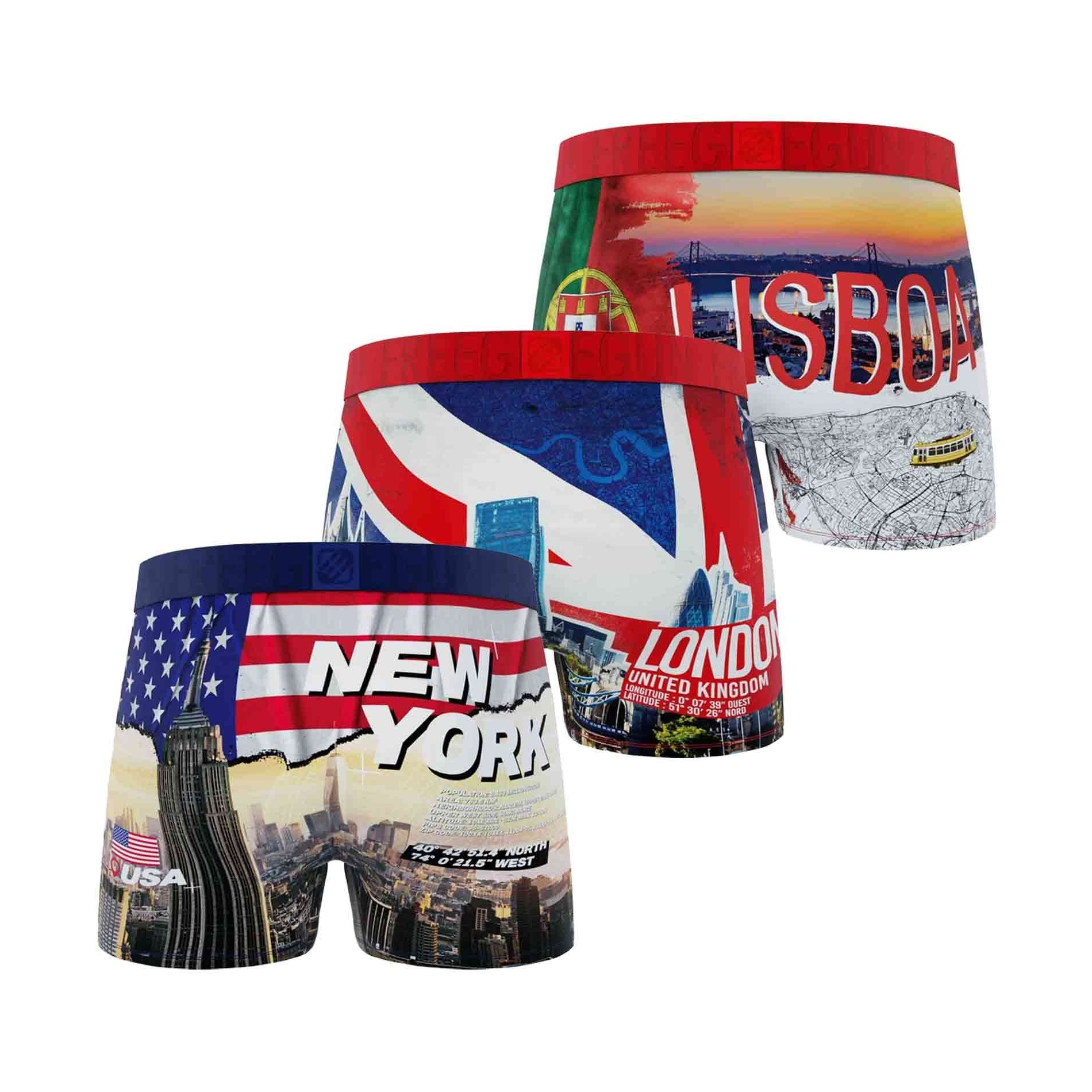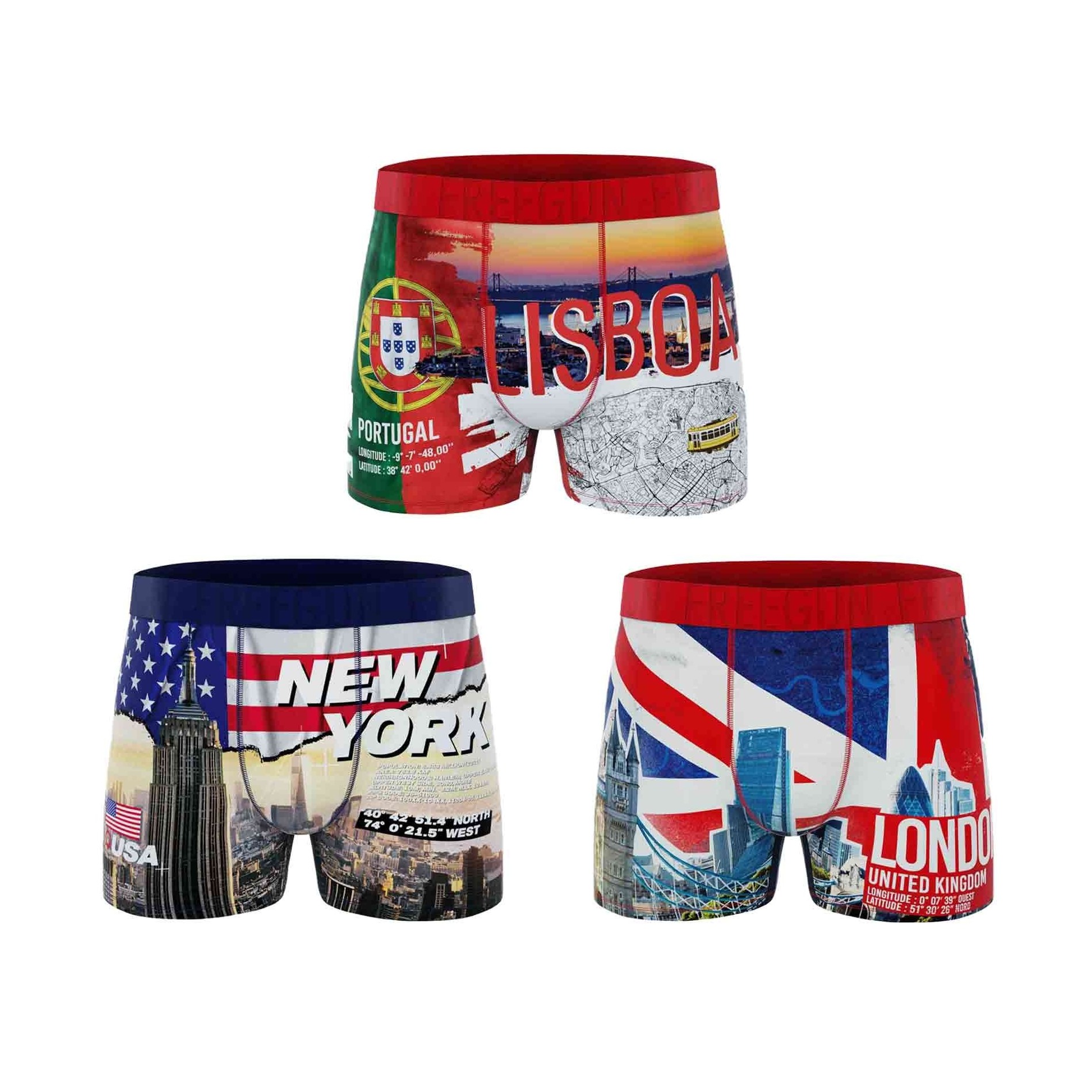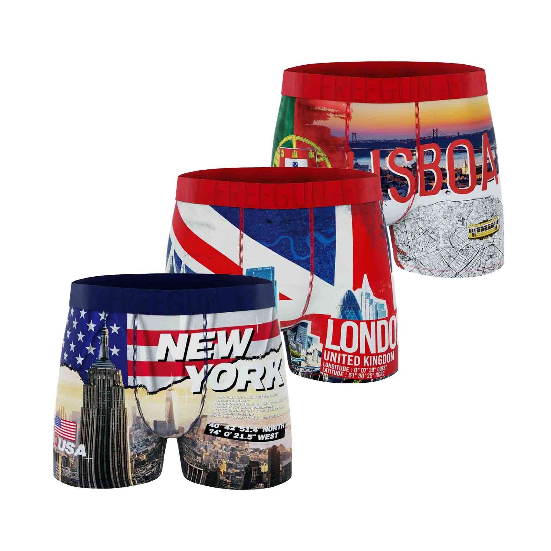 Fördjupa dig i världens mest ikoniska huvudstäder med denna uppsättning av 3 "City Pack" boxershorts för män Freegun. Inspirerade av stadslandskapen och de starka symbolerna i New York, Lissabon och London tar dessa boxershorts dig med på en bekväm resa.