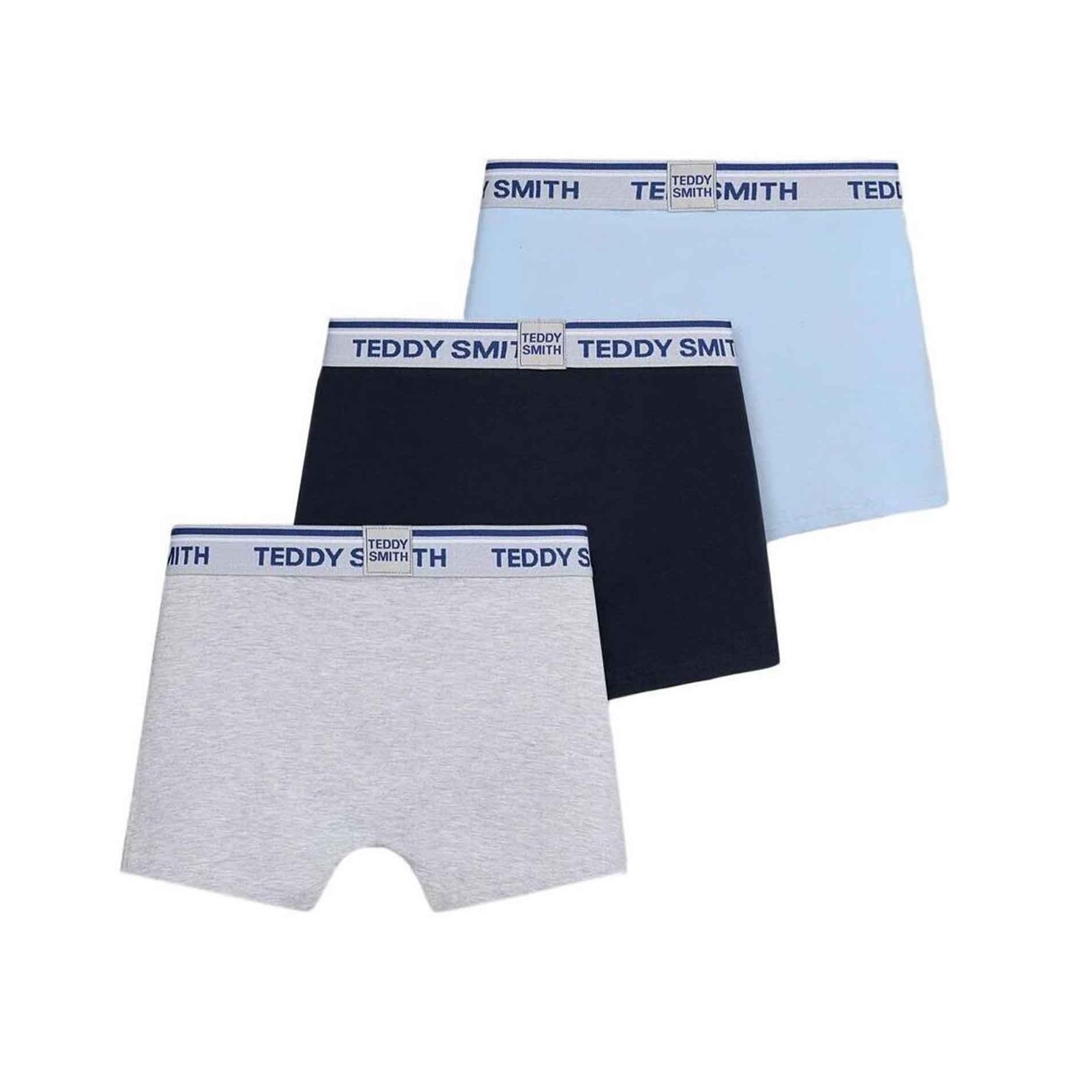 Förpackning med 3 st Teddy Smith boxershorts i bomull med stretch. Färger: grå, marinblå, himmelsblå, märkeslinning, smal passform. Vardagskomfort, utmärkt valuta för pengarna.