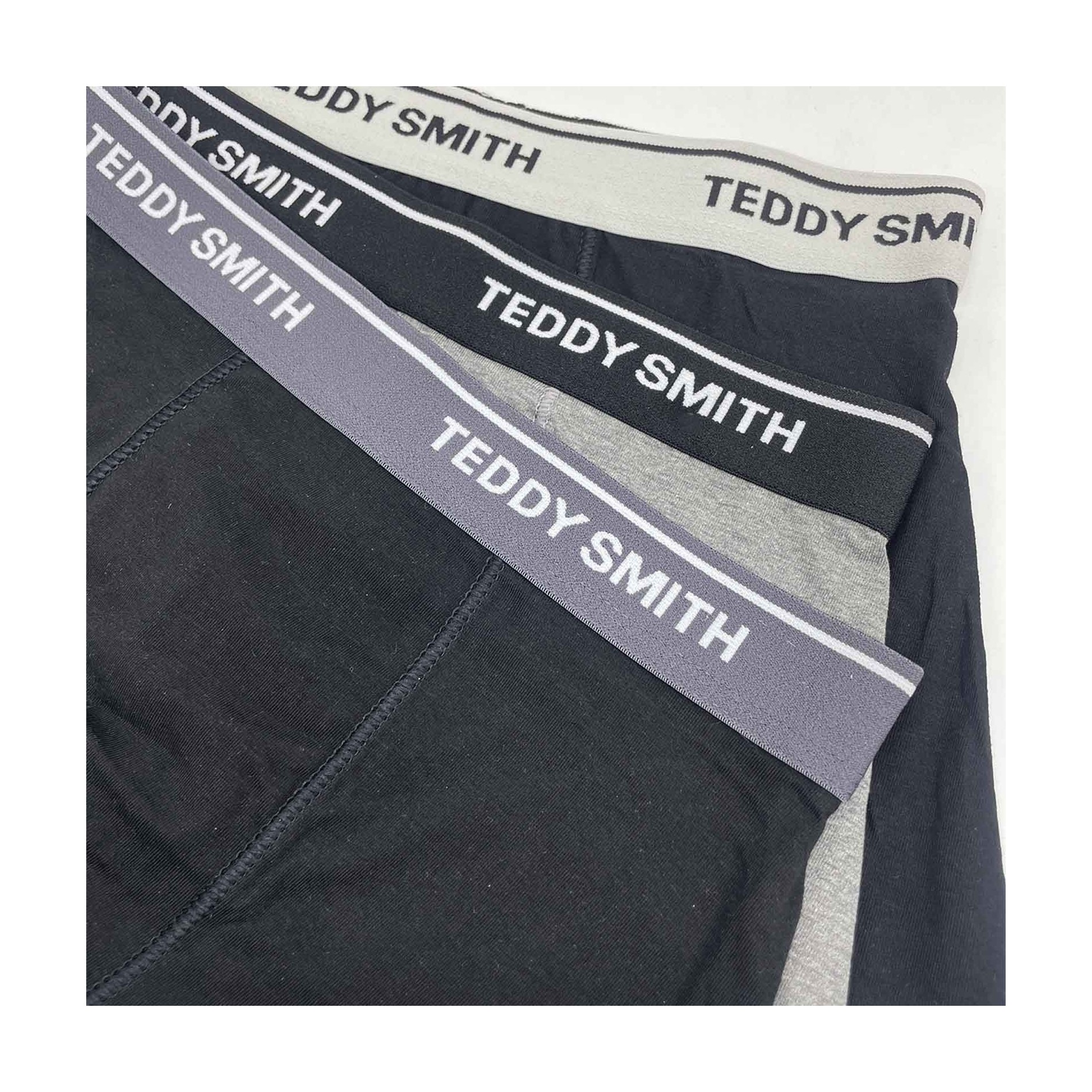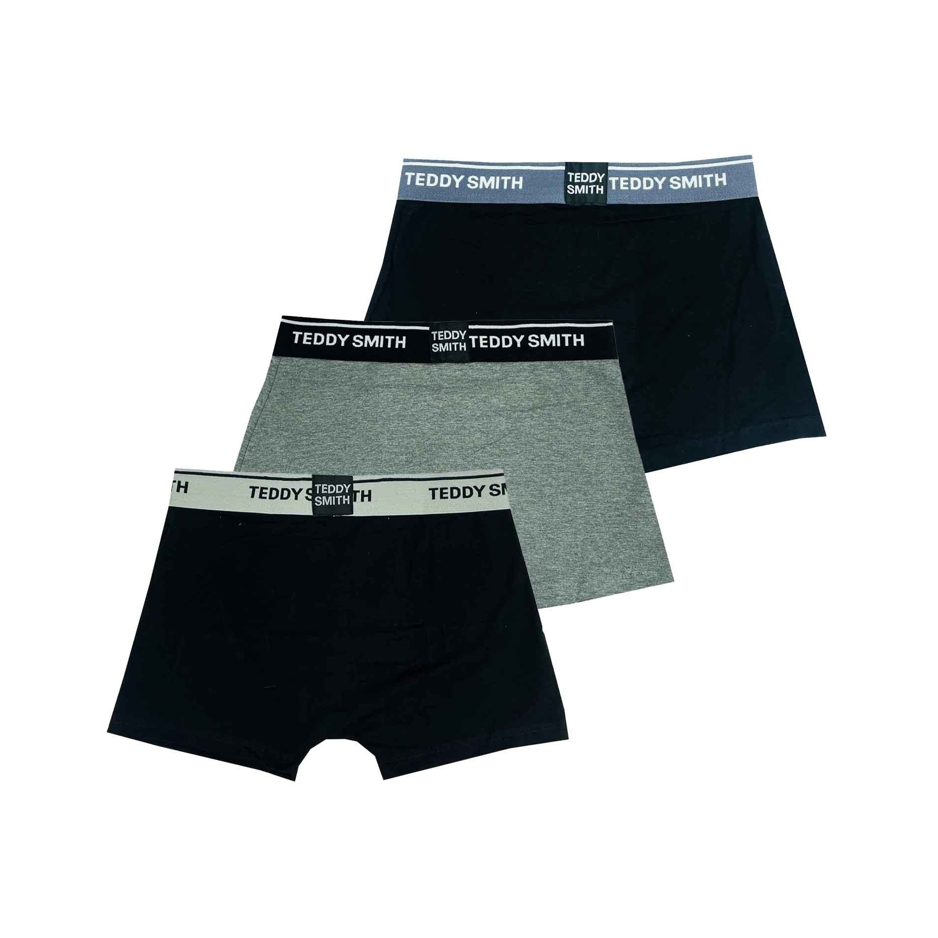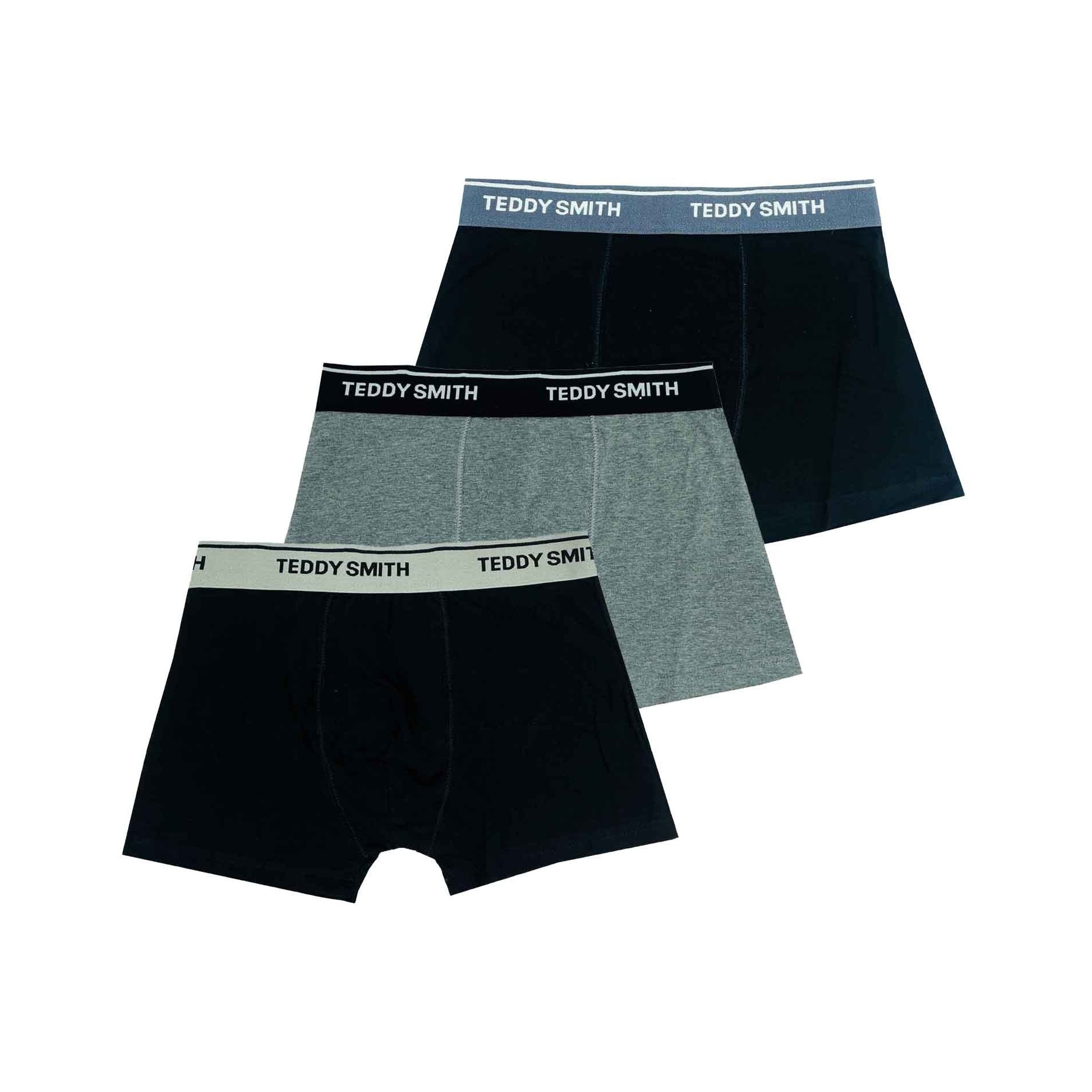 3-pack Teddy Smith boxershorts i mjuk bomull som andas, i färgerna svart och grå. Bekväm boxerskärning, effektiv passform och elastiska midjeband med logotyp för en sober, premium vardagslook.