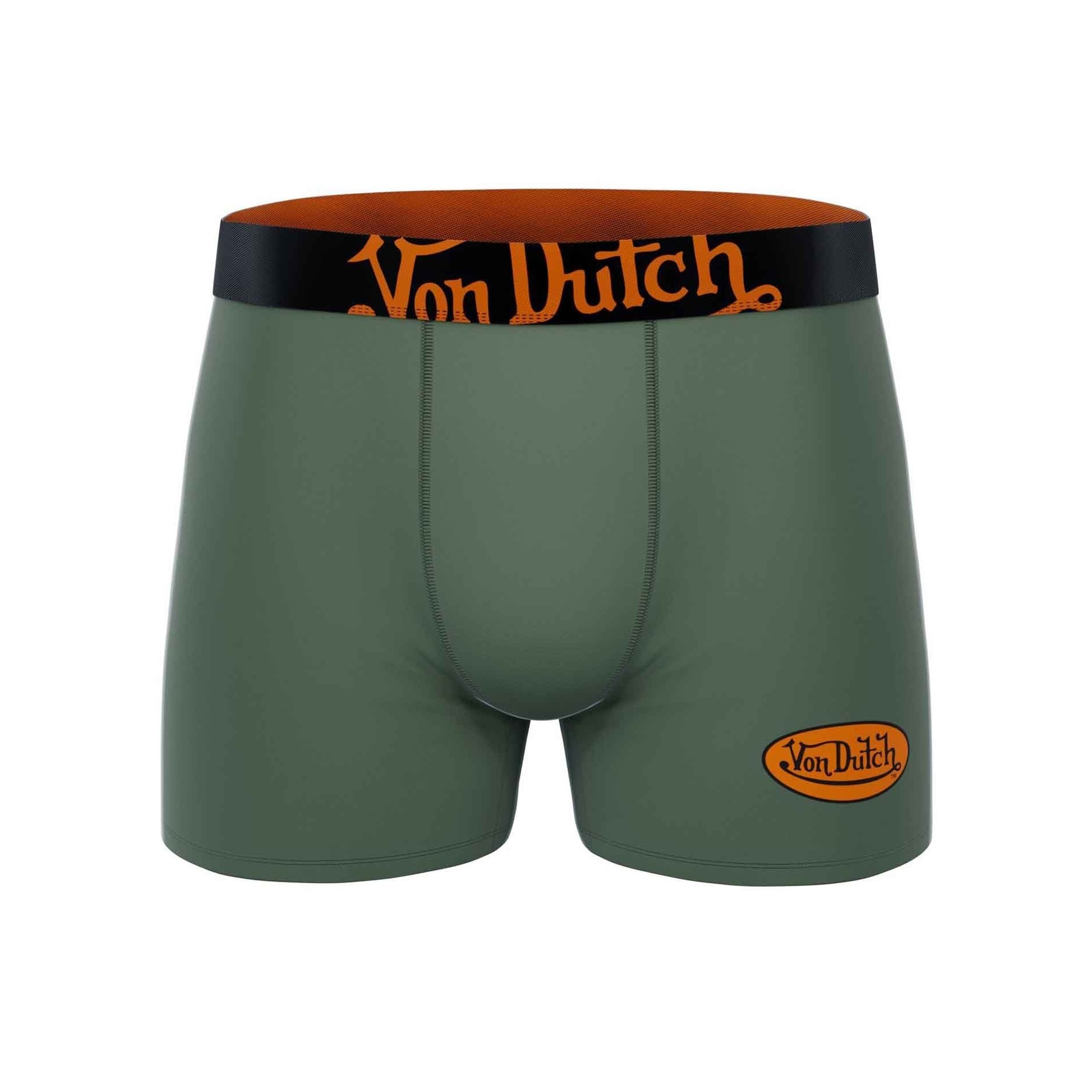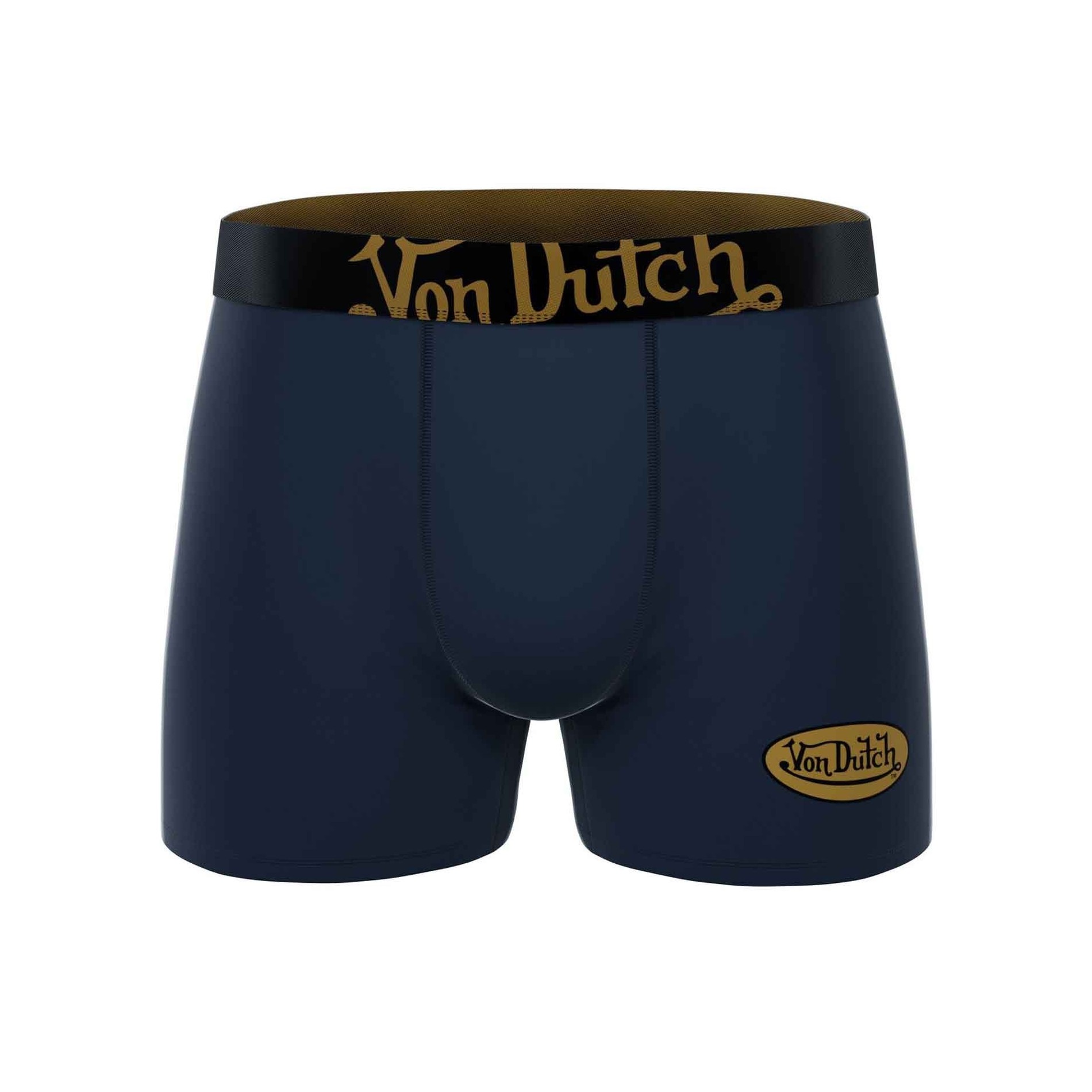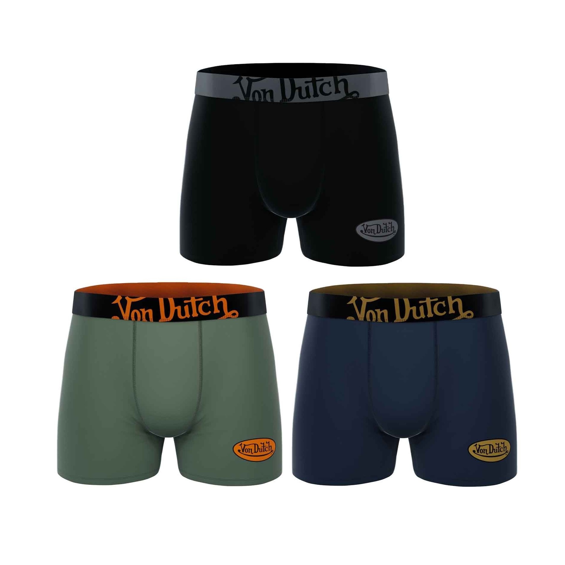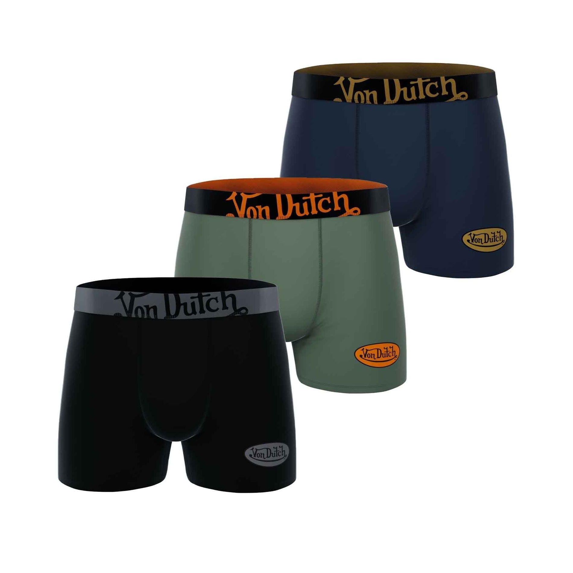 Von Dutch -Set om 3 boxershorts i bomull med stretch för herr: midjeband med logo, platta sömmar, bekväm passform. Svart/khaki/navyblå. Officiell produkt.