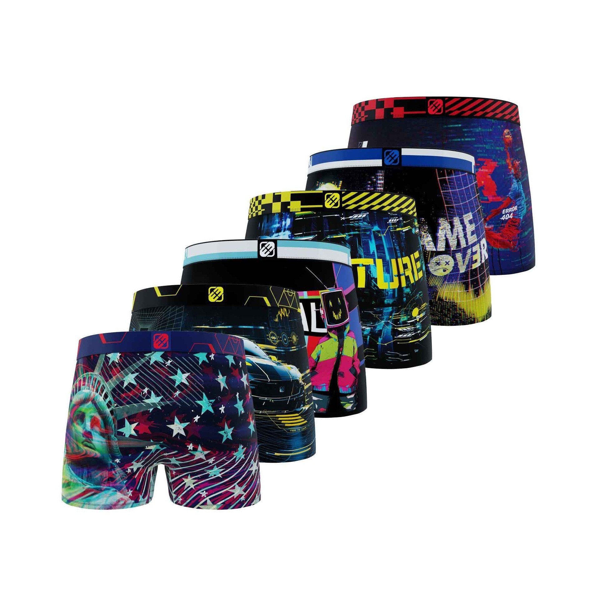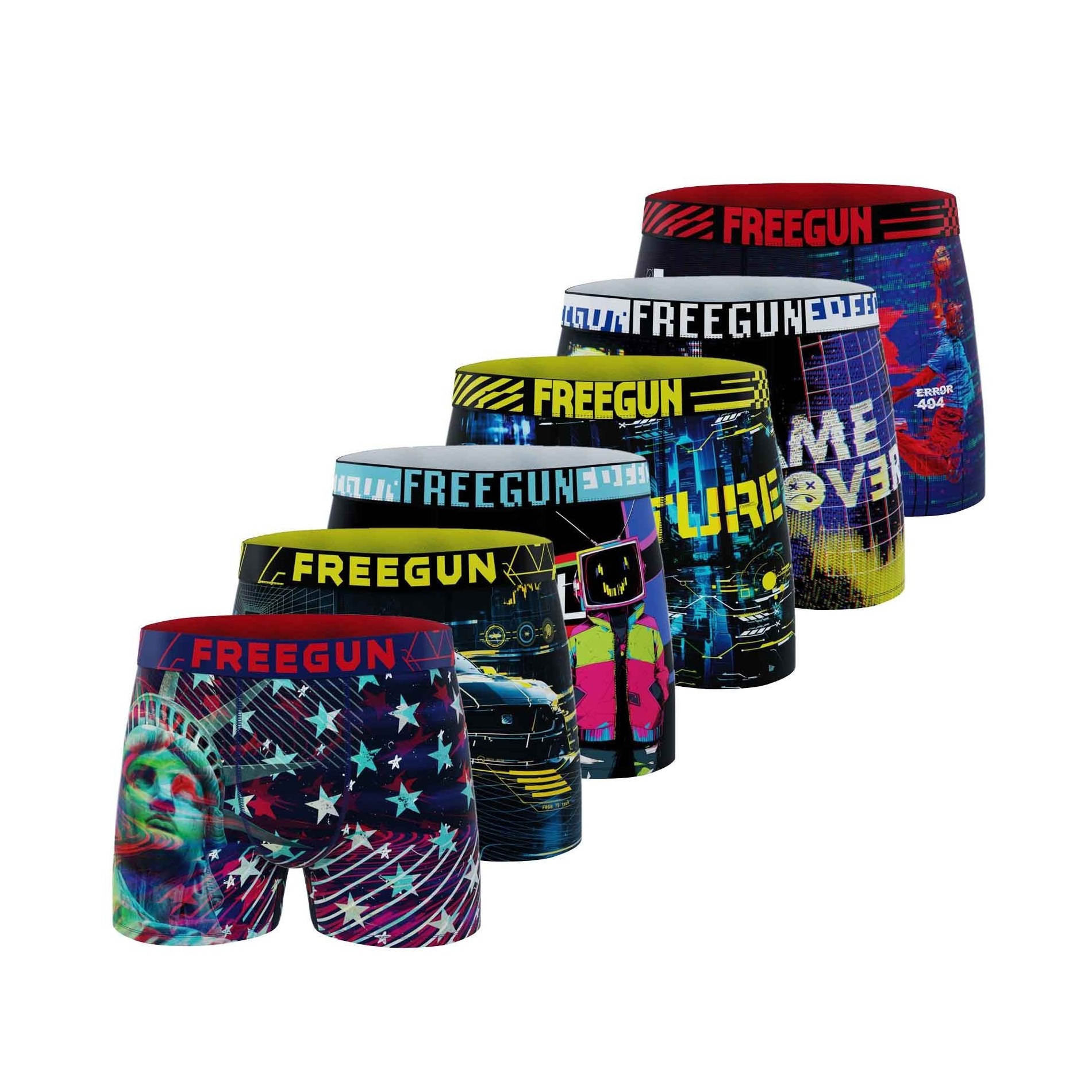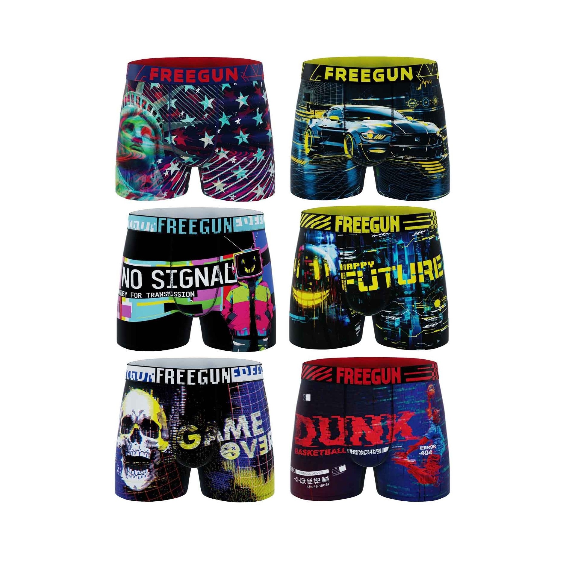 Upptäck 6-pack Freegun "Pixel" mikrofiberboxershorts för herr, ett koncentrat av urban och futuristisk stil. Dessa boxershorts är inspirerade av den digitala världen, spelvärlden och cyberpunk och har dynamiska motiv som Frihetsgudinnan i ny tappning, futuristiska racerbilar, "No Signal"-meddelanden, pixelerade dödskallar och referenser till basket och retrospel.