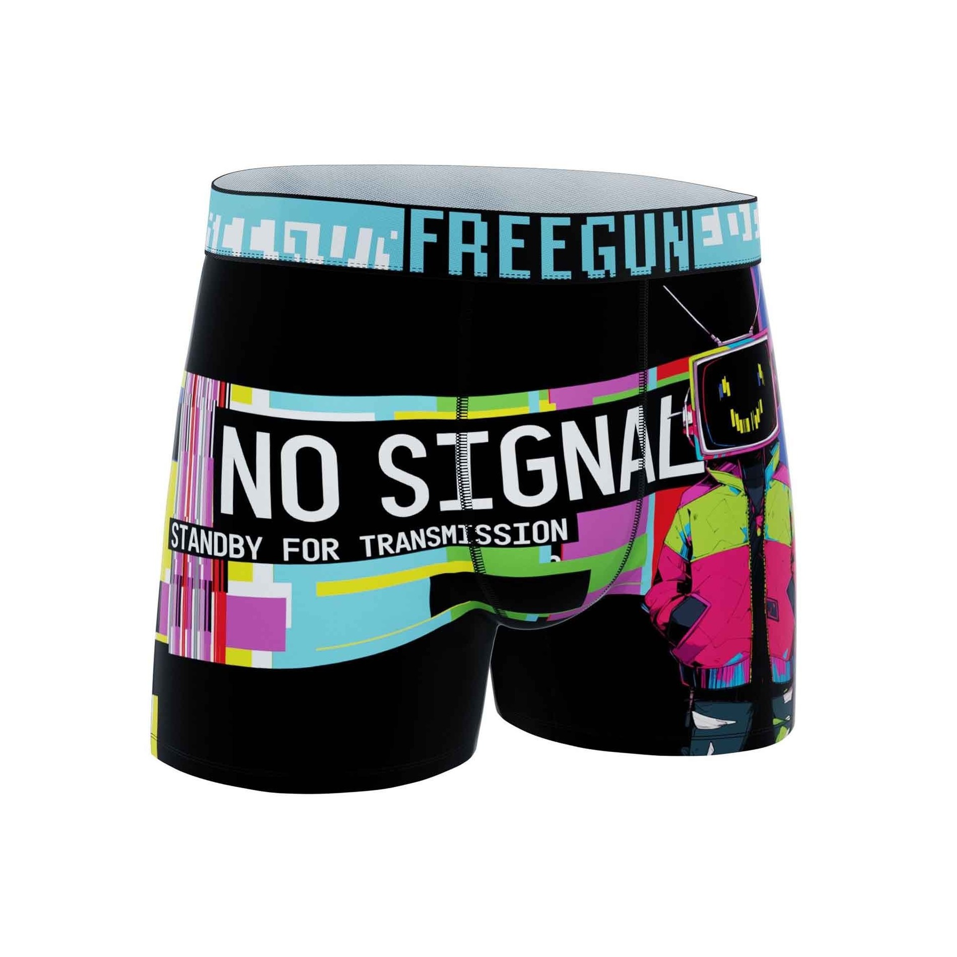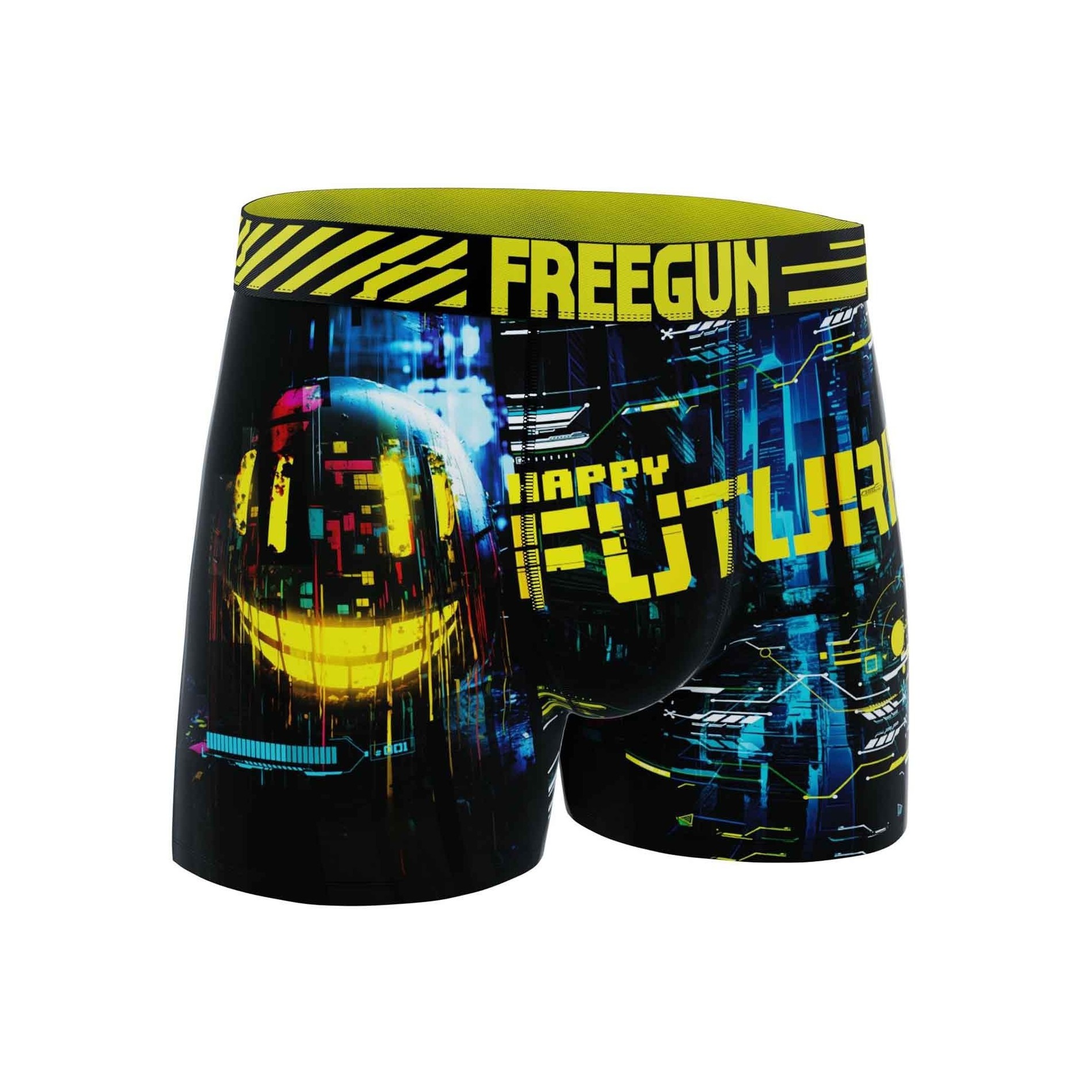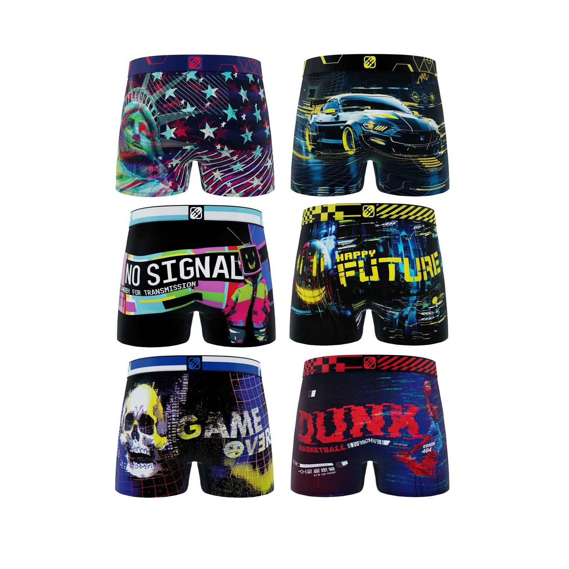 Upptäck 6-pack Freegun "Pixel" mikrofiberboxershorts för herr, ett koncentrat av urban och futuristisk stil. Dessa boxershorts är inspirerade av den digitala världen, spelvärlden och cyberpunk och har dynamiska motiv som Frihetsgudinnan i ny tappning, futuristiska racerbilar, "No Signal"-meddelanden, pixelerade dödskallar och referenser till basket och retrospel.