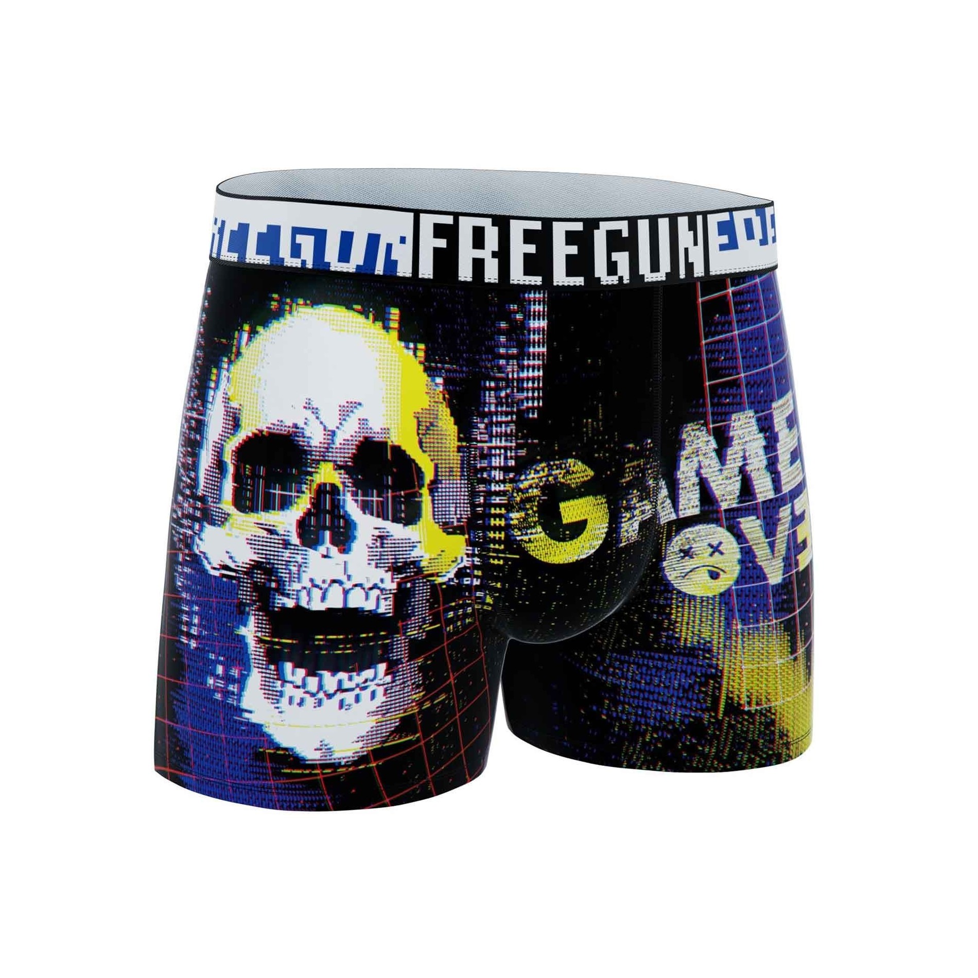 Set om 6 boxerkalsonger för män Freegun - "Pixel"-kollektionen - Mikrofiber Mjukt, andningsbart, stretchigt tyg (92 % polyester - 8 % elastan) Elastiskt midjeband Freegun för optimalt stöd Originaldesign inspirerad av gaming, retro och cyberpunk Vardagskomfort tack vare platta sömmar och fyrvägsstretch