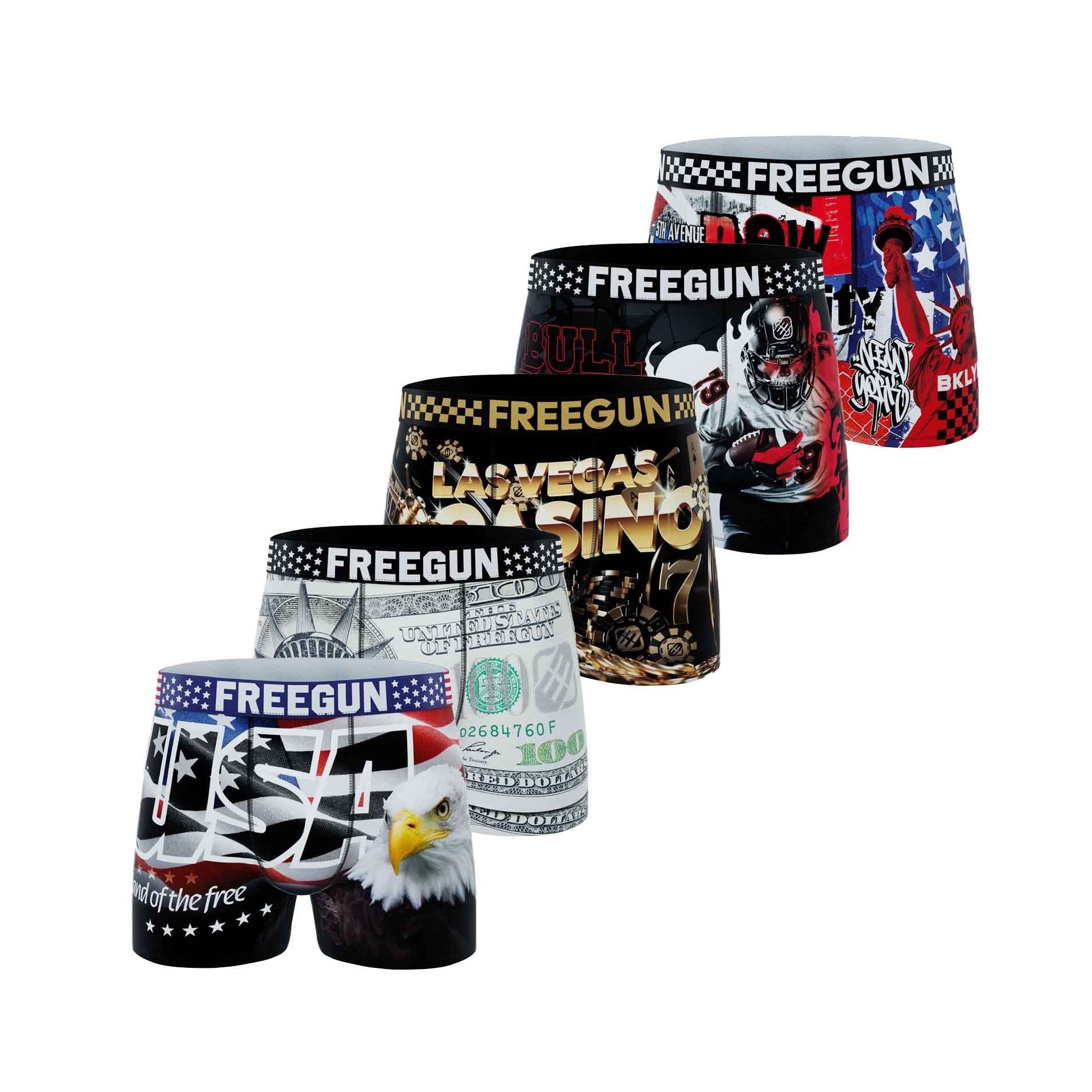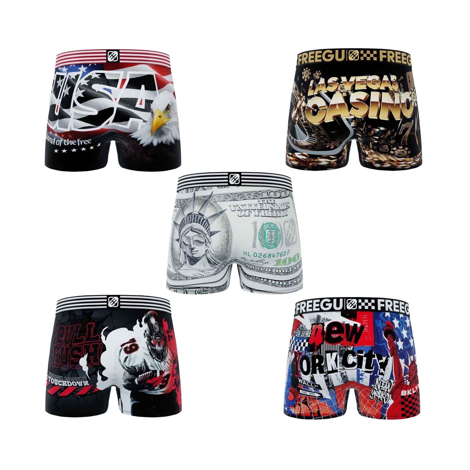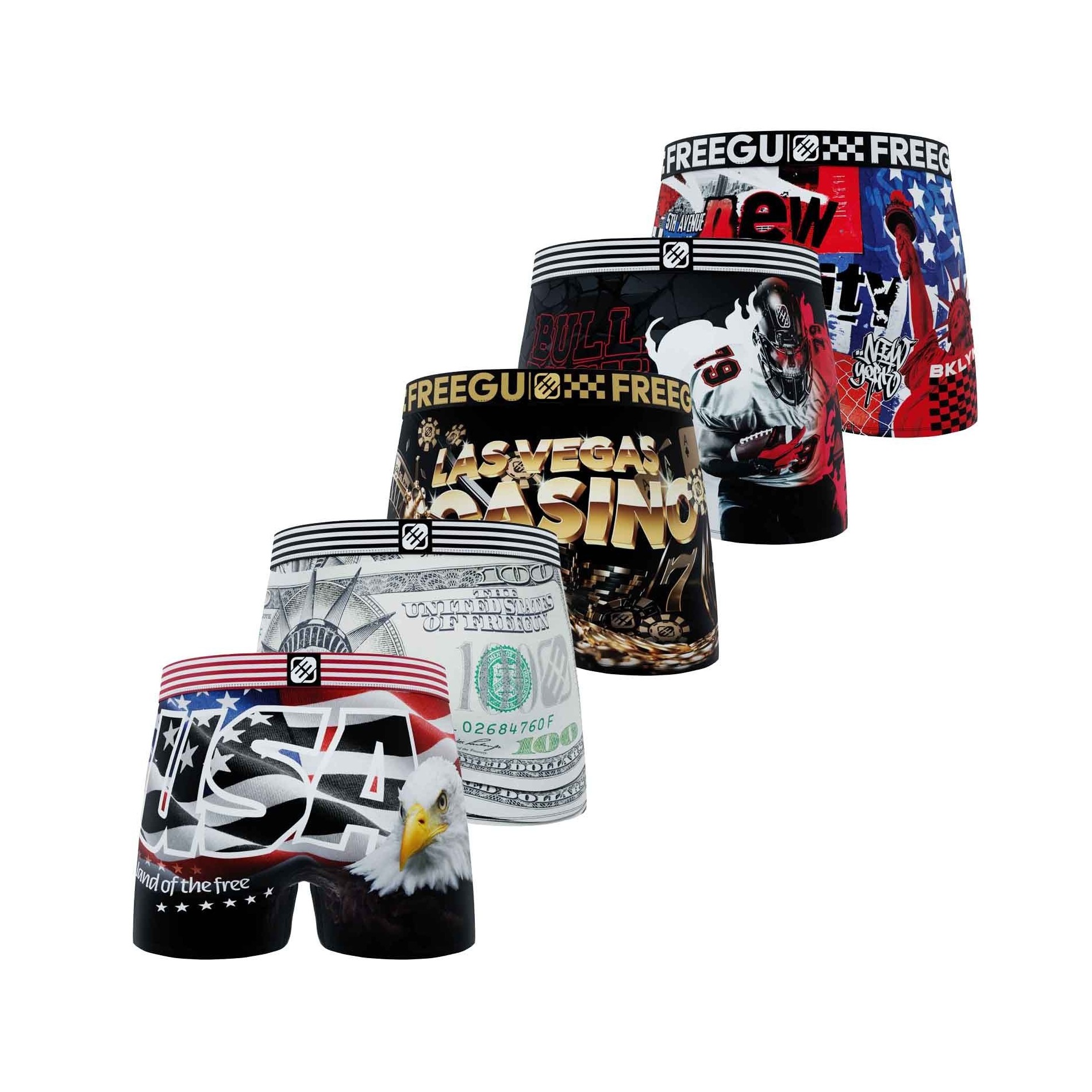 Ge ditt barn stil och komfort med detta paket med 5 st Freegun mikrofiberboxershorts för pojkar, inspirerade av amerikansk kultur. Unika, trendiga mönster som den amerikanska flaggan, dollarn, Las Vegas, New York City och amerikansk fotboll kommer att tilltala unga fans av mode och popkultur.