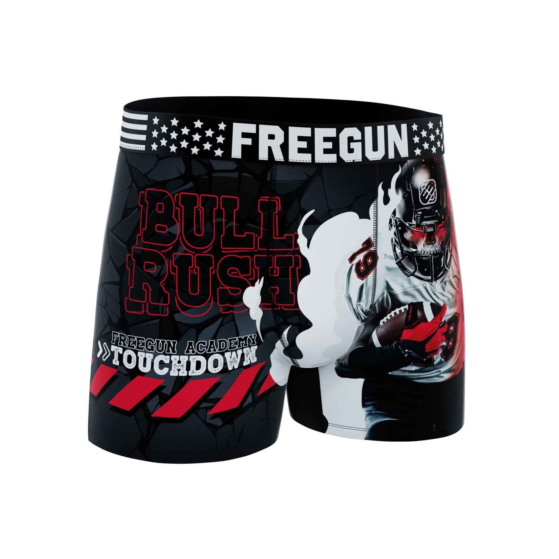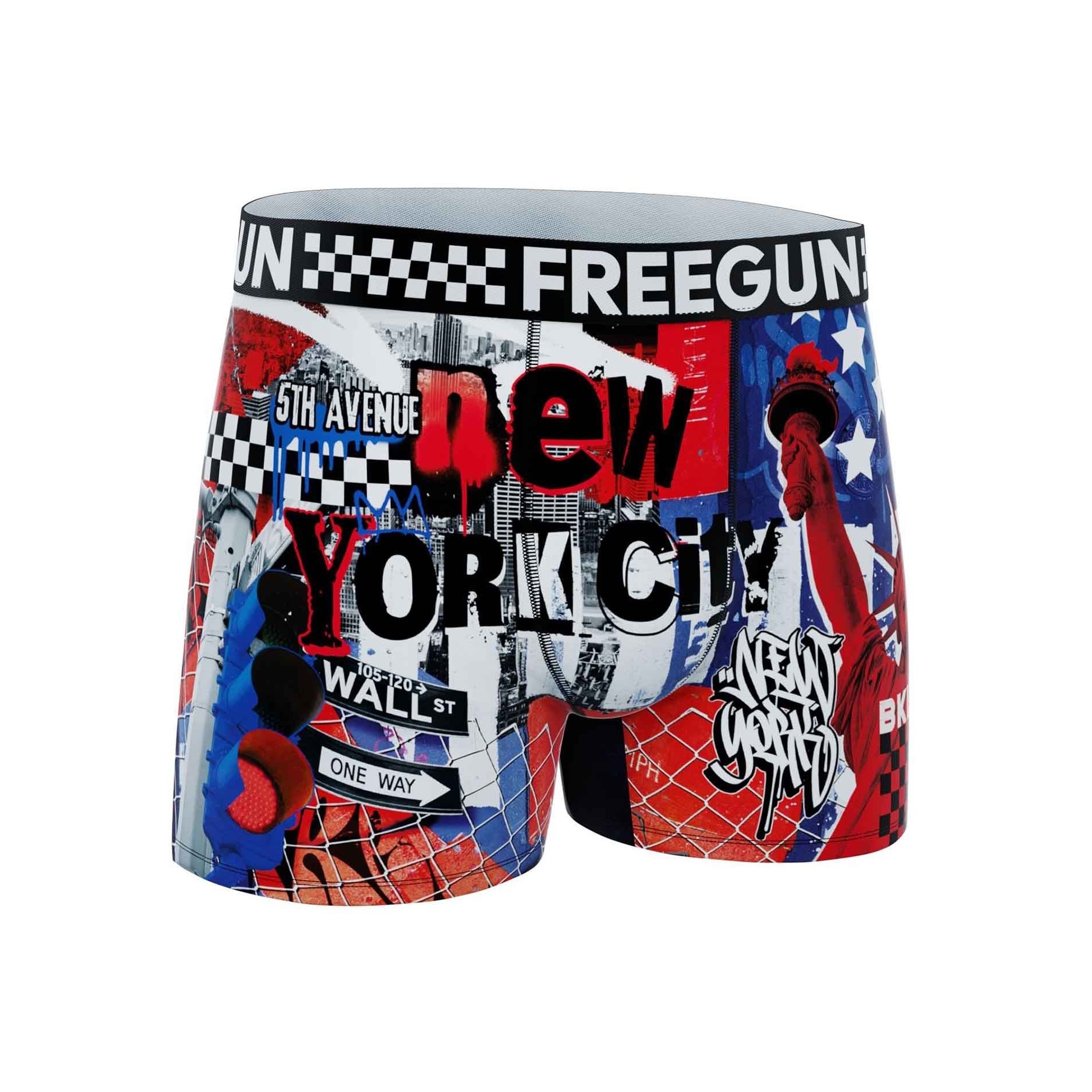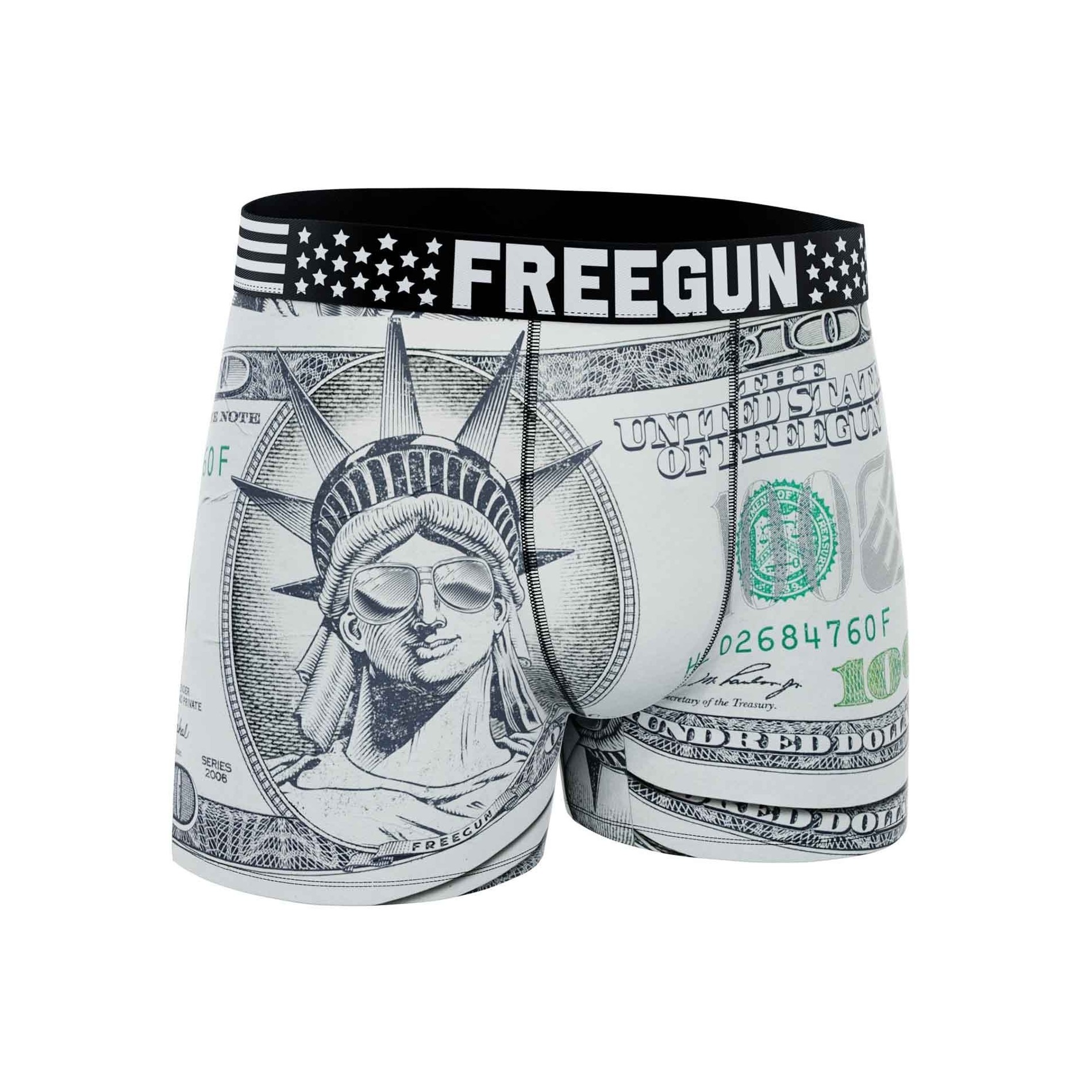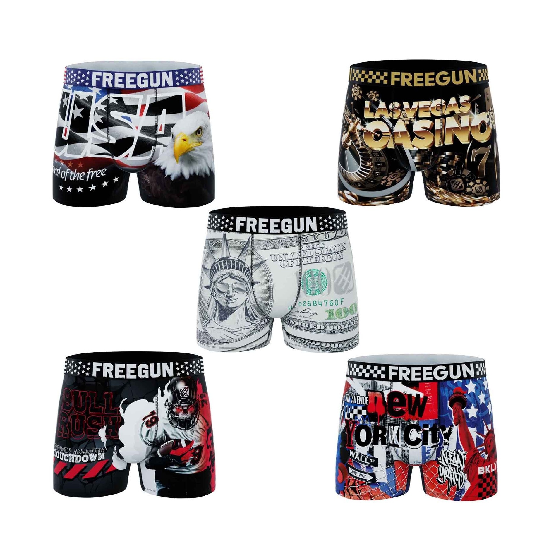 Ge ditt barn stil och komfort med detta paket med 5 st Freegun mikrofiberboxershorts för pojkar, inspirerade av amerikansk kultur. Unika, trendiga mönster som den amerikanska flaggan, dollarn, Las Vegas, New York City och amerikansk fotboll kommer att tilltala unga fans av mode och popkultur.