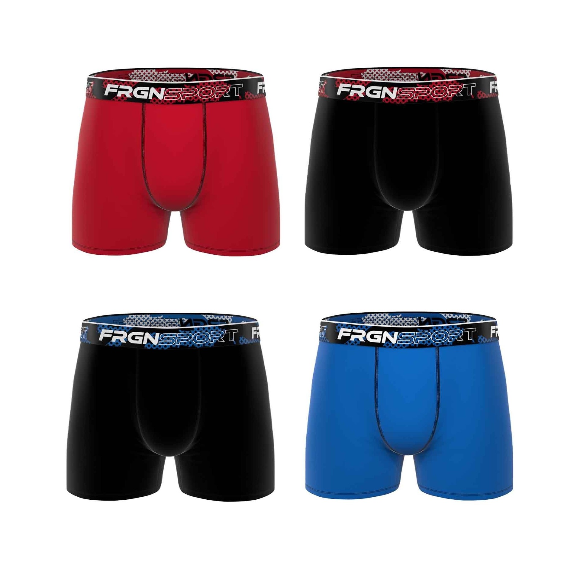 paket med 4 boxershorts för pojkar Freegun i stretchig bomull: mjuka, andas och är stretchiga. FRGN SPORT midjeband, bekväm passform, 2 svarta + 1 röda + 1 blå. Perfekta för skola och sport.