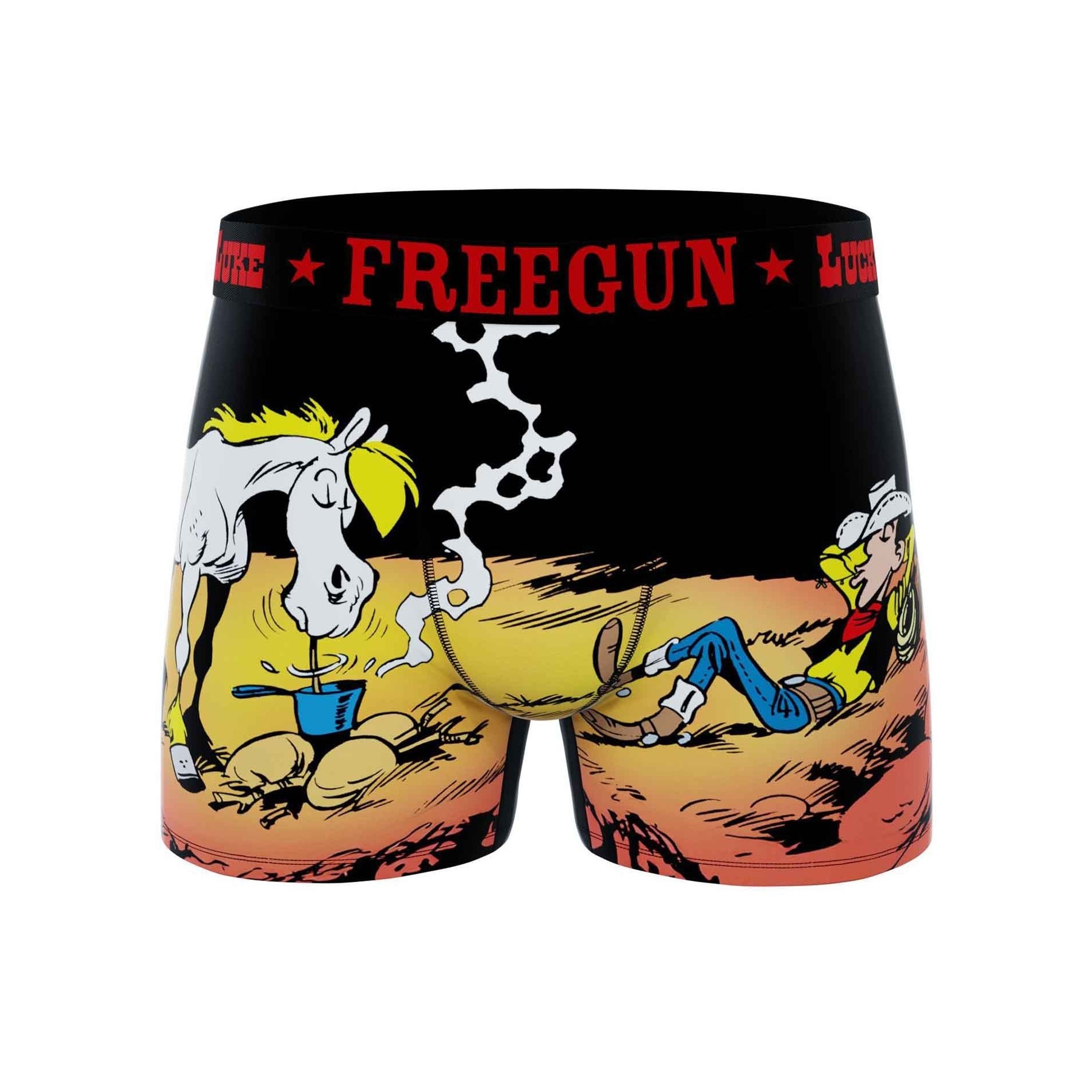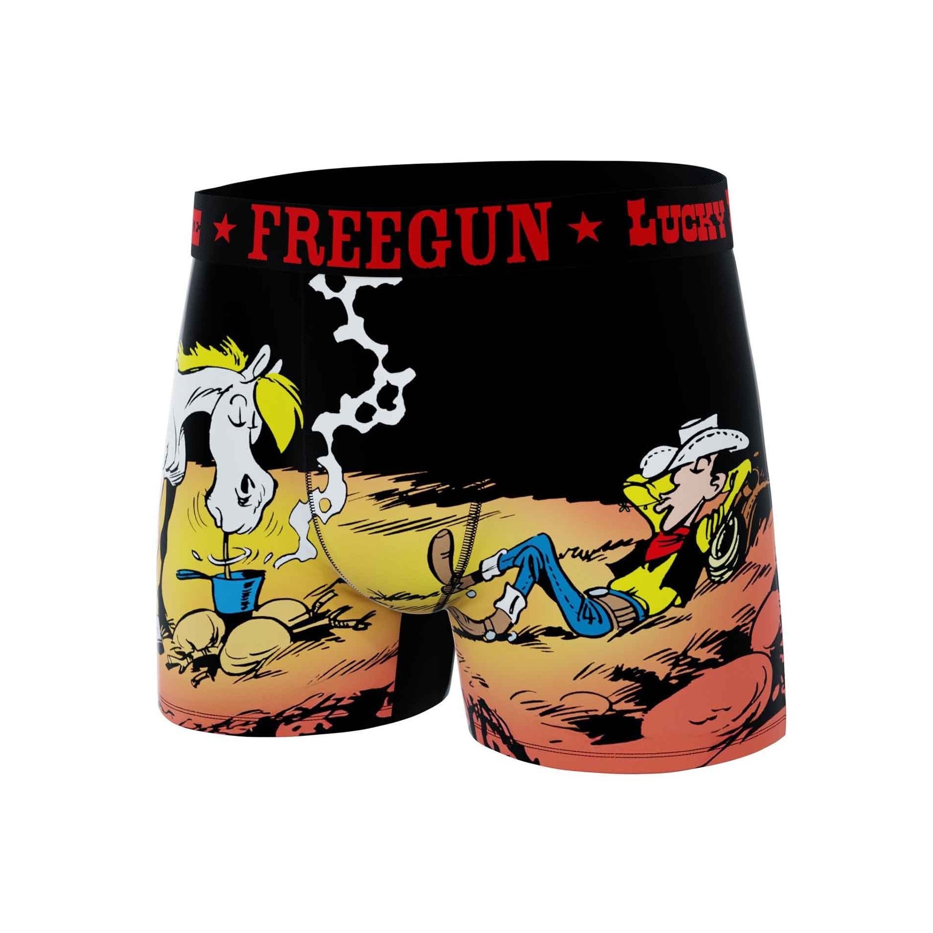 Boxer Freegun i mjuk, stretchig mikrofiber (polyester/elastan). HD Lucky Luke-tryck troget serietidningarna, FREEGUN jacquard midjeband för en bekväm passform, platta anti-chafe sömmar. Andas och torkar snabbt för komfort i vardagen. Officiell Lucky Luke-licens. Skötsel: 30°C ut och in, får ej torktumlas. Storlekarna S till XXL finns i lager.