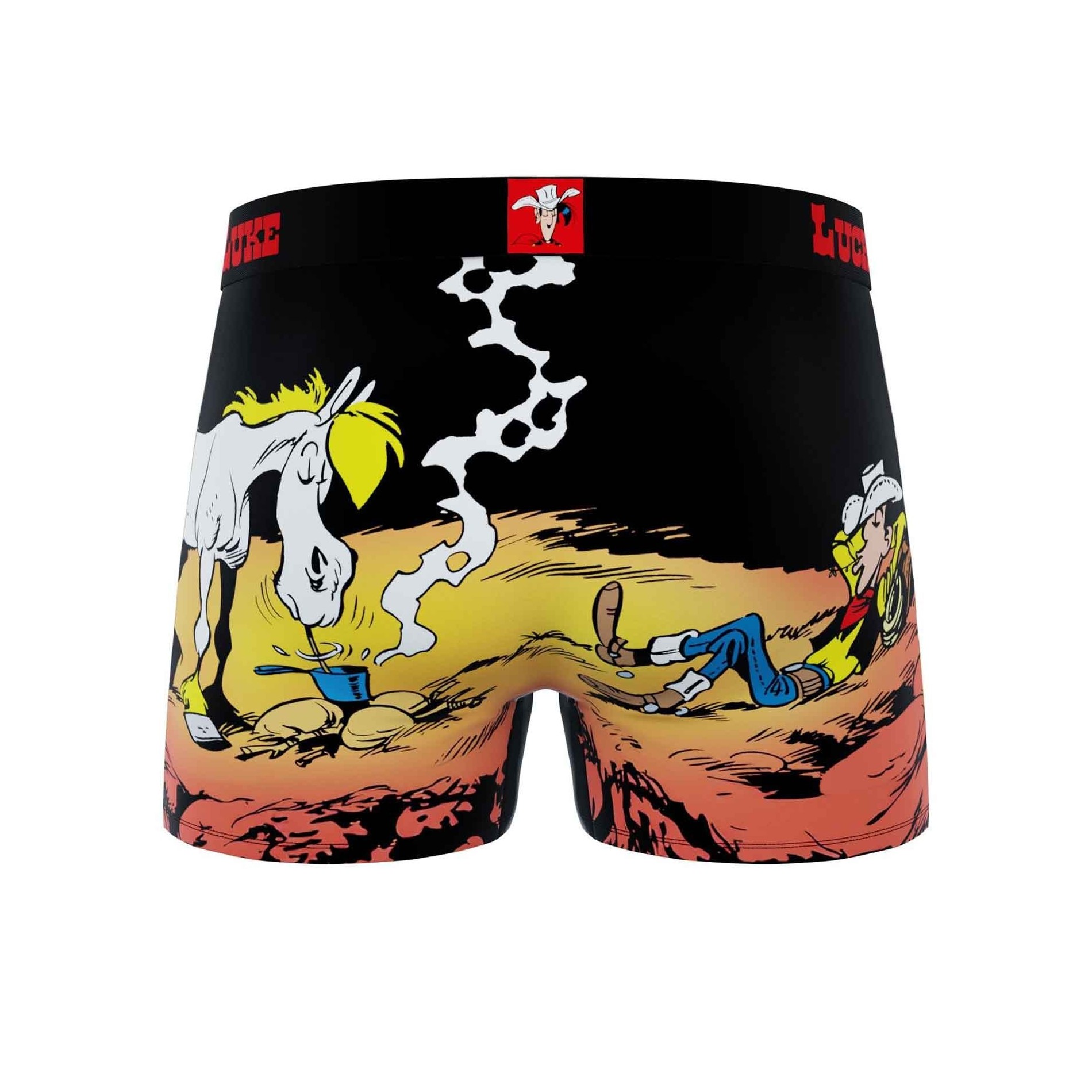 Lucky Luke all-over HD-tryck (serietidningsscener, Jolly Jumper, ikoniska emblem) behåller sina intensiva färger tvätt efter tvätt. FREEGUN-midjebandet i jacquard ger en stabil passform utan märken, medan de platta sömmarna begränsar skav.