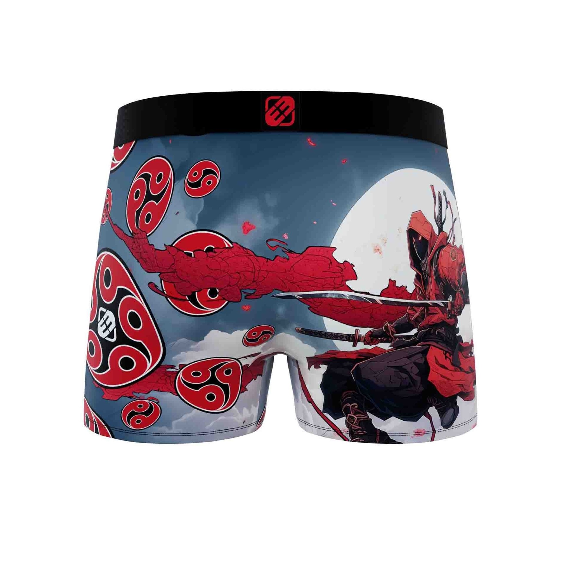 Få Ninja-stil med dessa boxershorts för män Freegun i stretchig mikrofiber. De andas, är snabbtorkande och har en second skin-effekt som gör att de följer med dig under sport och i vardagen. Detsublimerade trycket föreställer en krigare med katana, röda symboler och en månbakgrund, med intensiva färger som tål att tvättas. Det elastiska midjebandet Freegun ger en stabil passform utan att trycka ihop och flatlocksömmarna begränsar skav. Ett snitt mitt på låret som håller sig på plats.
