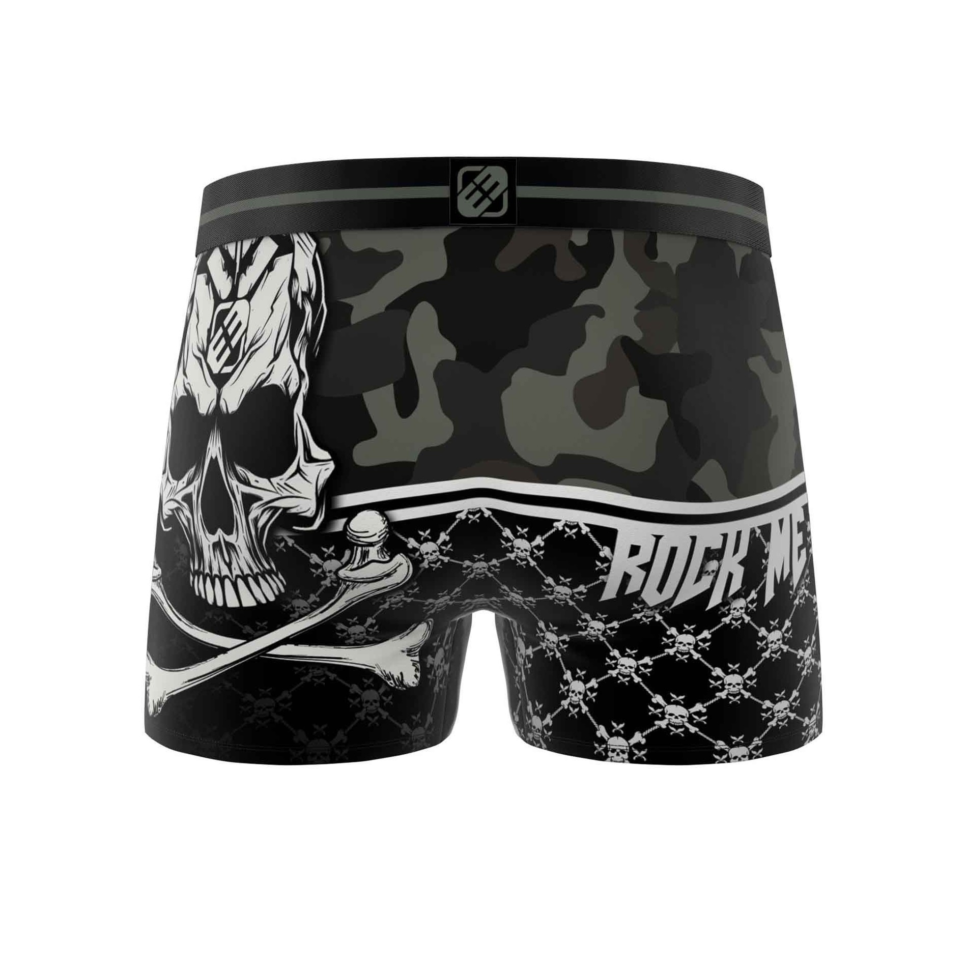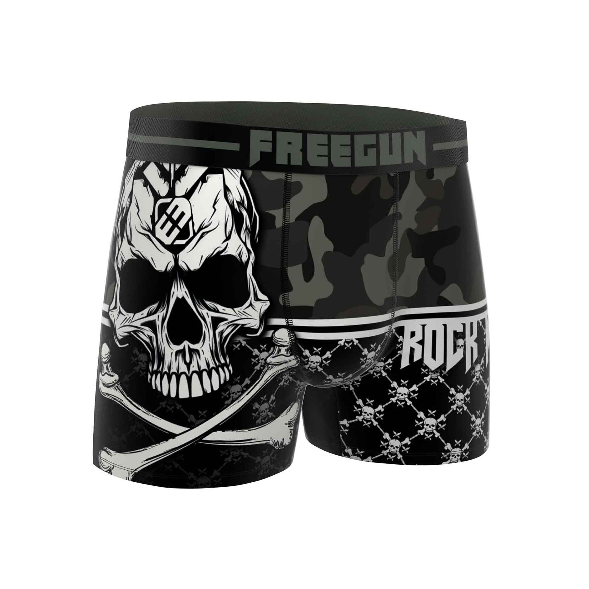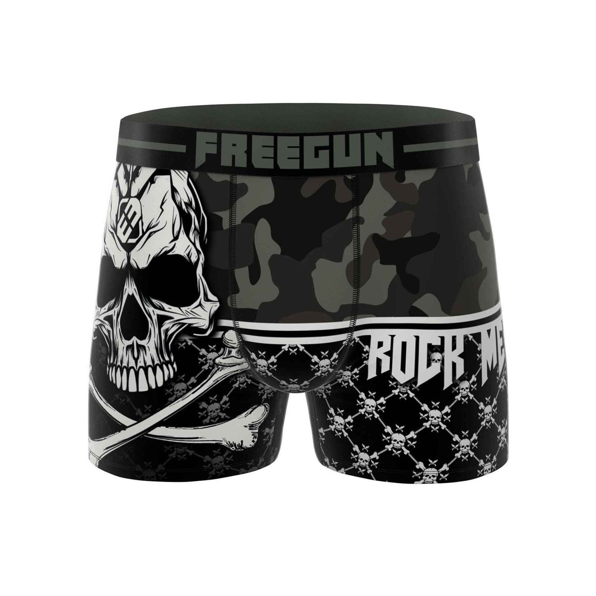 Boxershorts för män Freegun i mikrofiber som andas. Rock/punk-look (dödskalle, gitarr), elastisk midja, 4-vägsstretch, komfort och snabbtorkande. Storlekar S till XXL.