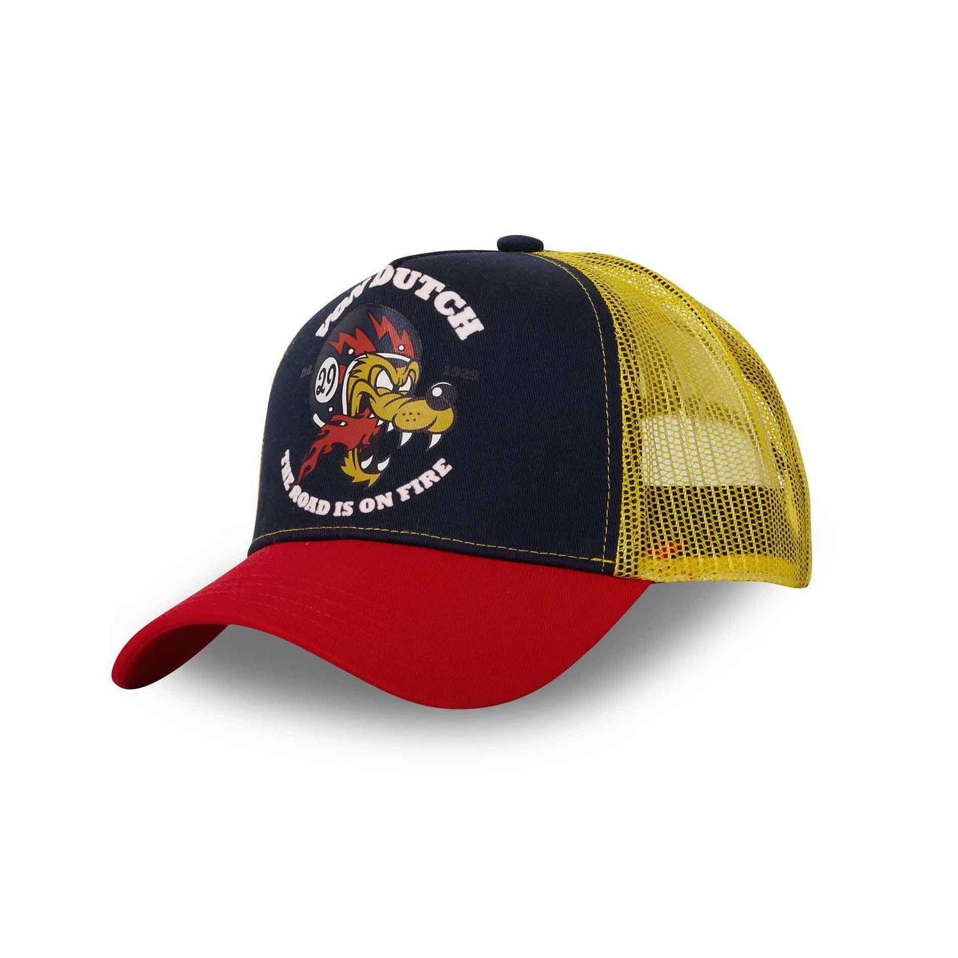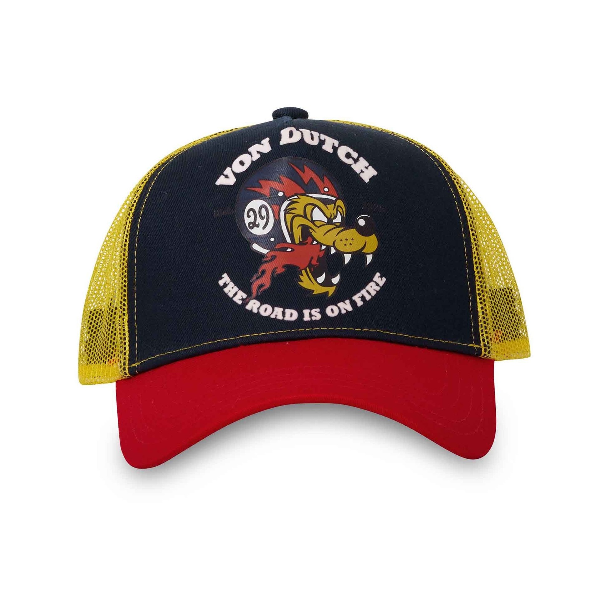 Den svarta och kamouflagefärgade mössan är broderad med en stor lapp "VON DUTCH AF29" med en varg ritad ovanpå.