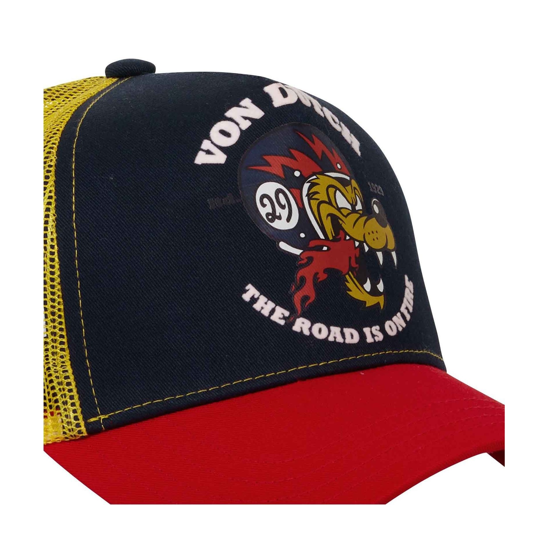 Logotypen Von Dutch är överlagrad på en broderad lapp av en varg med en vintagehjälm, glasögon och en cigarr i munnen.