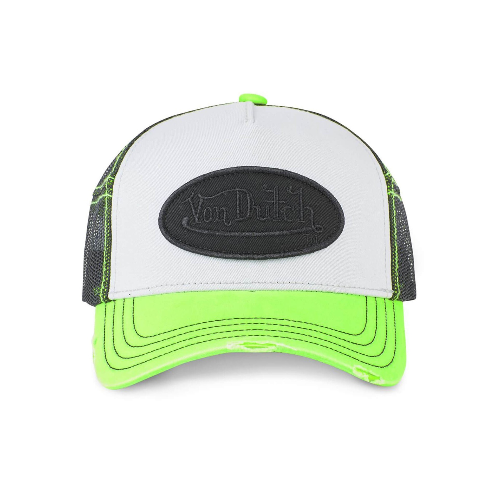 Mössa från märket Von Dutch, SUMMER-kollektionen, med en broderad platta med Von Dutch -logotypen på en vit botten. Finns i en rad olika färger, med en avsiktligt skadad visir effekt. 50% bomull 50% polyester