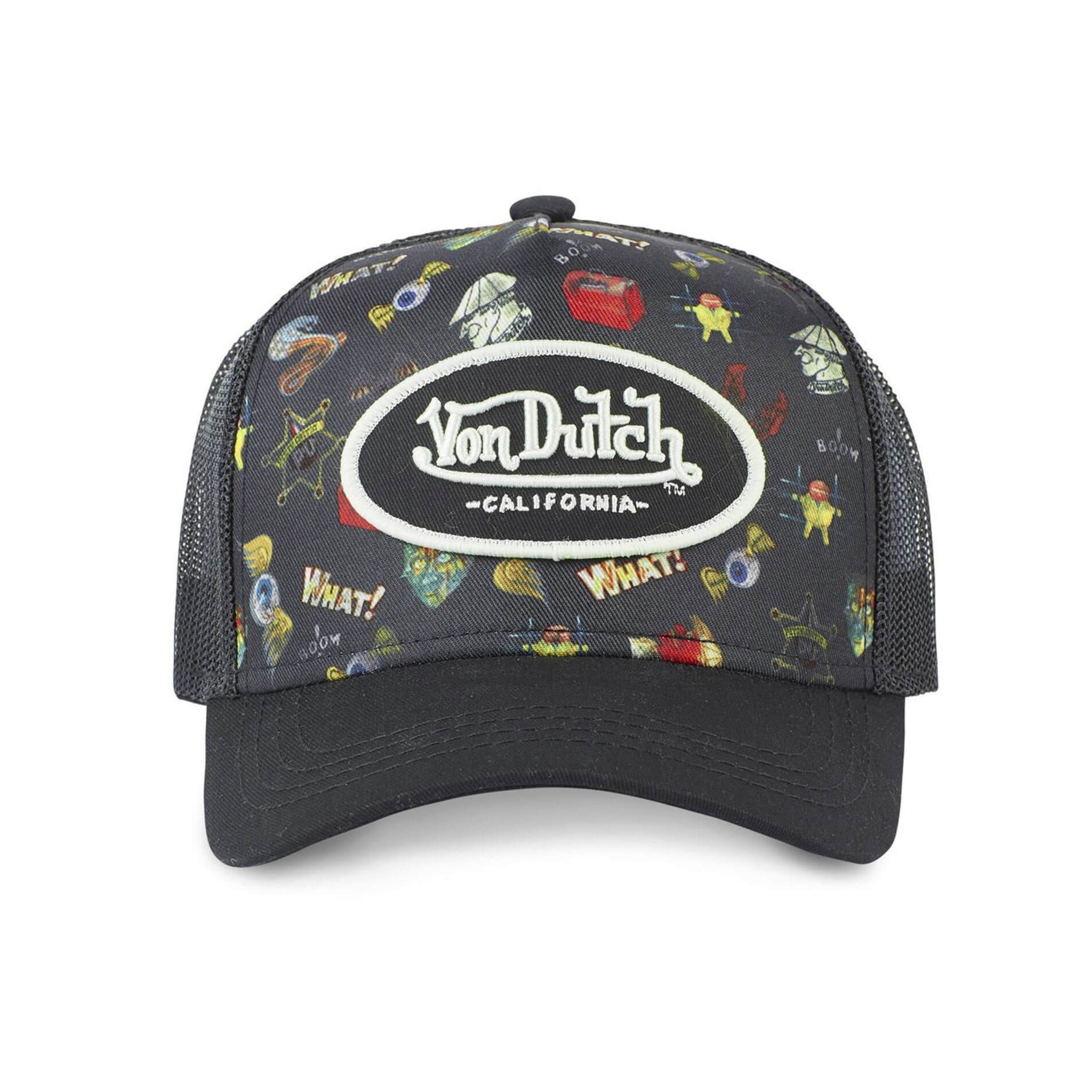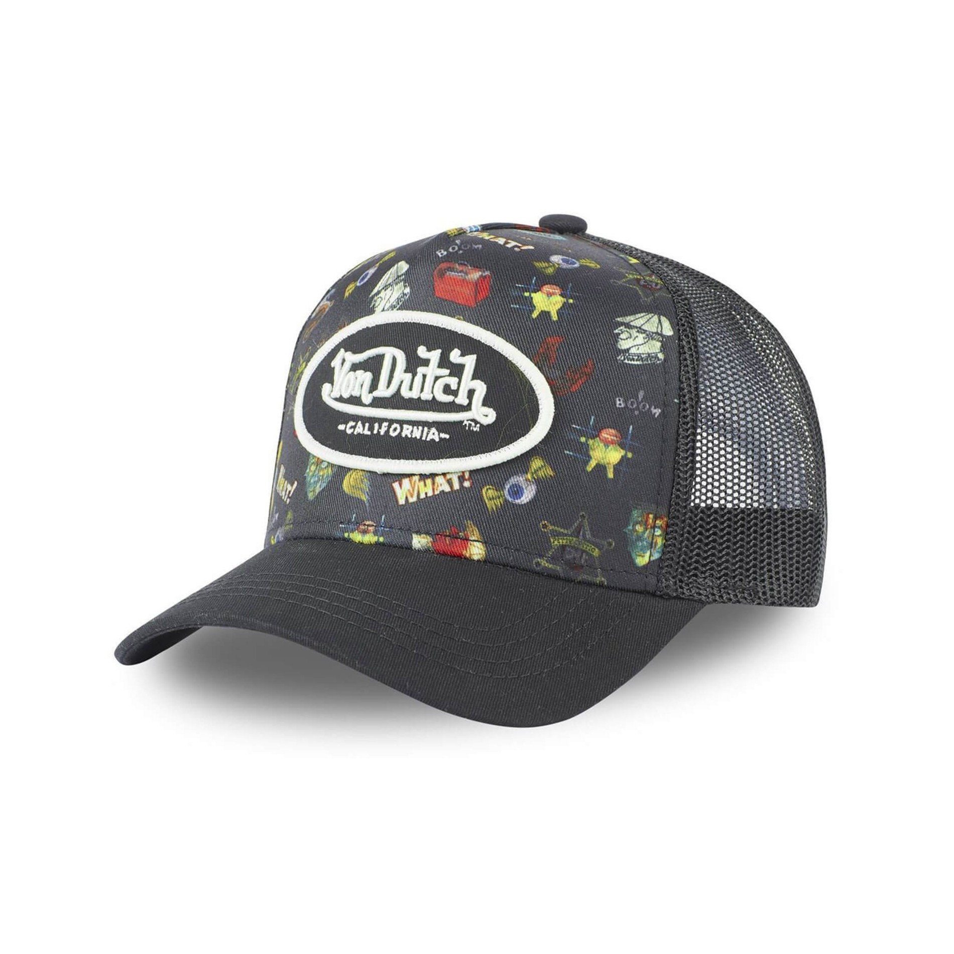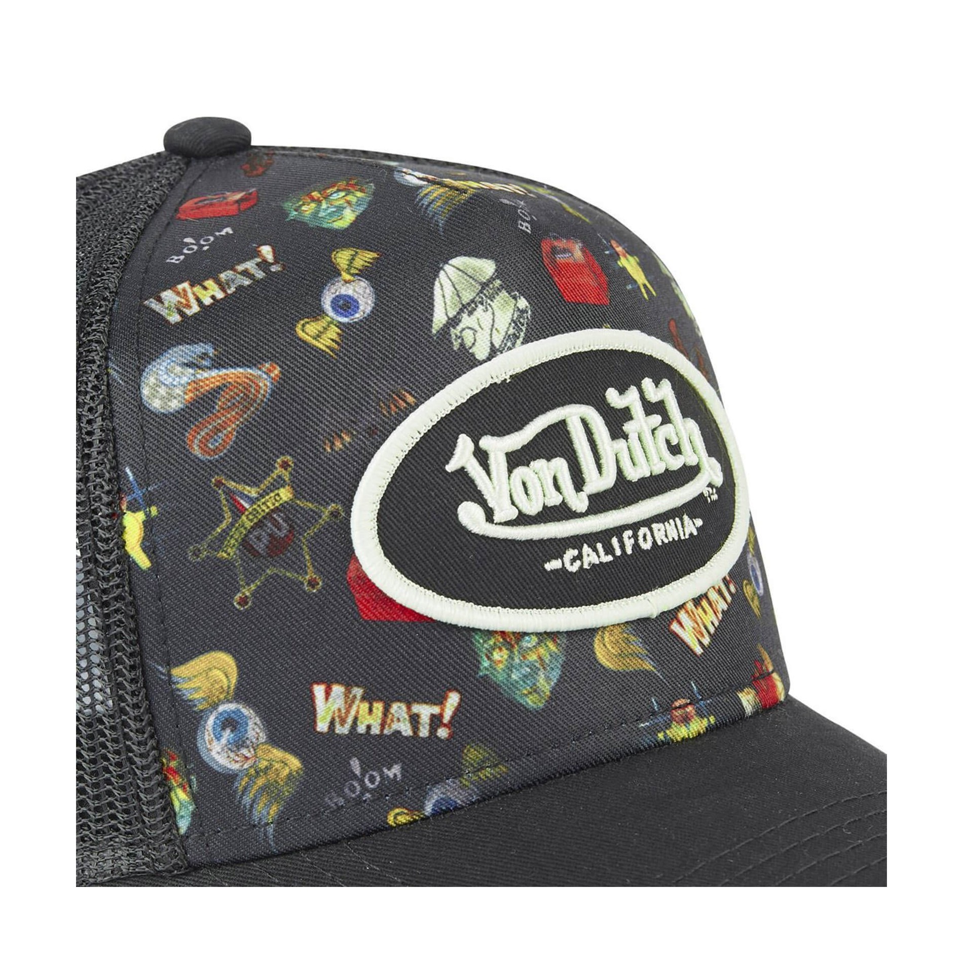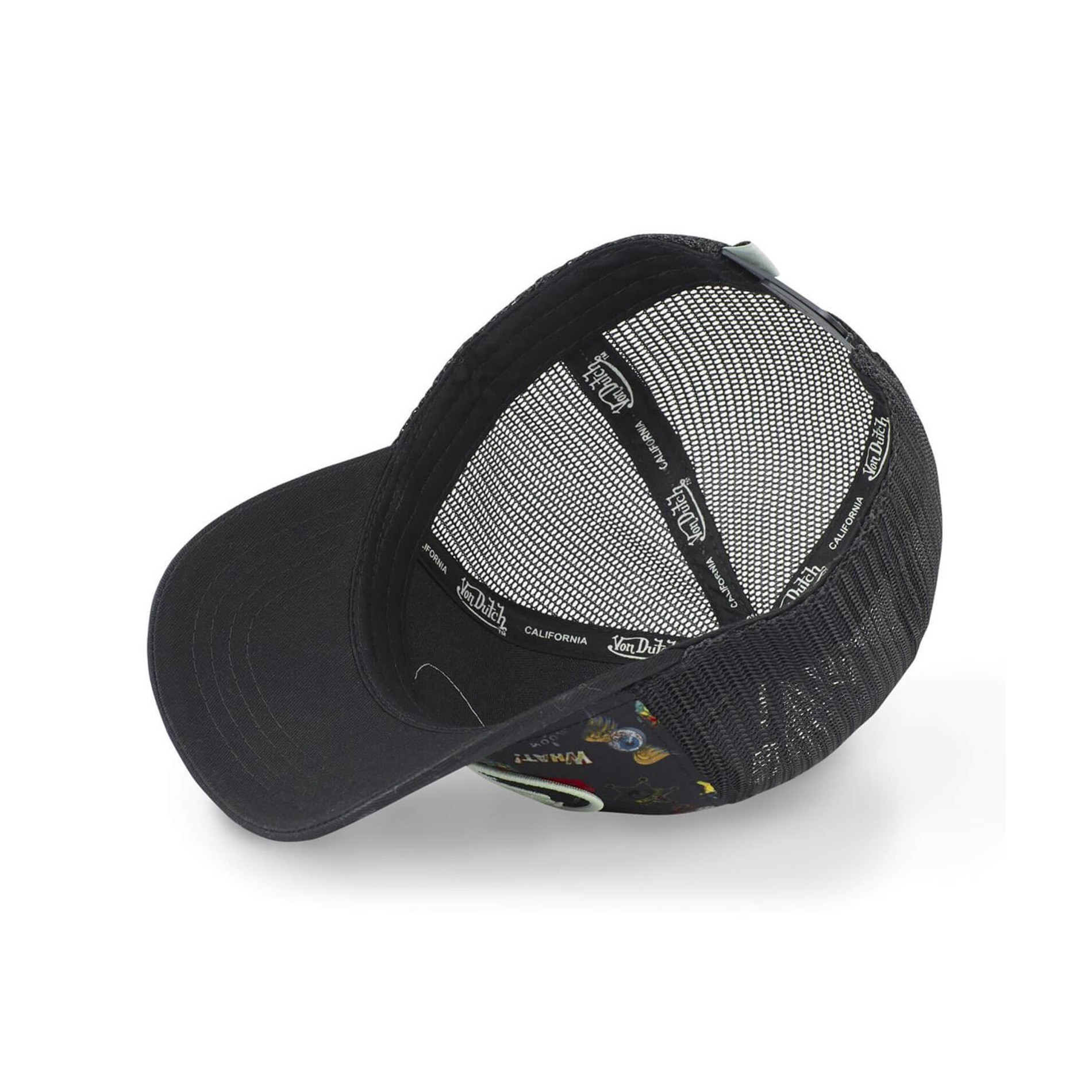 Trucker cap för män från Von Dutch, Tatoo-kollektionen, broderad patch Von Dutch och grafisk bakgrund.