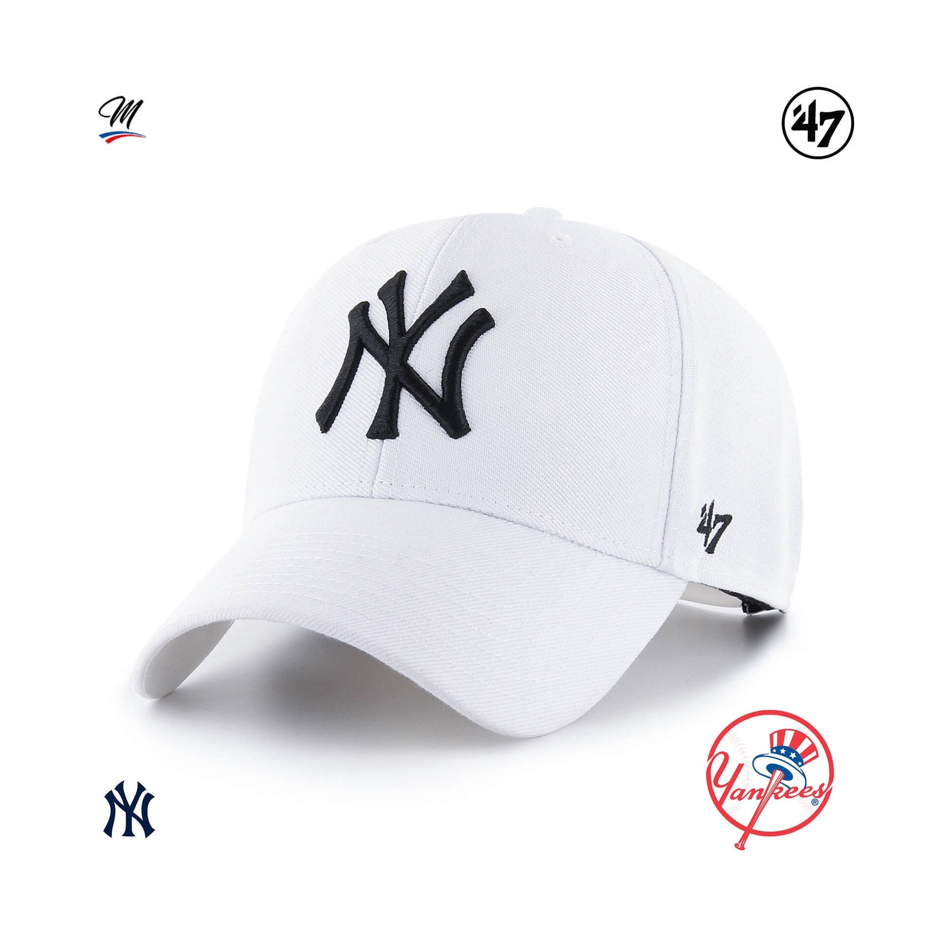 Den '47 MLB New York Yankees MVP Snapback Cap i vitt är en strukturerad, böjd basebollkeps med upphöjt broderi på framsidan, '47-broderi på sidan och snapback-knäppning på baksidan.
