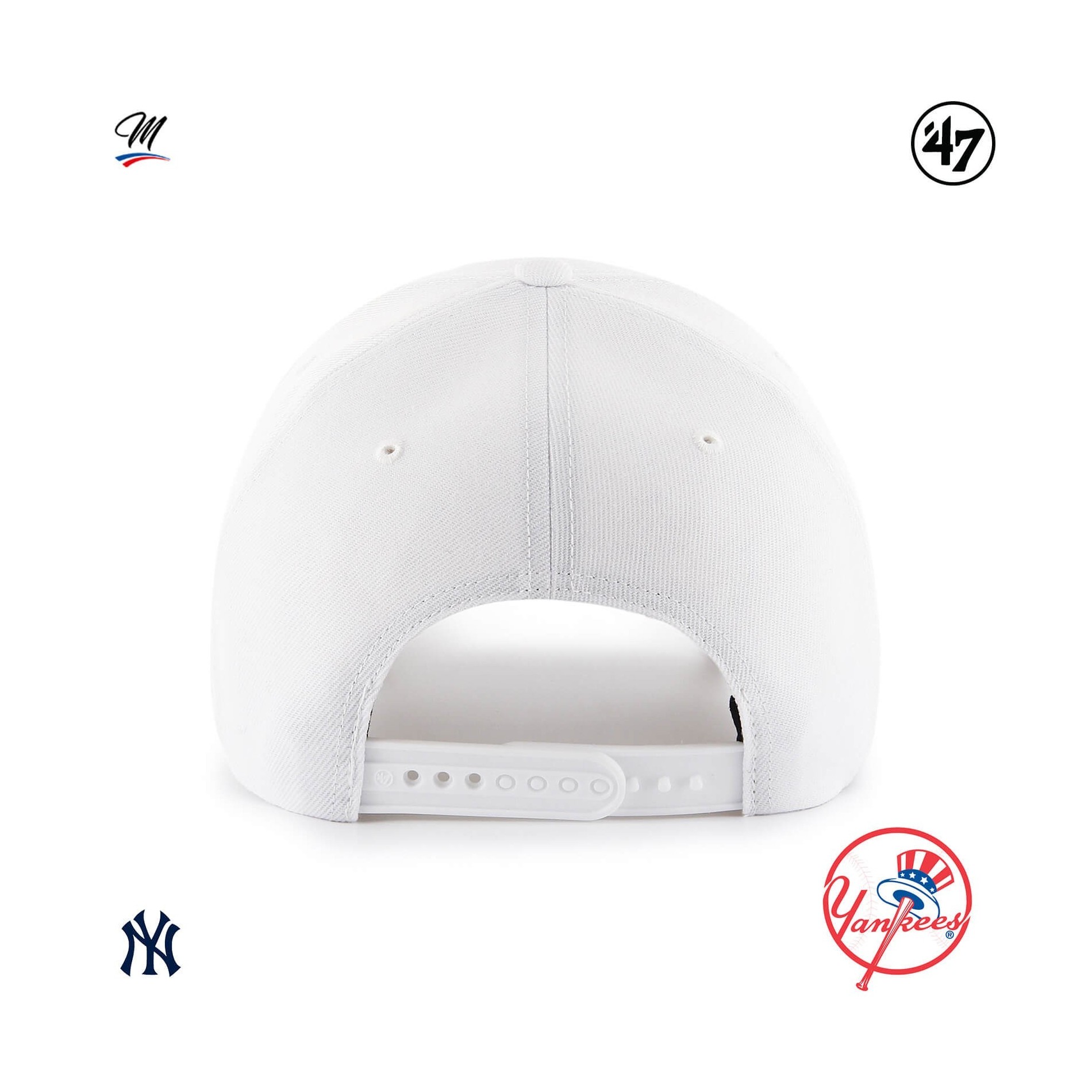 Den '47 MLB New York Yankees MVP Snapback Cap i vitt är en strukturerad, böjd basebollkeps med präglat broderi på framsidan, '47-broderi på sidan och snapback-knäppning på baksidan.