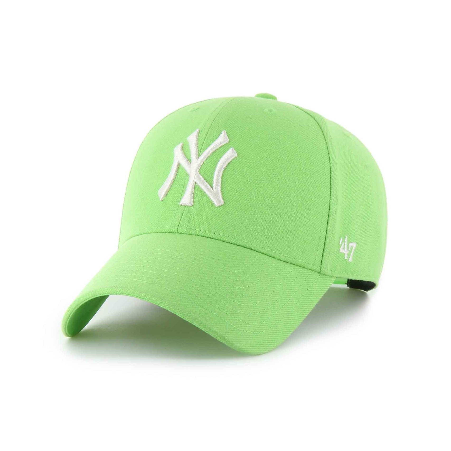 Den '47 MLB New York Yankees MVP Snapback Cap i grönt är en strukturerad, böjd basebollkeps med upphöjt broderi på framsidan, '47-broderi på sidan och snapback-knäppning på baksidan.