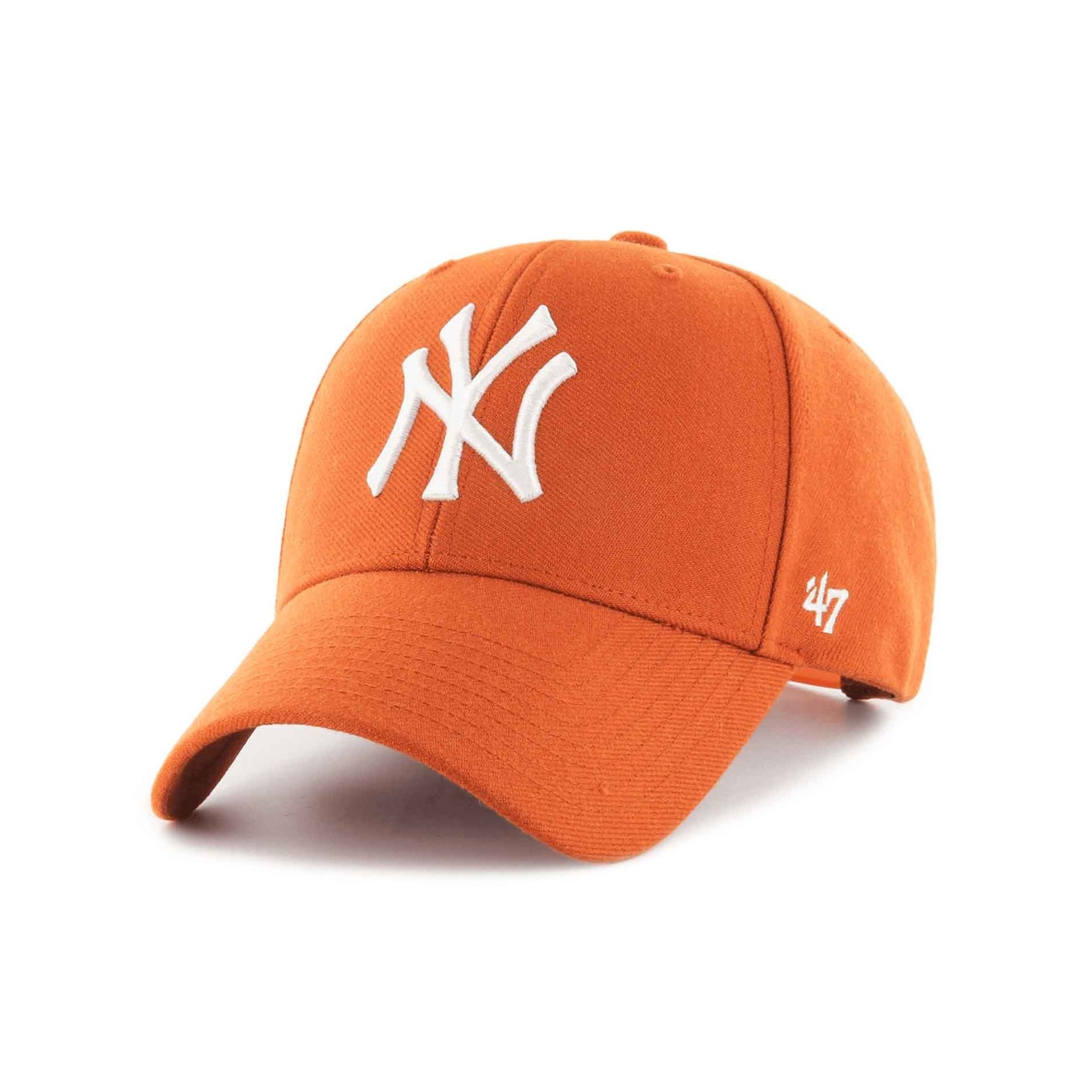 Den '47 MLB New York Yankees MVP Snapback Cap i orange är en strukturerad, böjd basebollkeps med upphöjt broderi på framsidan, '47-broderi på sidan och snapback-knäppning på baksidan.