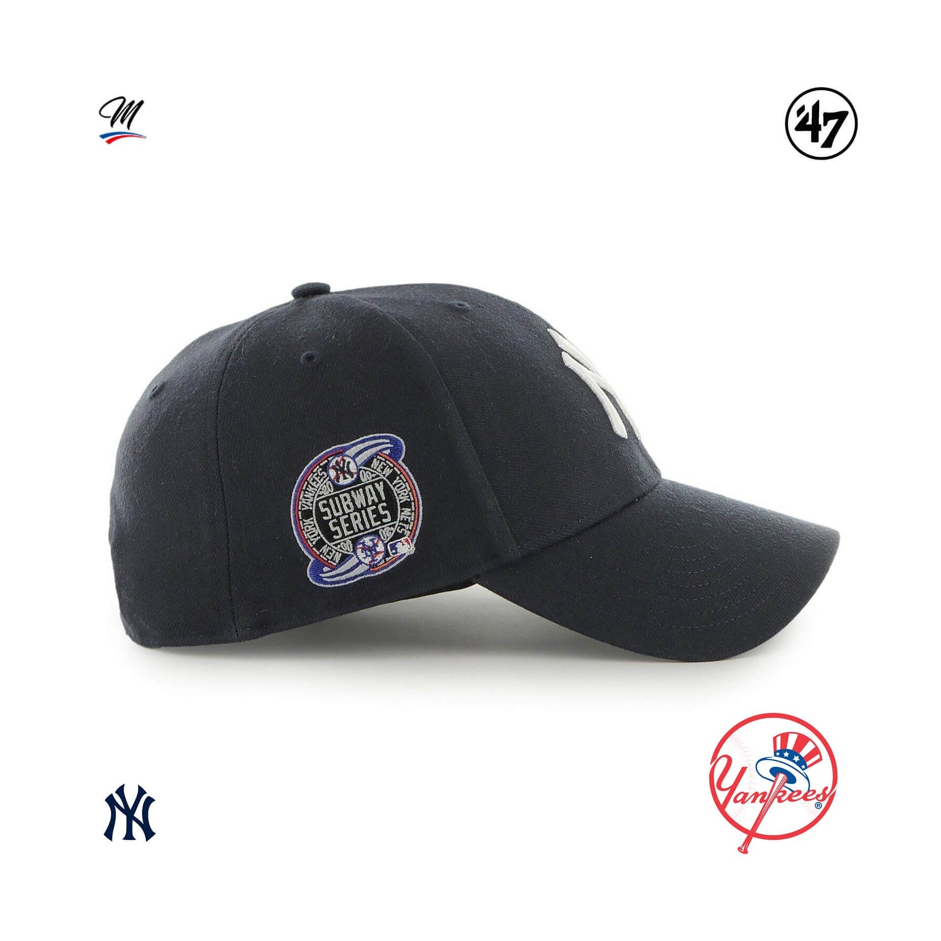 Den '47 MVP New York Yankees Sure Shot Snapback MLB World Series 2000 keps är en strukturerad, böjd basebollkeps med upphöjt broderi på framsidan och '47 broderi på sidan.