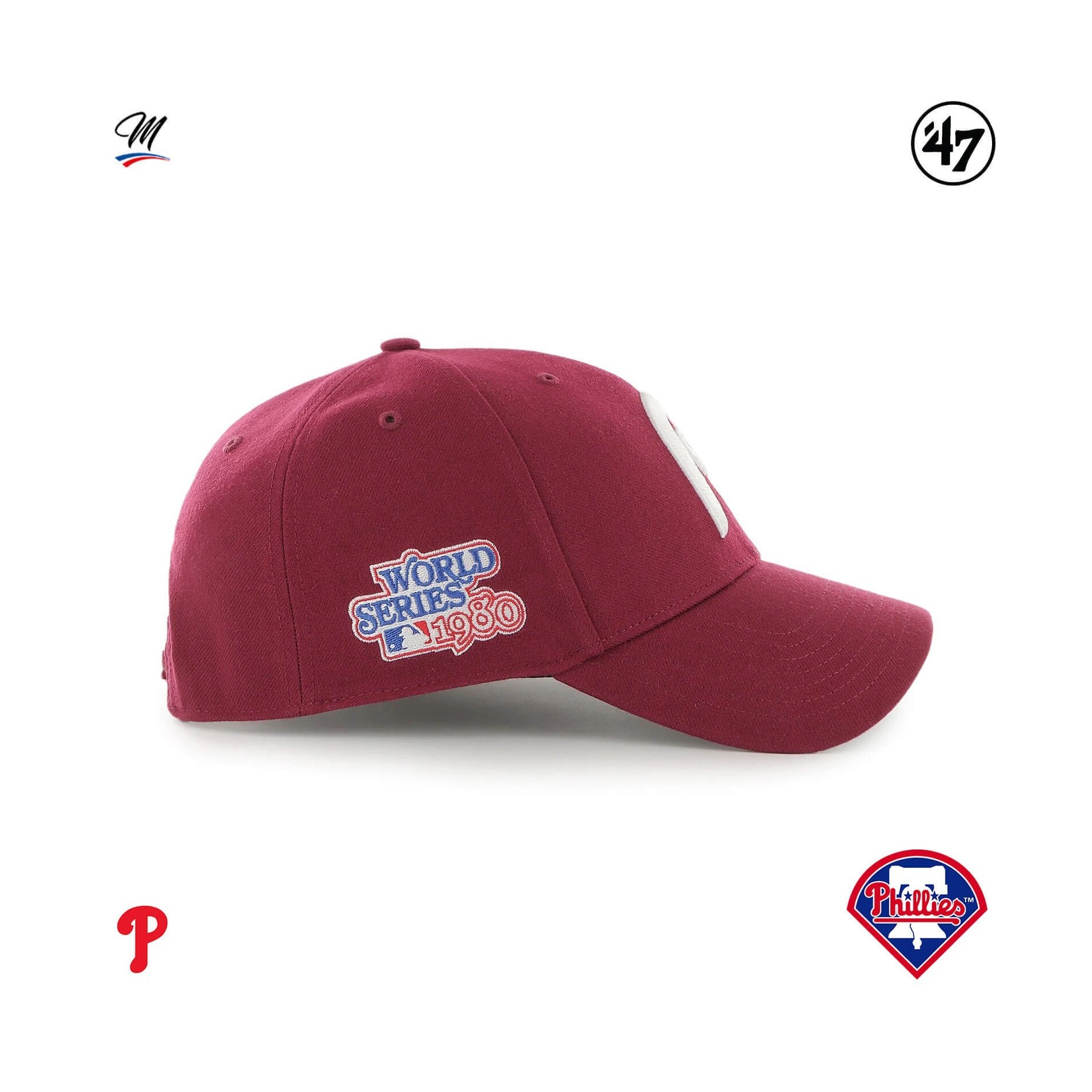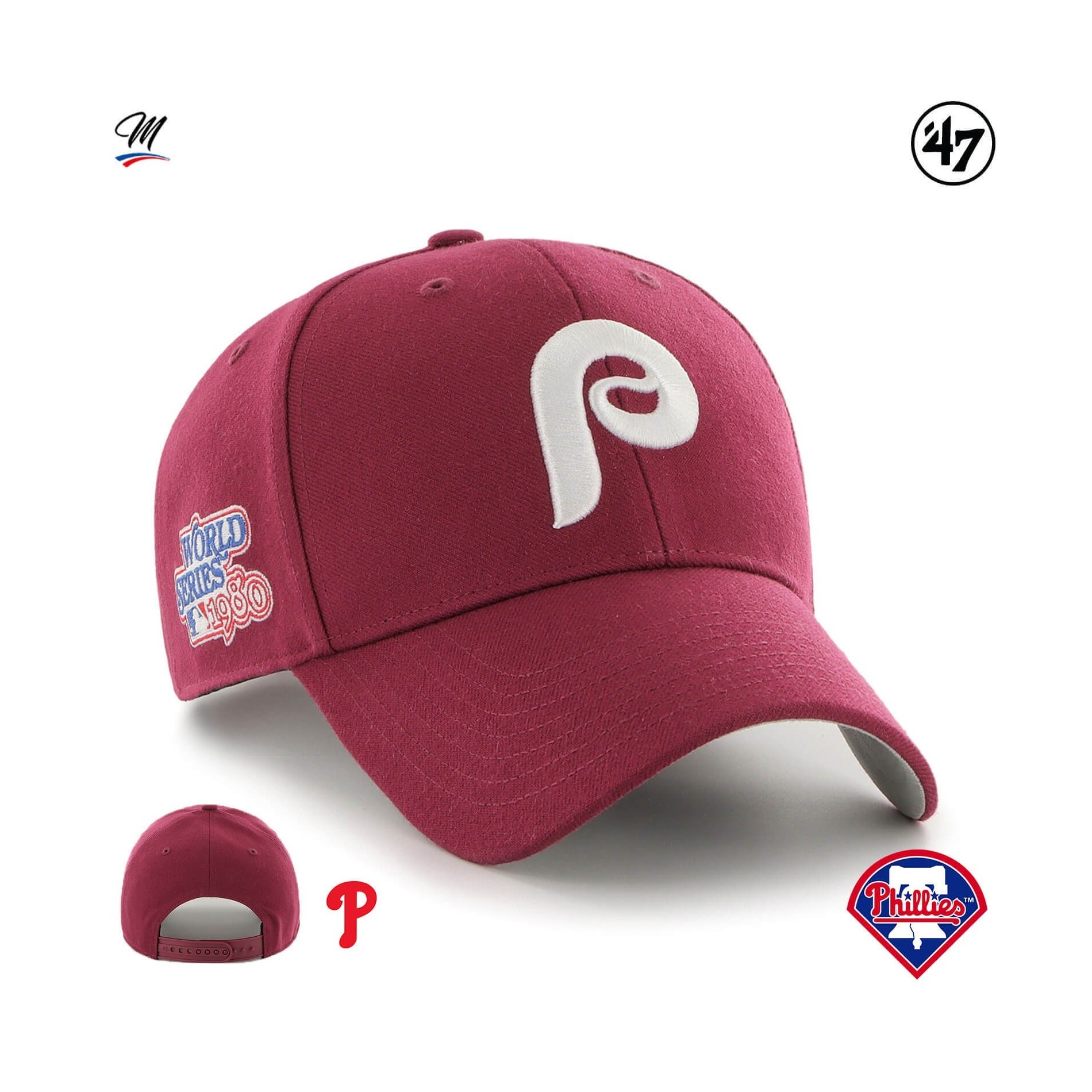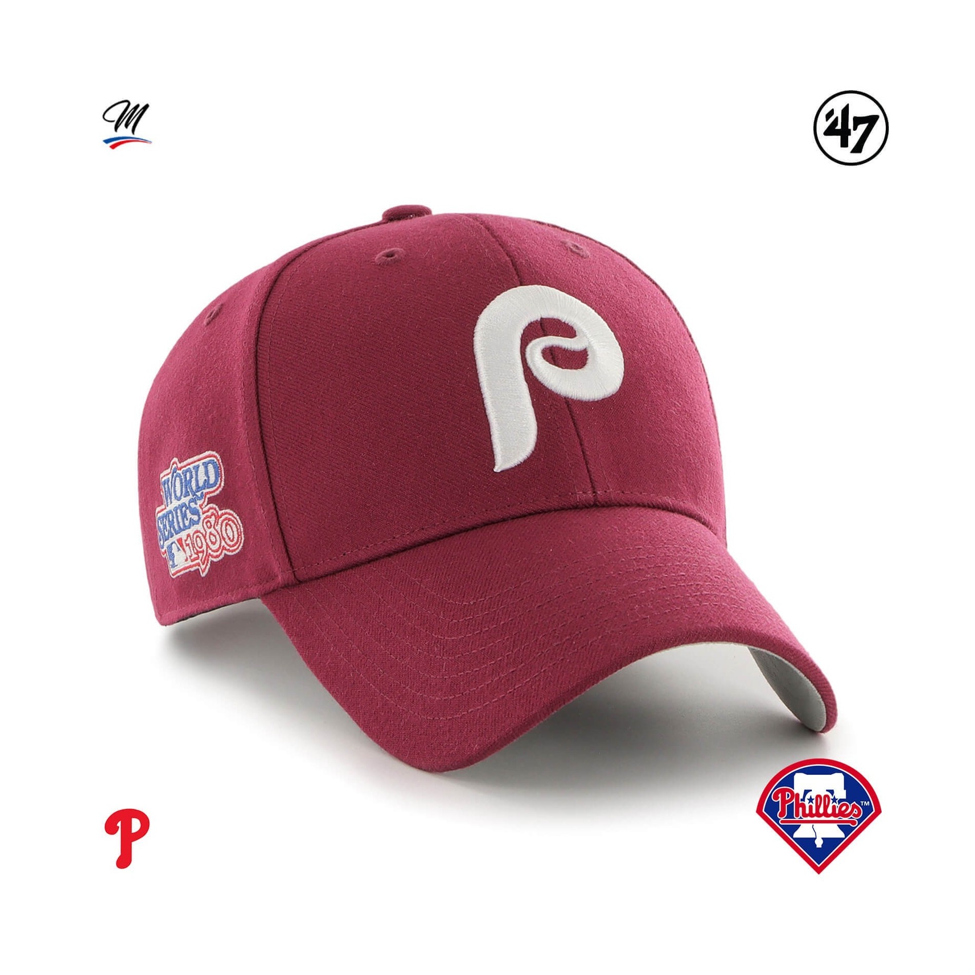 MVP Philadelphia Phillies Sure Shot Snapback MLB World Series 1980 keps '47 MVP Philadelphia Phillies Sure Shot Snapback MLB World Series 1980 keps är en strukturerad, böjd basebollkeps med upphöjt broderi på framsidan och '47 broderi på sidan.
