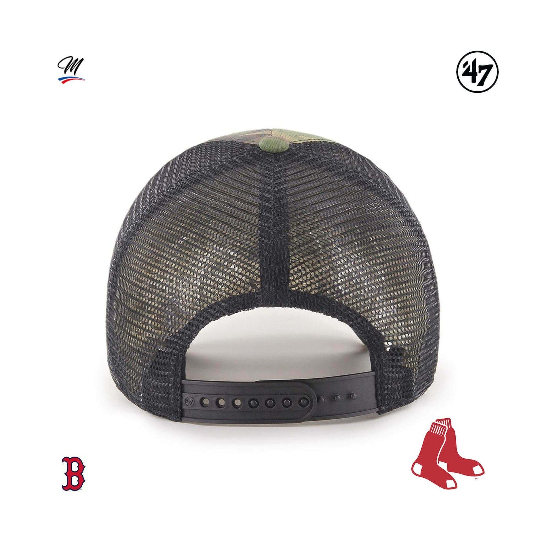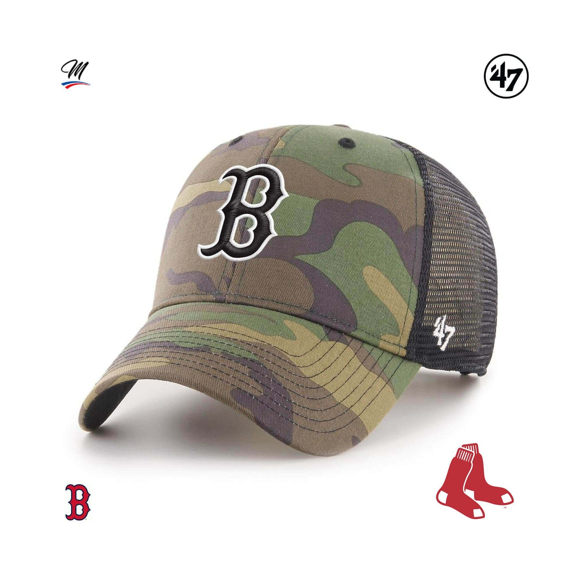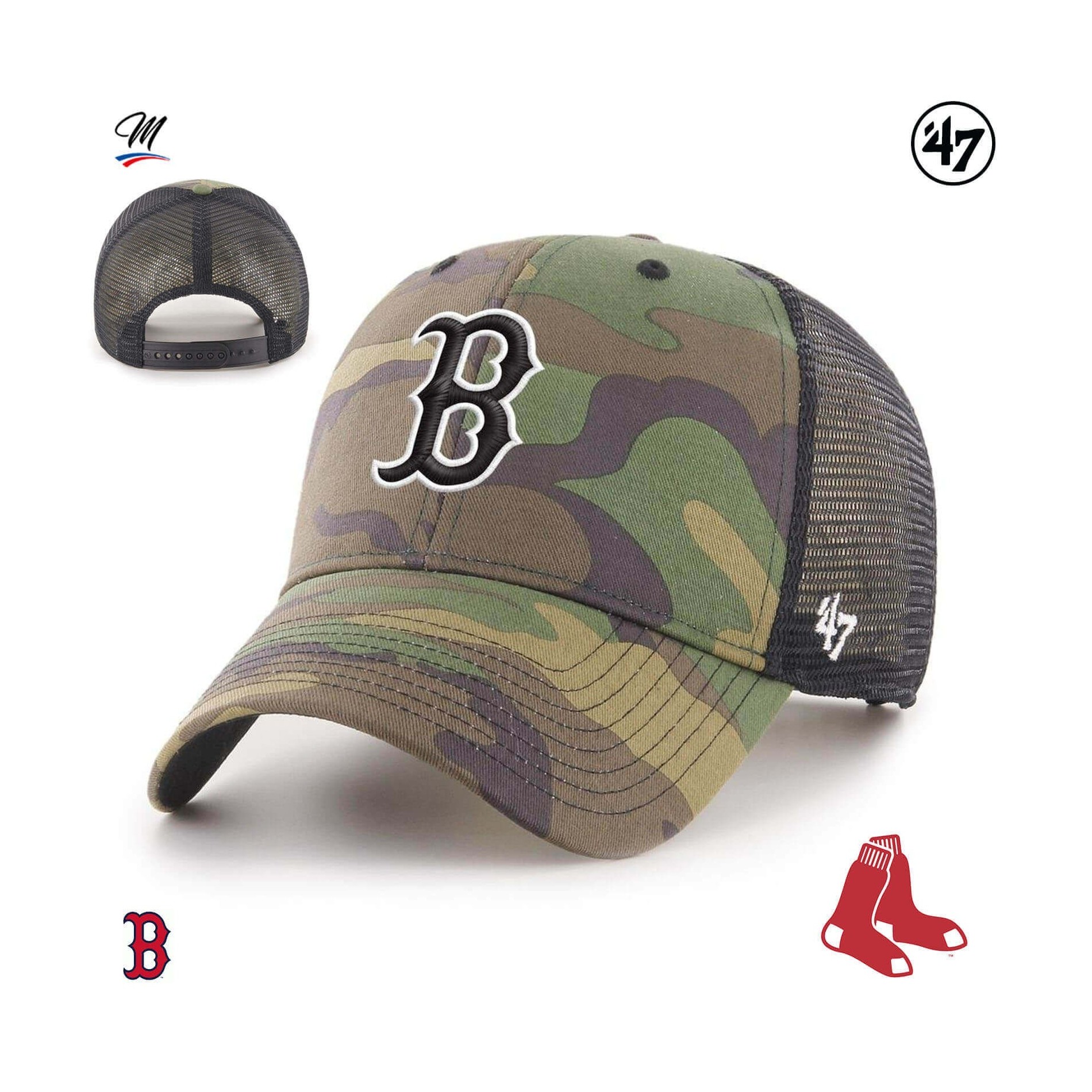 Branson '47 MVP Boston Red Sox Cap är en kamouflage, strukturerad, böjd baseball Trucker cap med upphöjt broderi på framsidan och '47 broderi på sidan.