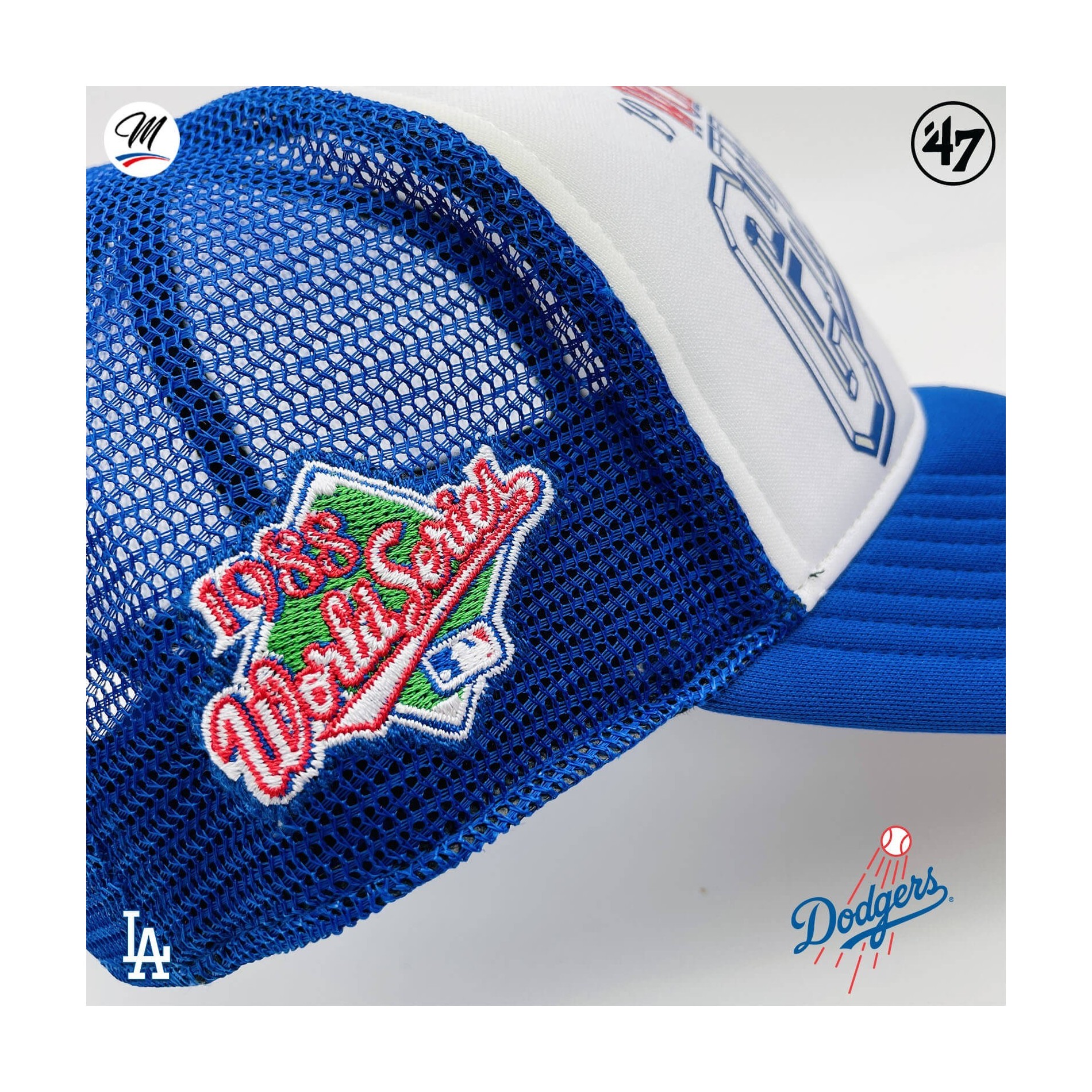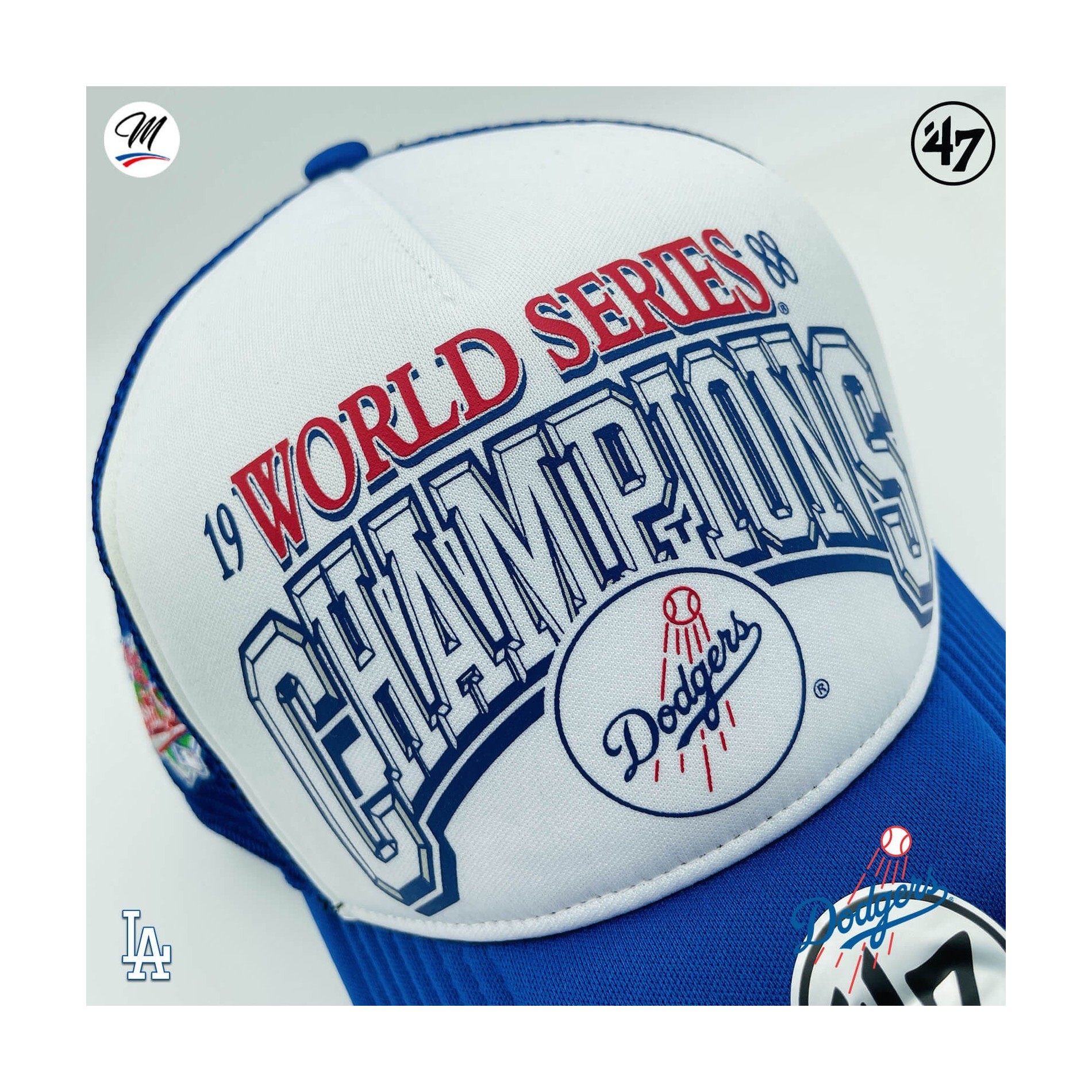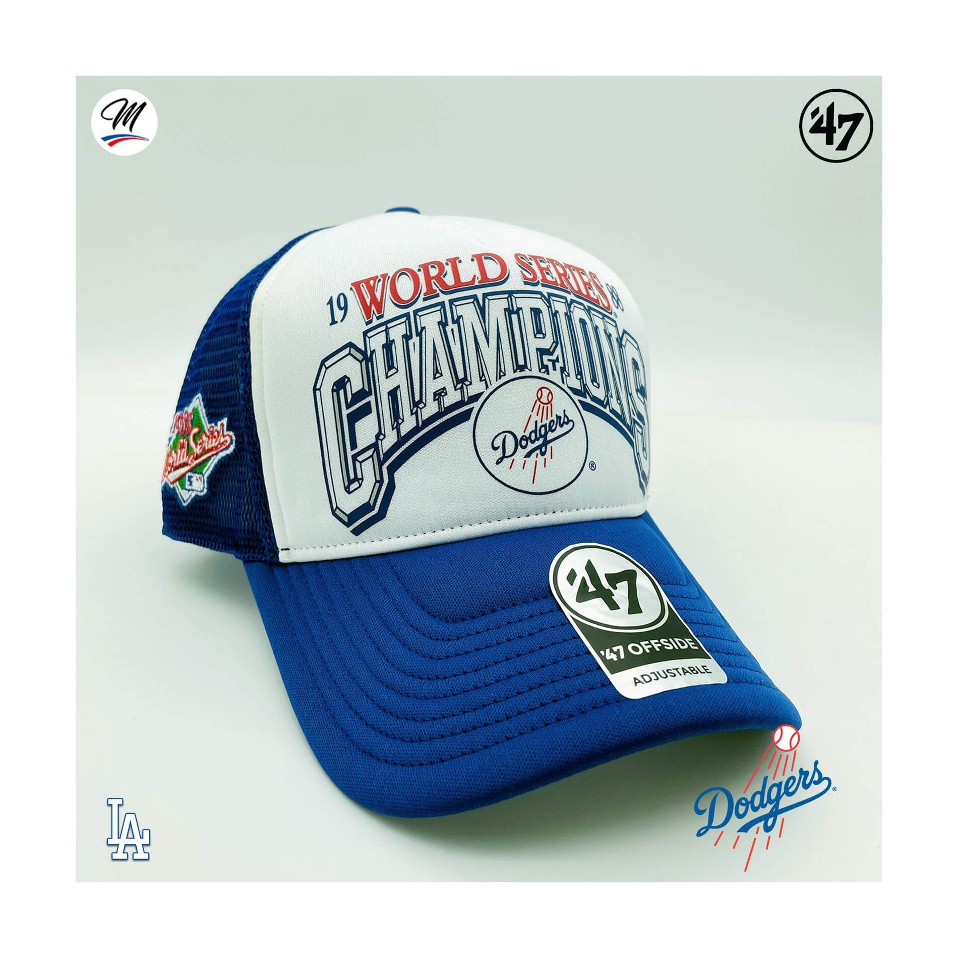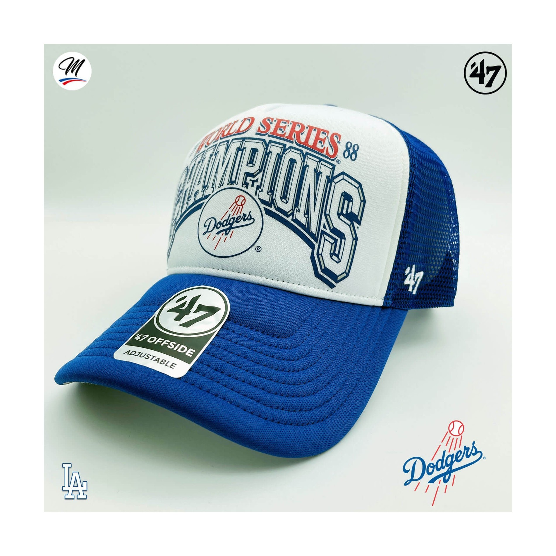 Los Angeles Dodgers '47 MVP"Foam '47 Offside DT" Cap är en böjd, strukturerad skumbasebollkeps med en tryckt "1988 World Series Champion's"-logotyp på framsidan, en broderad flagga på sidan och en annan '47-broderi på andra sidan, en snapback-knäppning på baksidan.