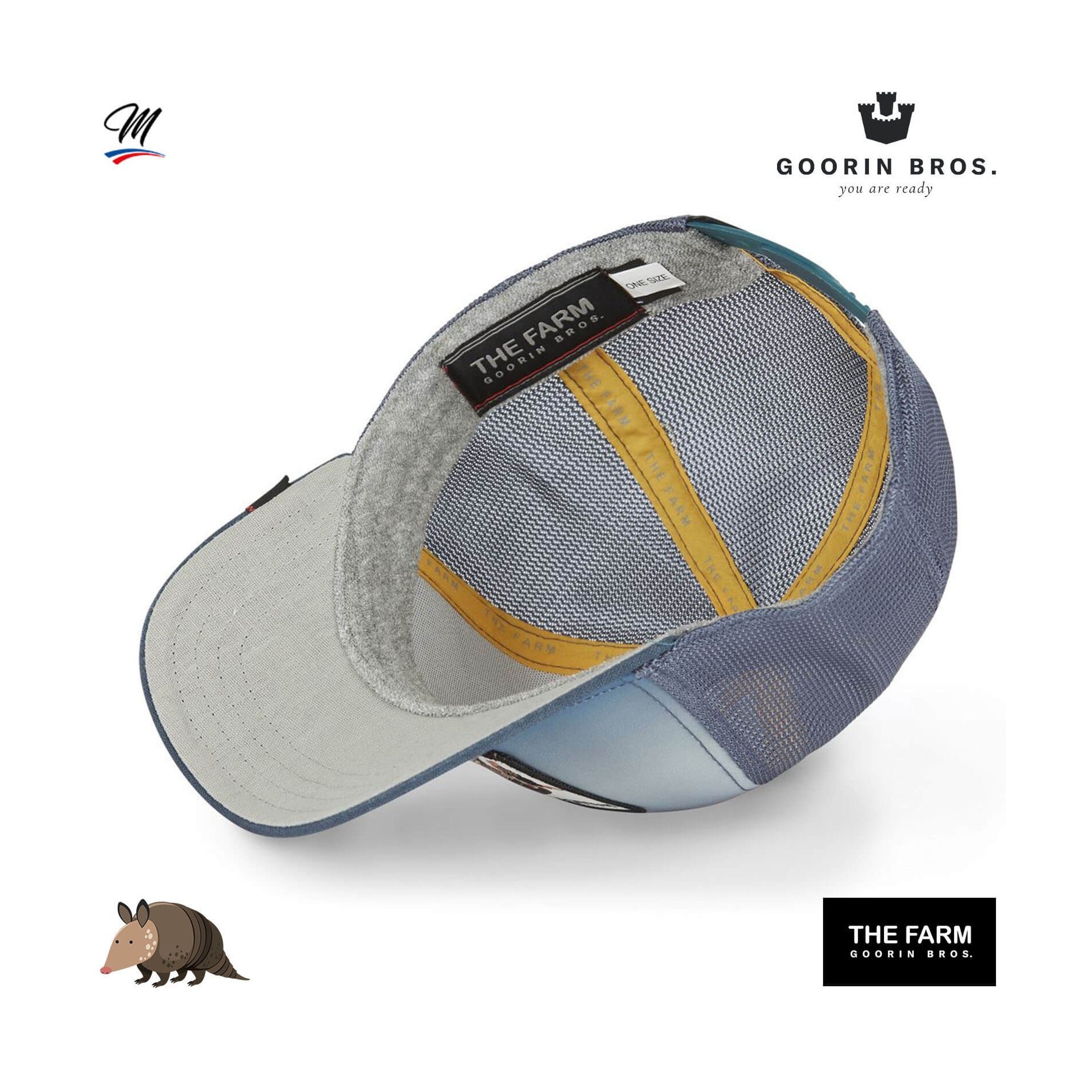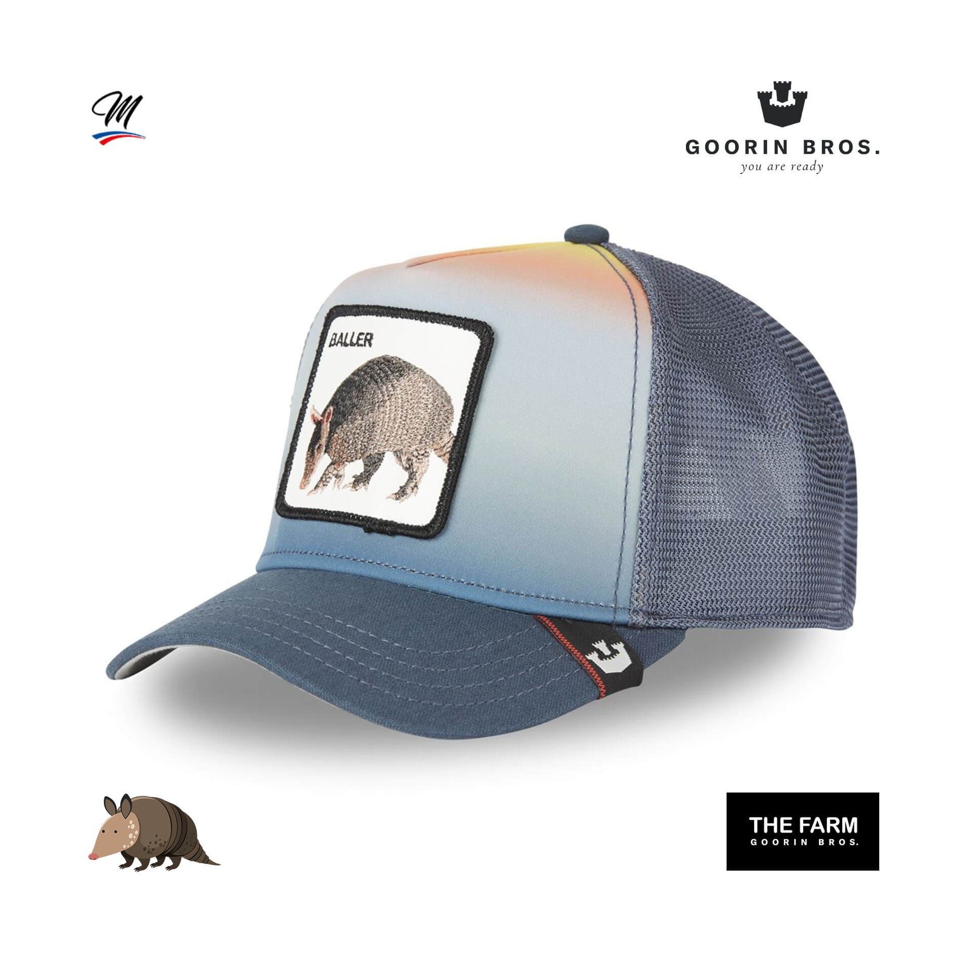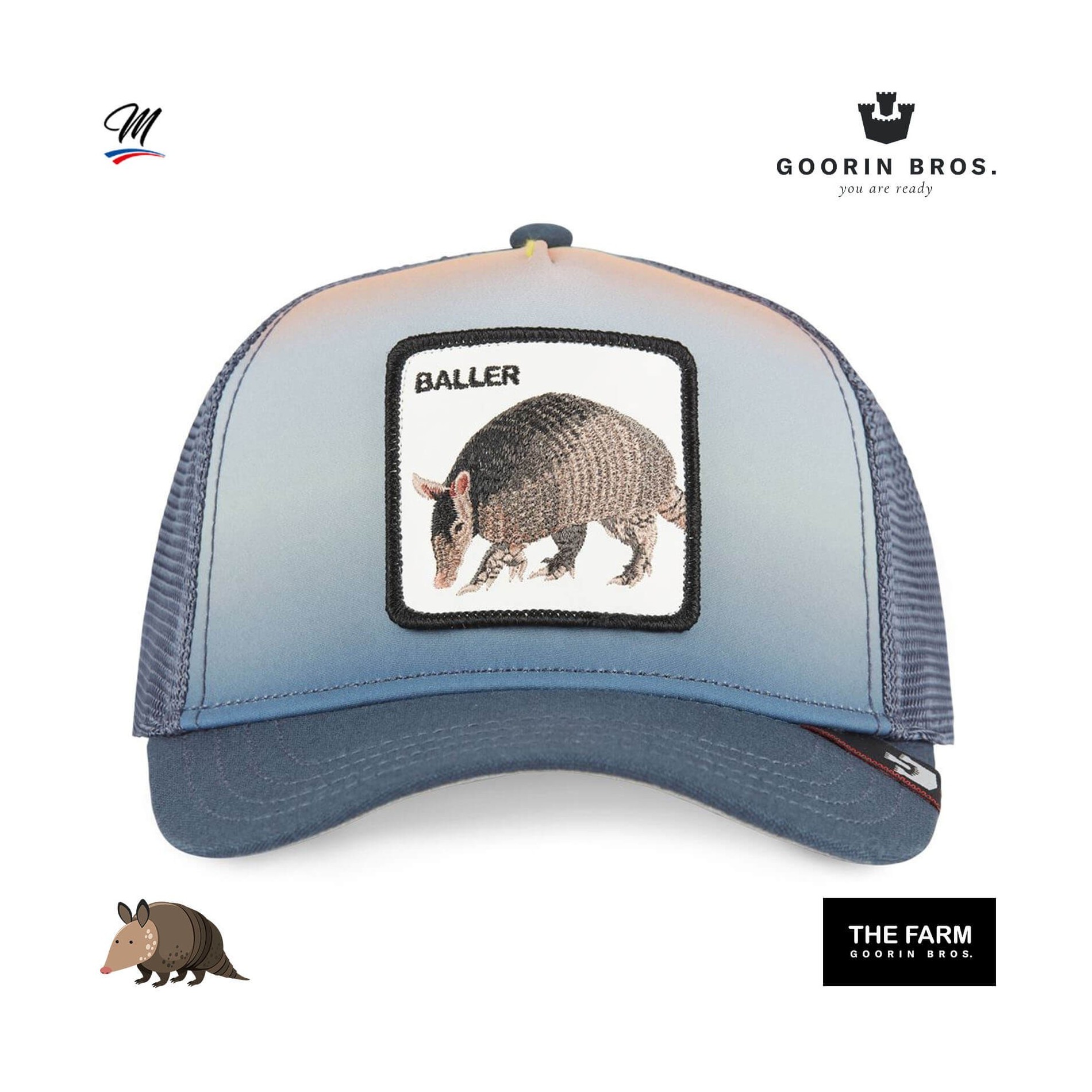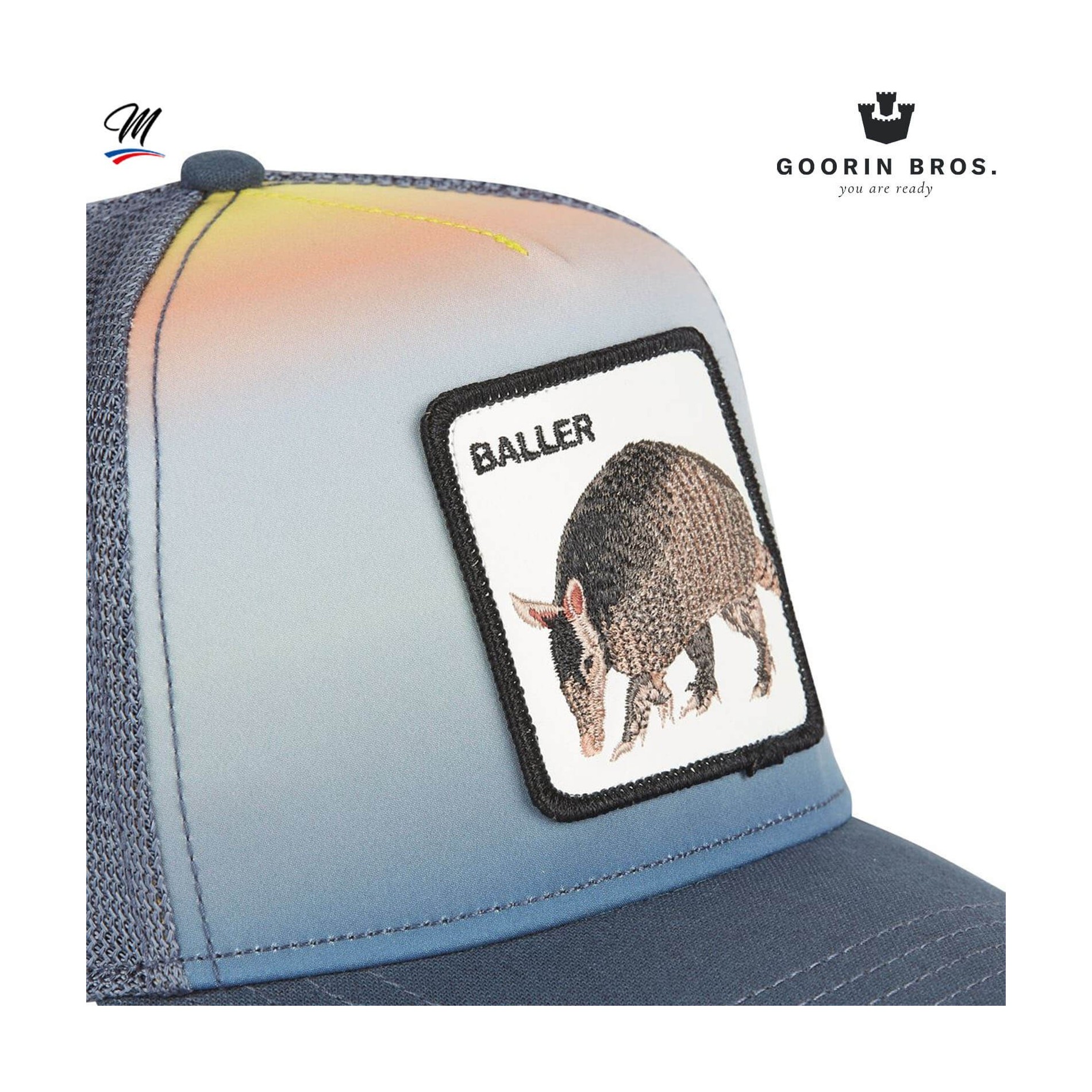 Autentiska GOORIN BROS Baseball Trucker Cap med mesh, broderad bältdjurspatch och "BALLER" inskription.